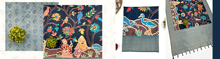 A vibrant collection of Banarasi silk jacquard sarees adorned with artistic digital prints — from florals to figurines. Rangmayi celebrates rich colors, cultural charm, and timeless elegance in every drape.