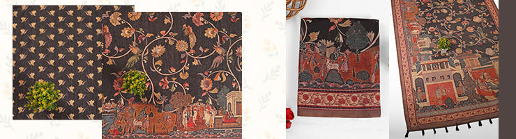 Kalamkari Artistry – hand-drawn floral motifs entwined with storytelling figures inspired by mythology and culture.