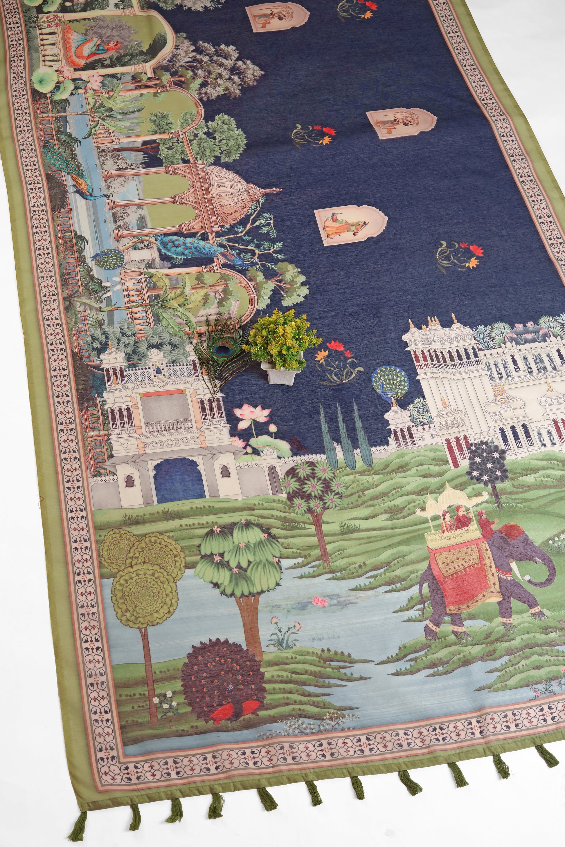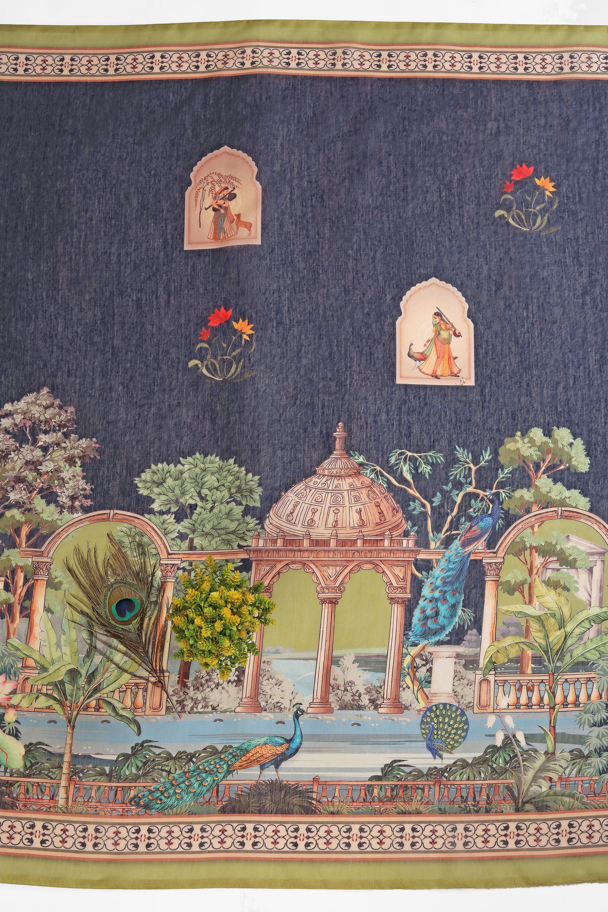 Step into the serene opulence of Baagh Mahal, a Kalamkari designer saree that captures the grandeur of royal courtyards and palatial gardens. Adorned with intricate depictions of flora, architecture, and regal life against a midnight navy canvas, this piece is a tribute to India's rich heritage. Timeless and elegant, it’s where tradition meets majesty — perfect for statement occasions.
