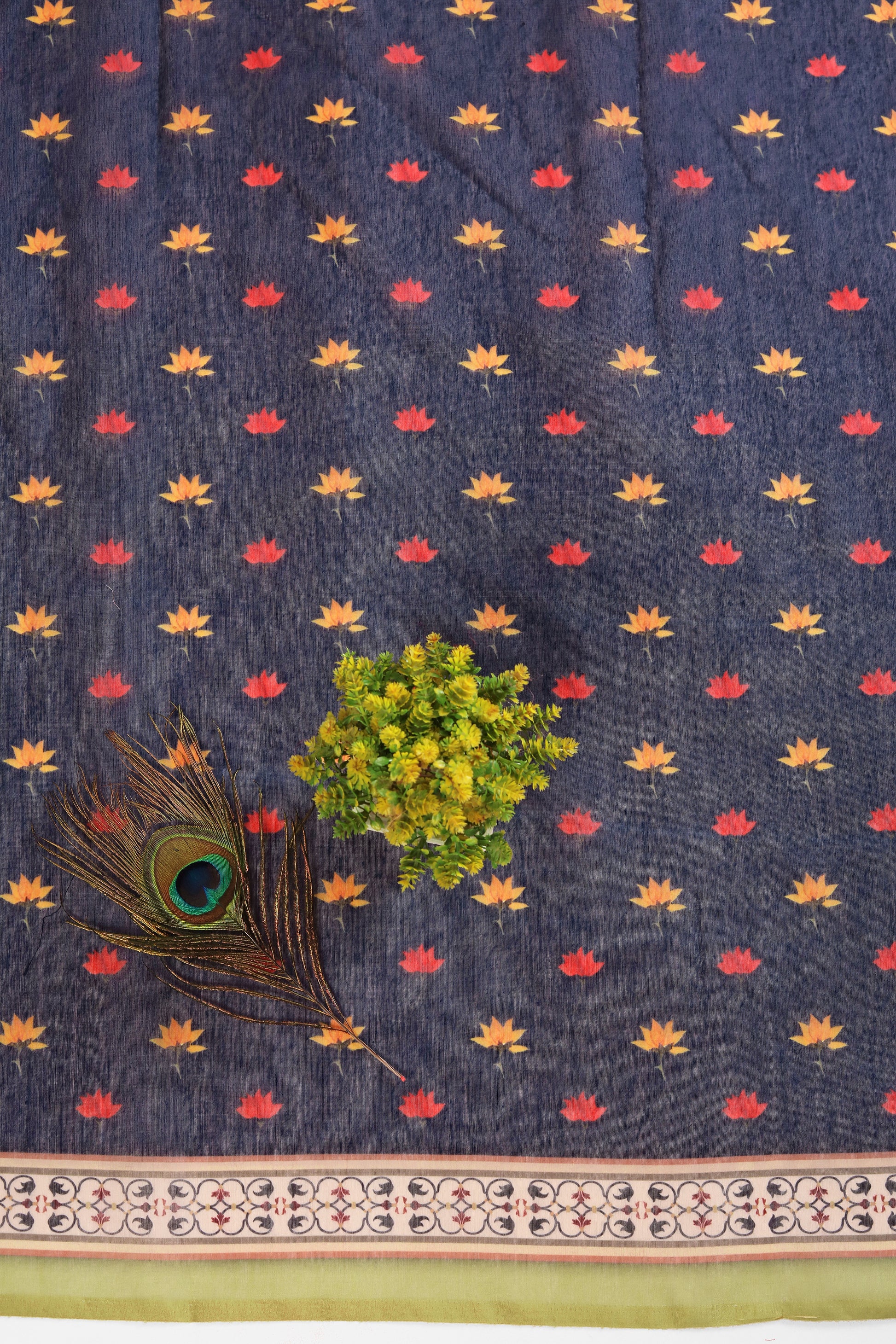 This saree is truly elegant – the rich green base with golden zari weaving gives it a classy and traditional touch, while the contrasting pallu with beautiful prints of peacocks, flowers, and motifs adds a unique modern charm. A perfect blend of grace and style, suitable for festive as well as special occasions.
