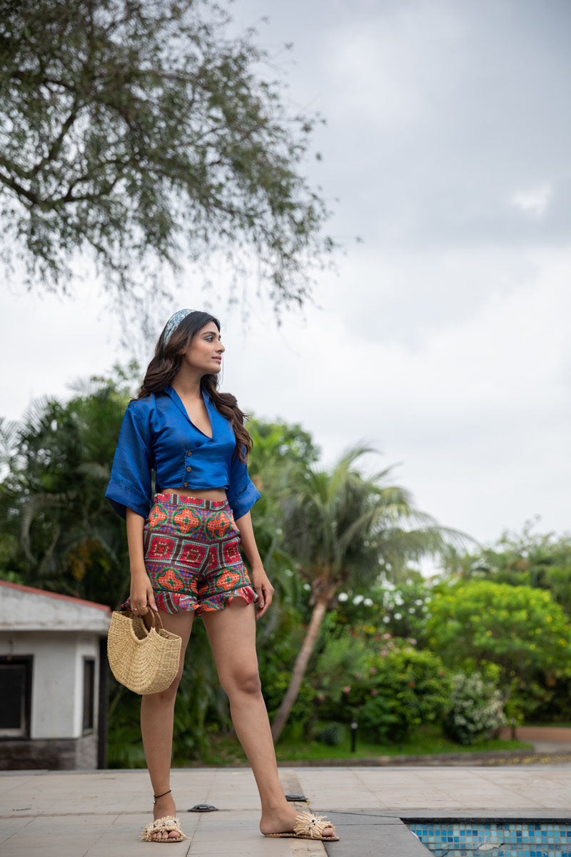 • Trendy overlap buttoned crop top with drop shoulders, paired with short pants featuring playful frill detailing