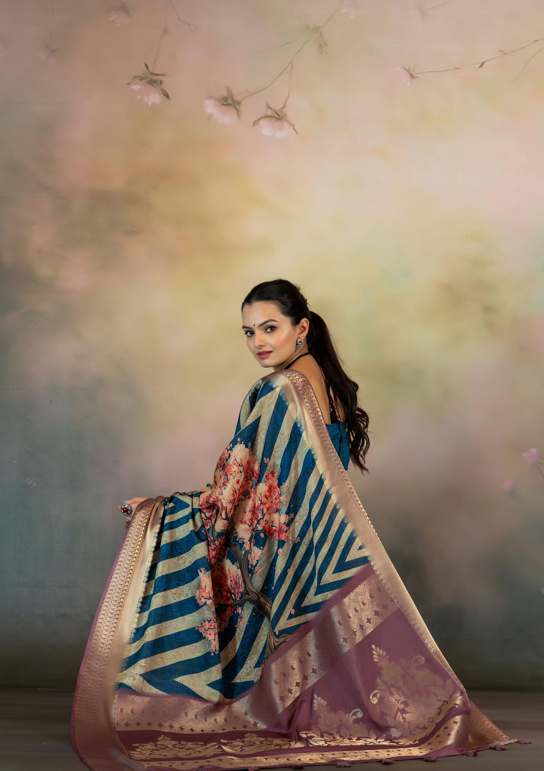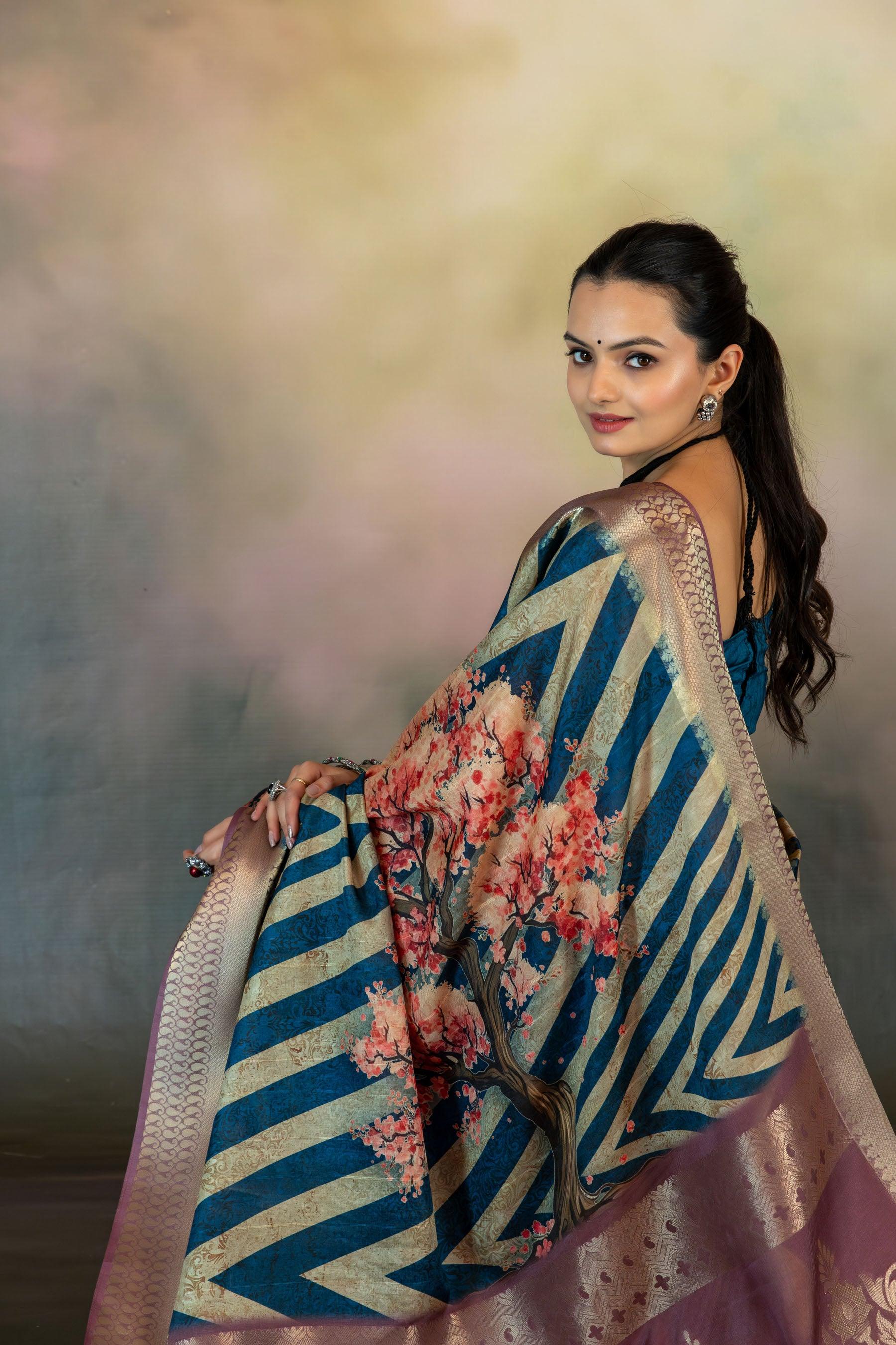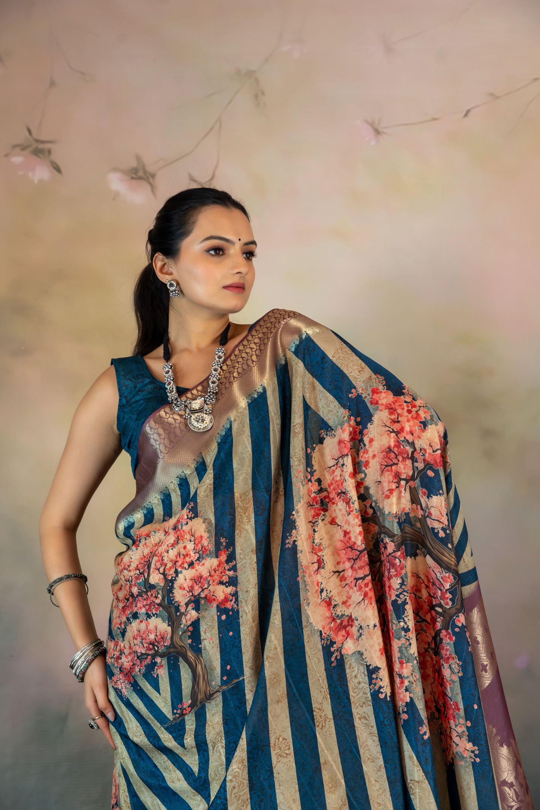 Cherry Blossom Tree Print Jacquard Saree