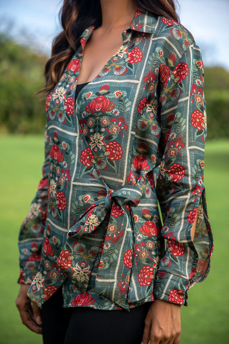 • Chic overlapping top with shirt collars and a belt for a sophisticated touch