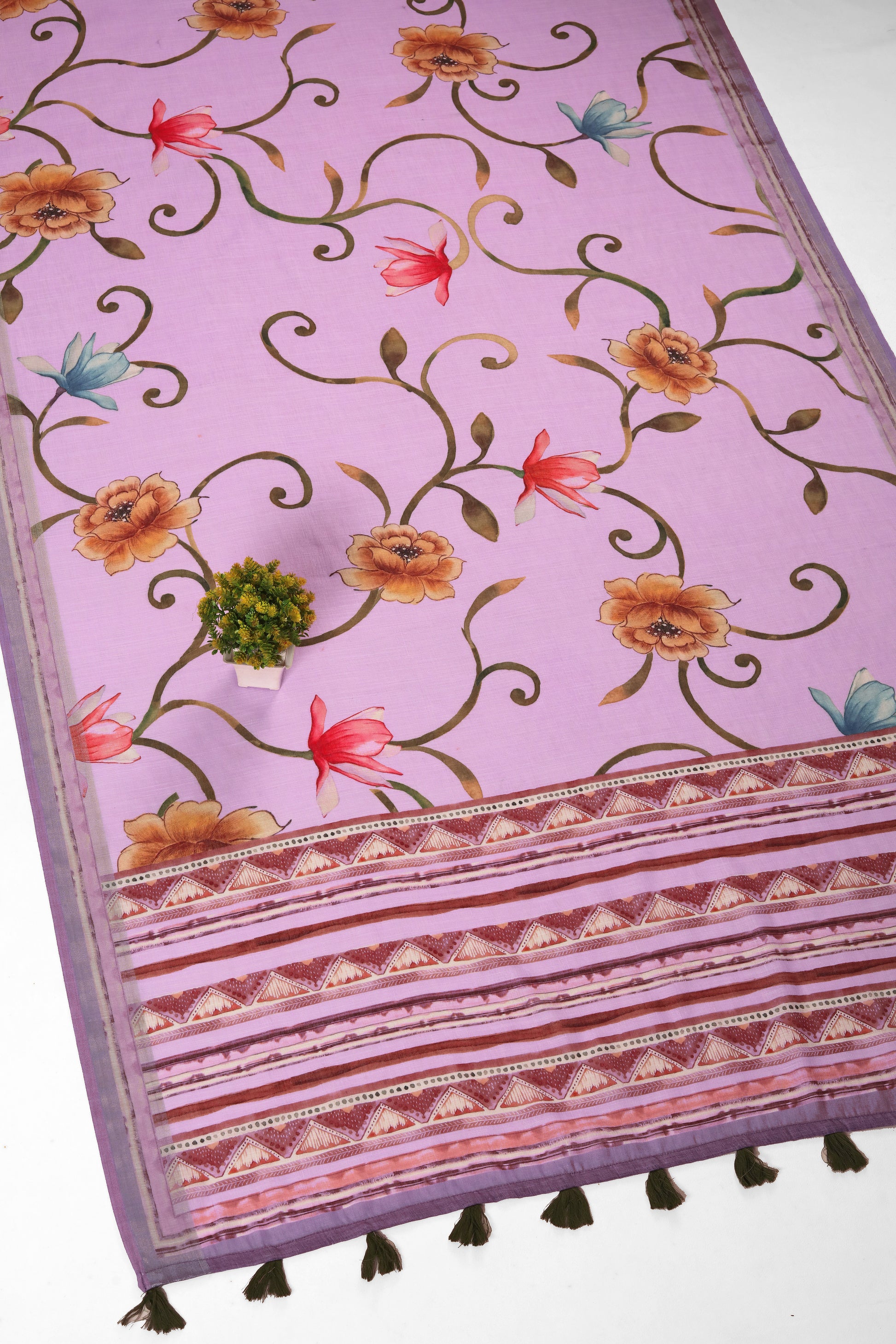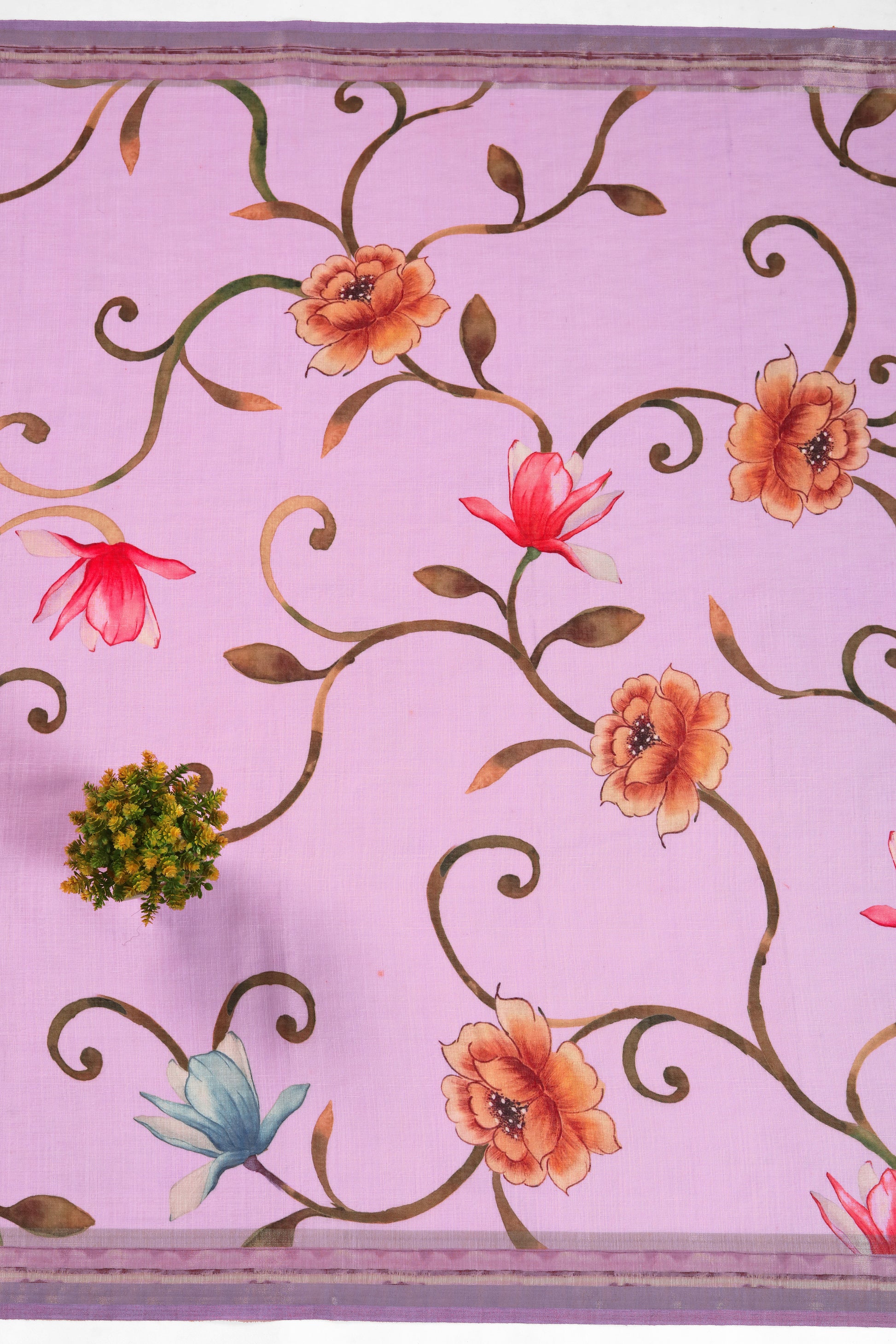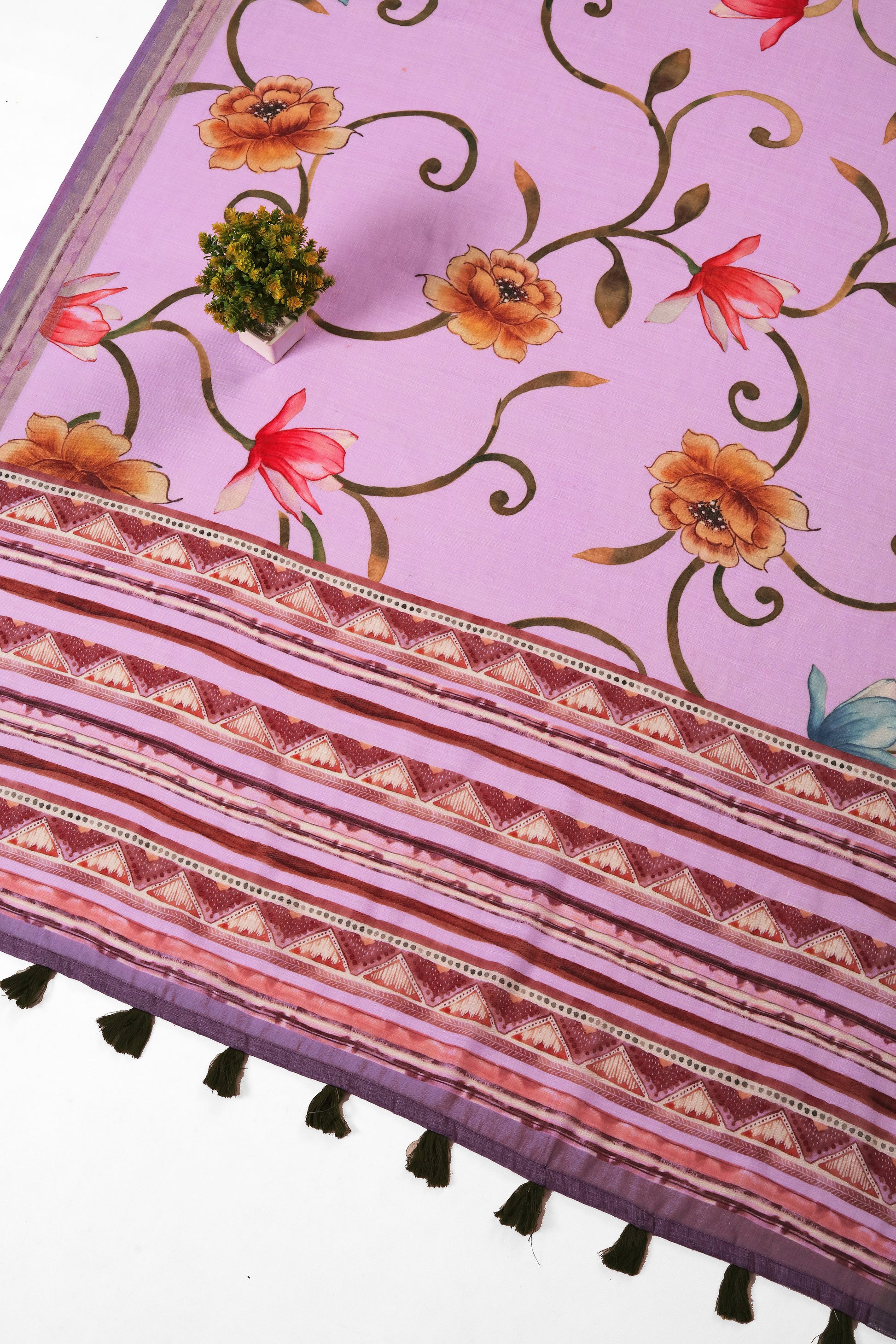 The Gulabi Bahar Linen Saree drapes you in the soft hues of a pink spring bloom, with its delicate pastel floral trails on breathable linen, perfect for a gentle summer feel.