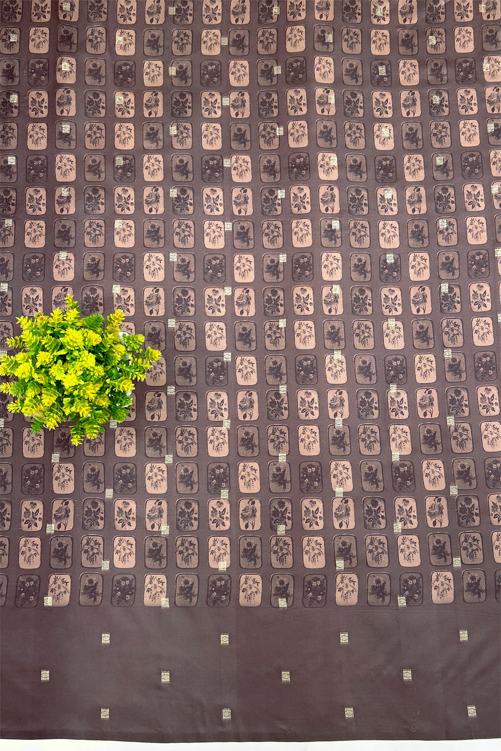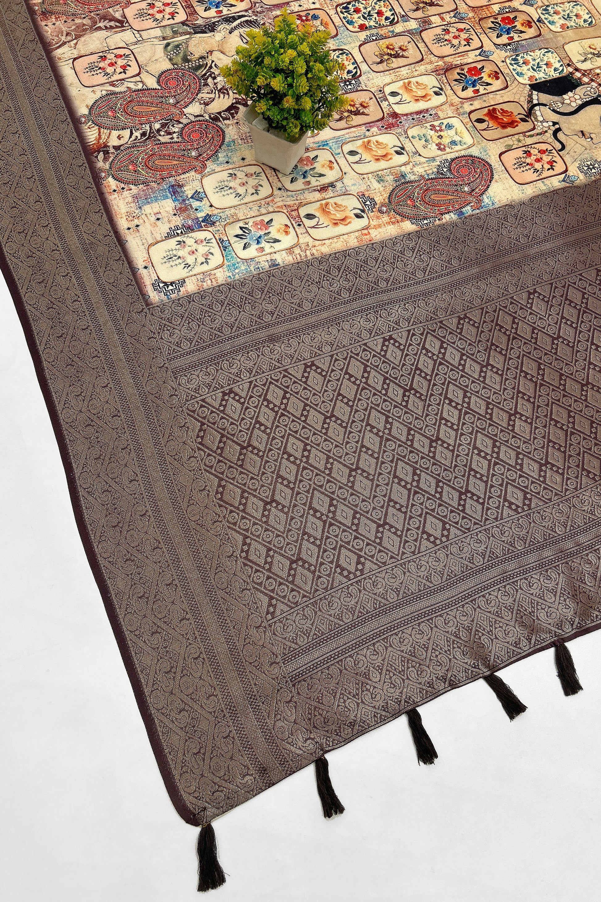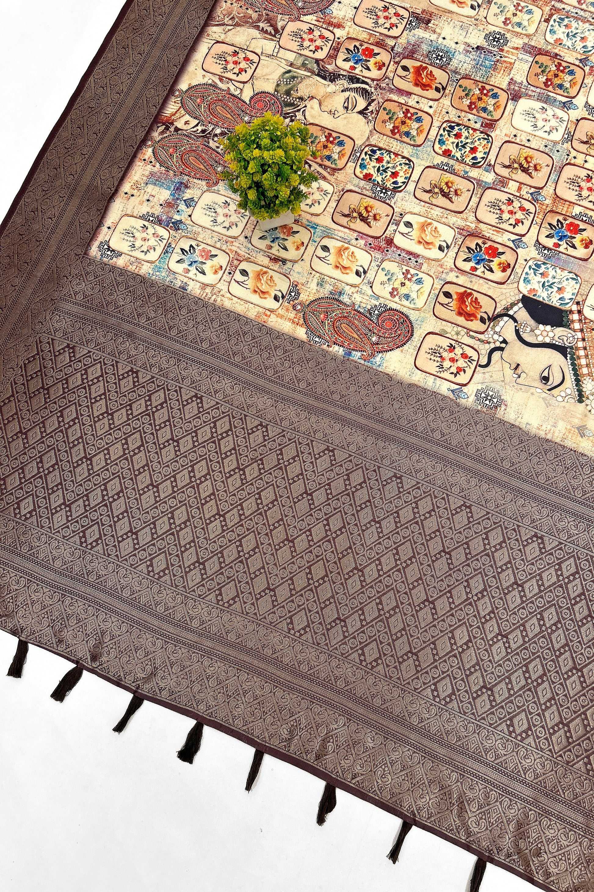 A poetic blend of art and heritage, this Gulzar Banarasi printed saree features floral blocks, delicate faces, and paisley motifs on a cream base. Finished with a rich brown jacquard border for a timeless festive look.