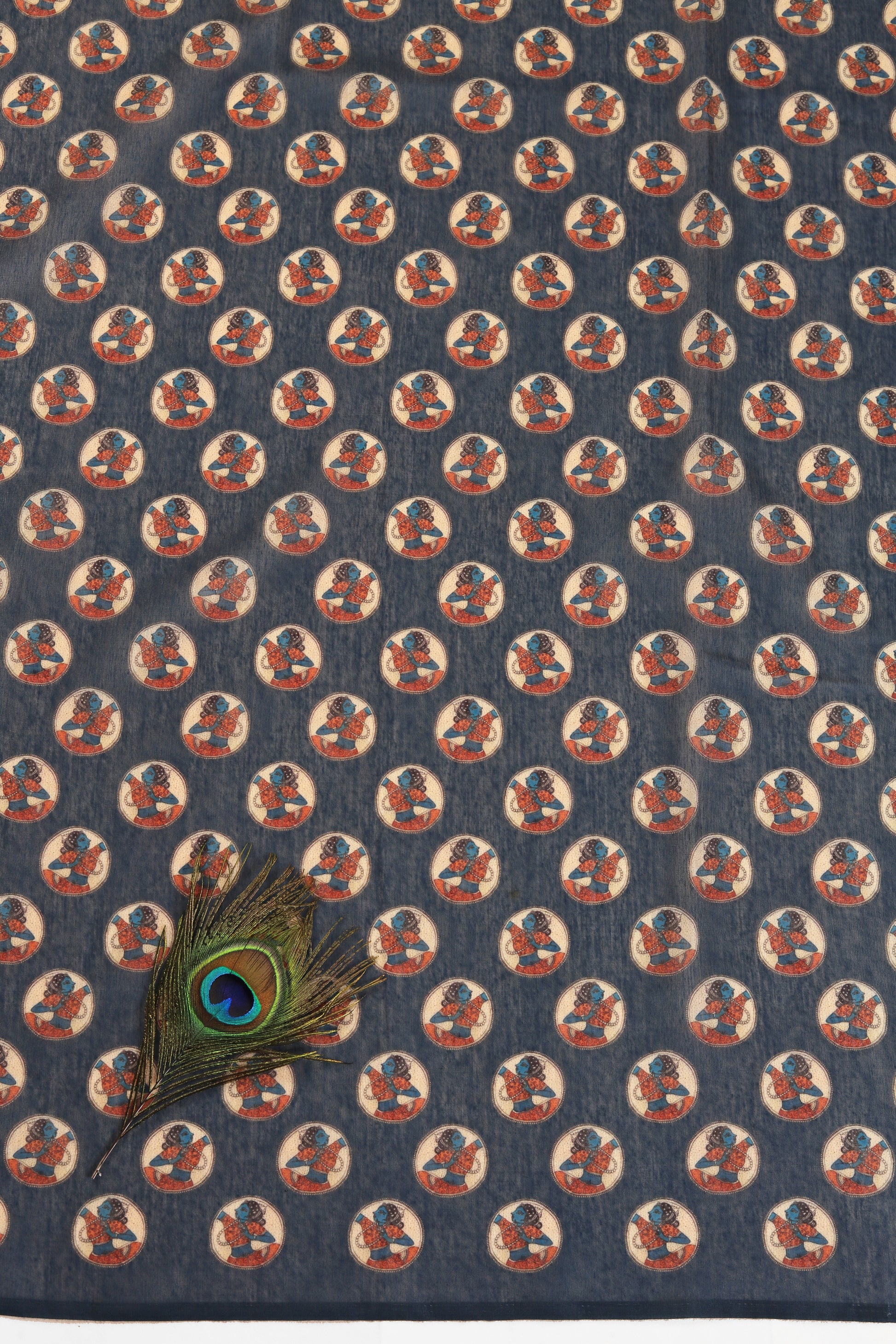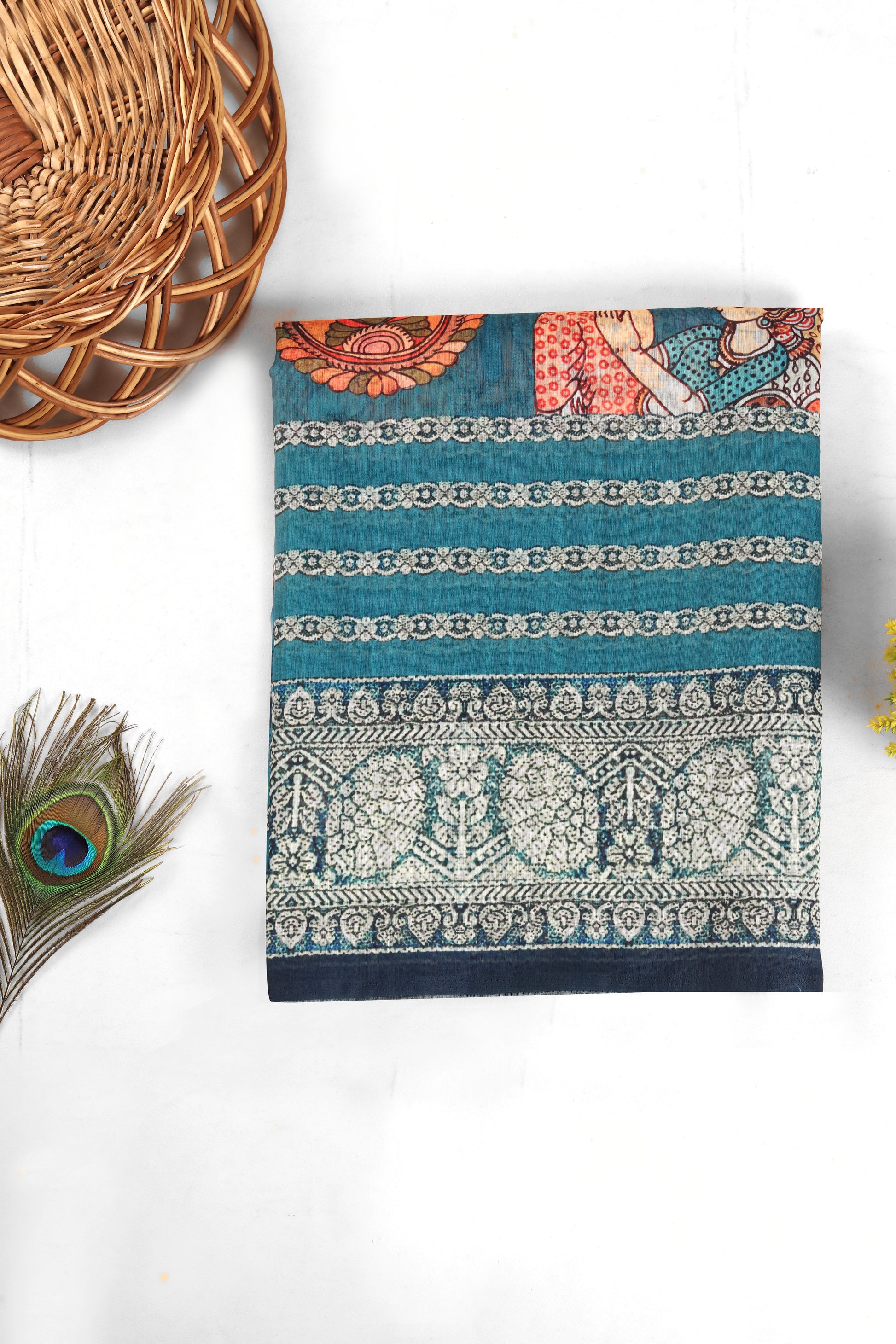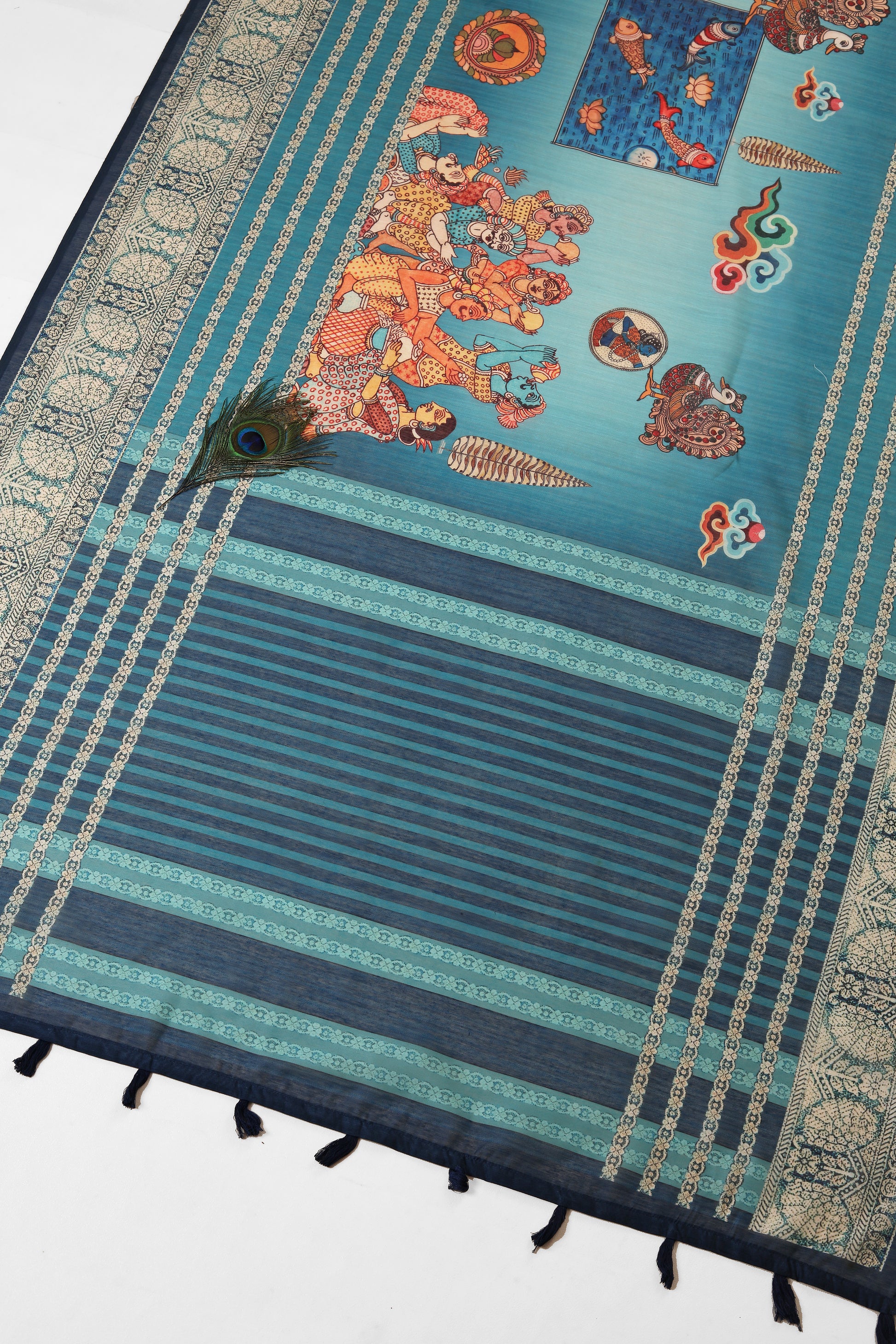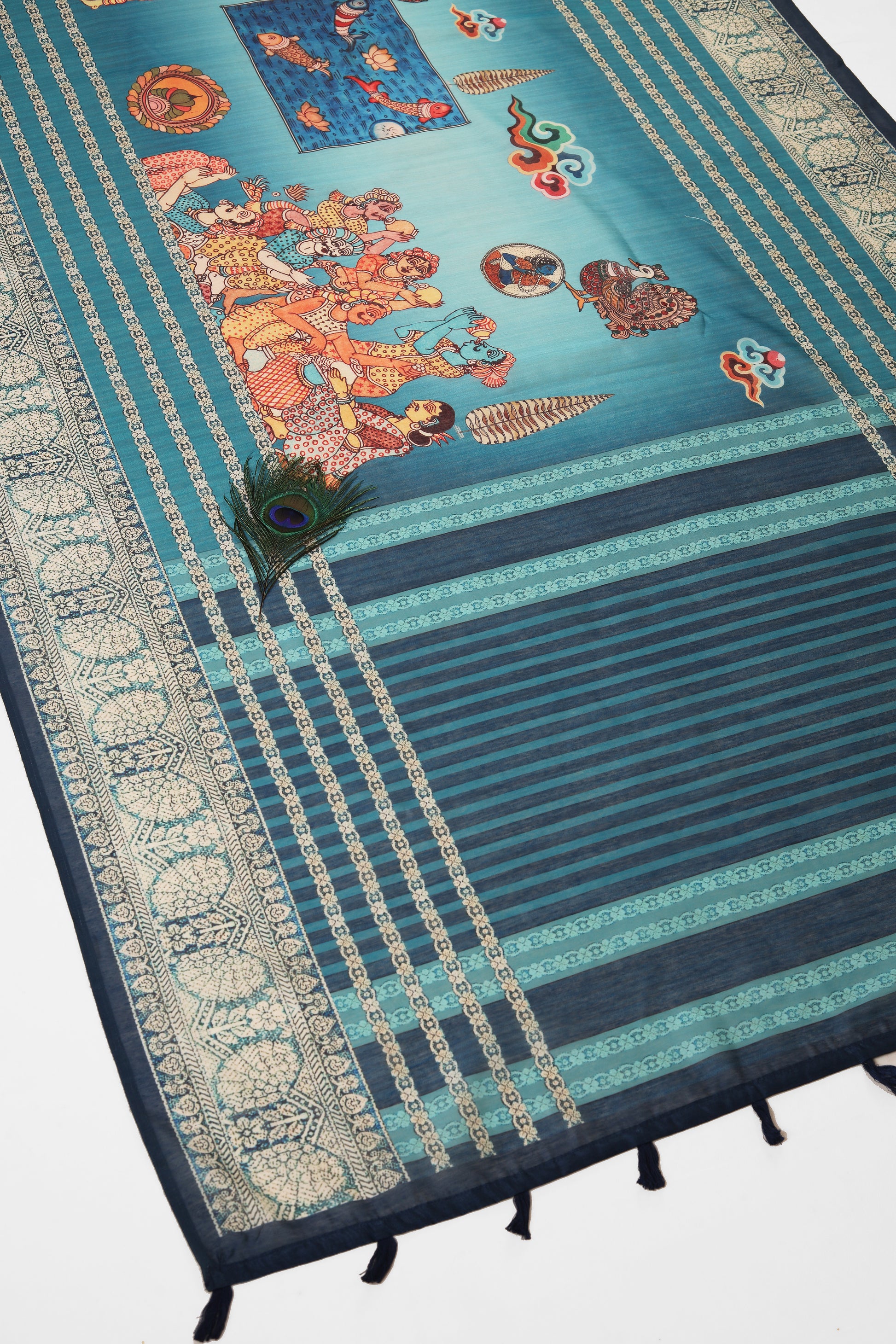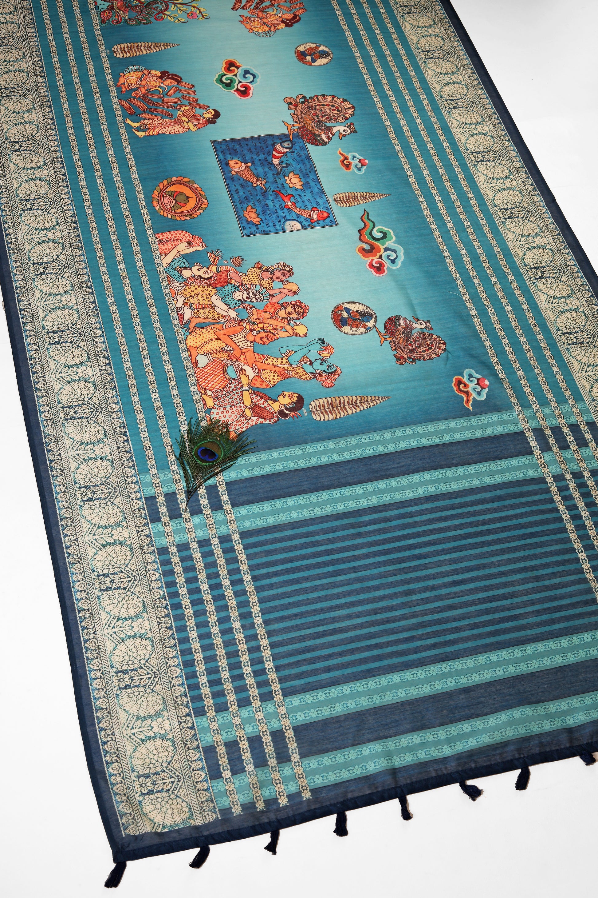 Where the waters whisper stories of creation and divinity, Jal-Leela unfolds like a hymn to life’s endless flow. Painted in soothing shades of ocean teal and azure, this Chanderi saree captures divine beings and celestial motifs adrift upon the cosmic sea. The intricate border echoes temple carvings, while the central tableau celebrates the eternal play of gods amid the rhythm of waves and sky. Light as a breeze and luminous as devotion, Jal-Leela drapes art, grace, and serenity in one timeless flow.