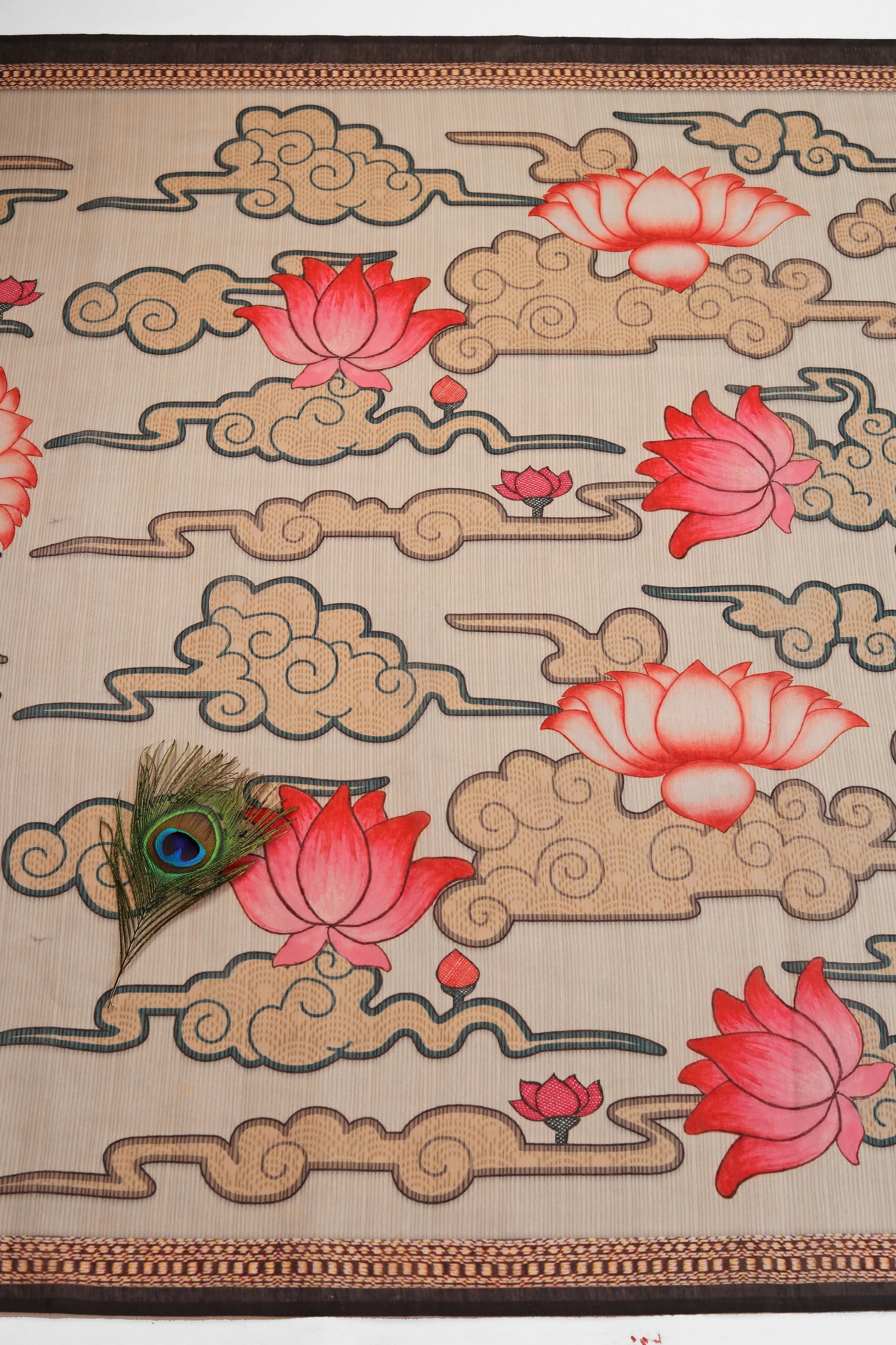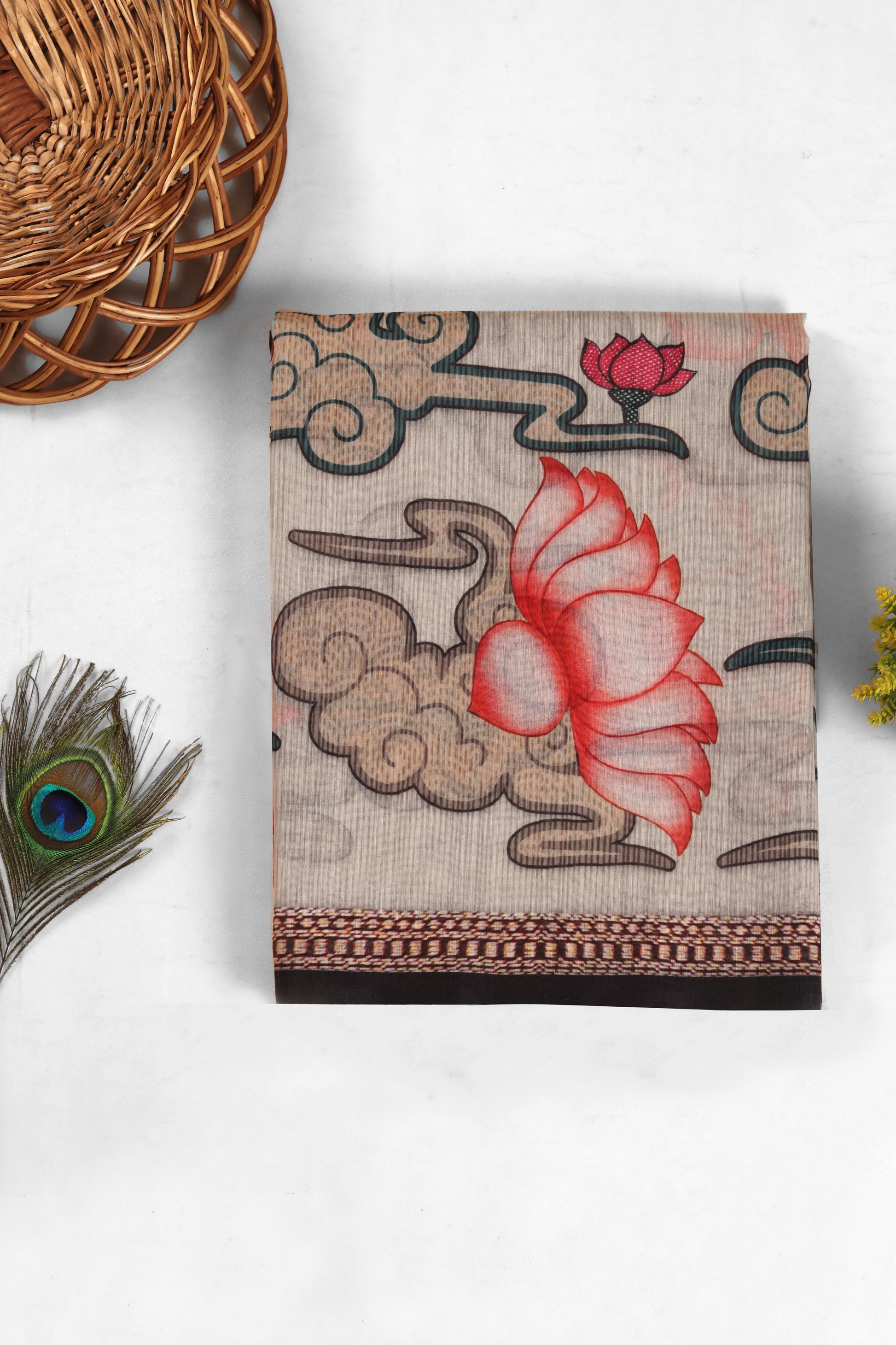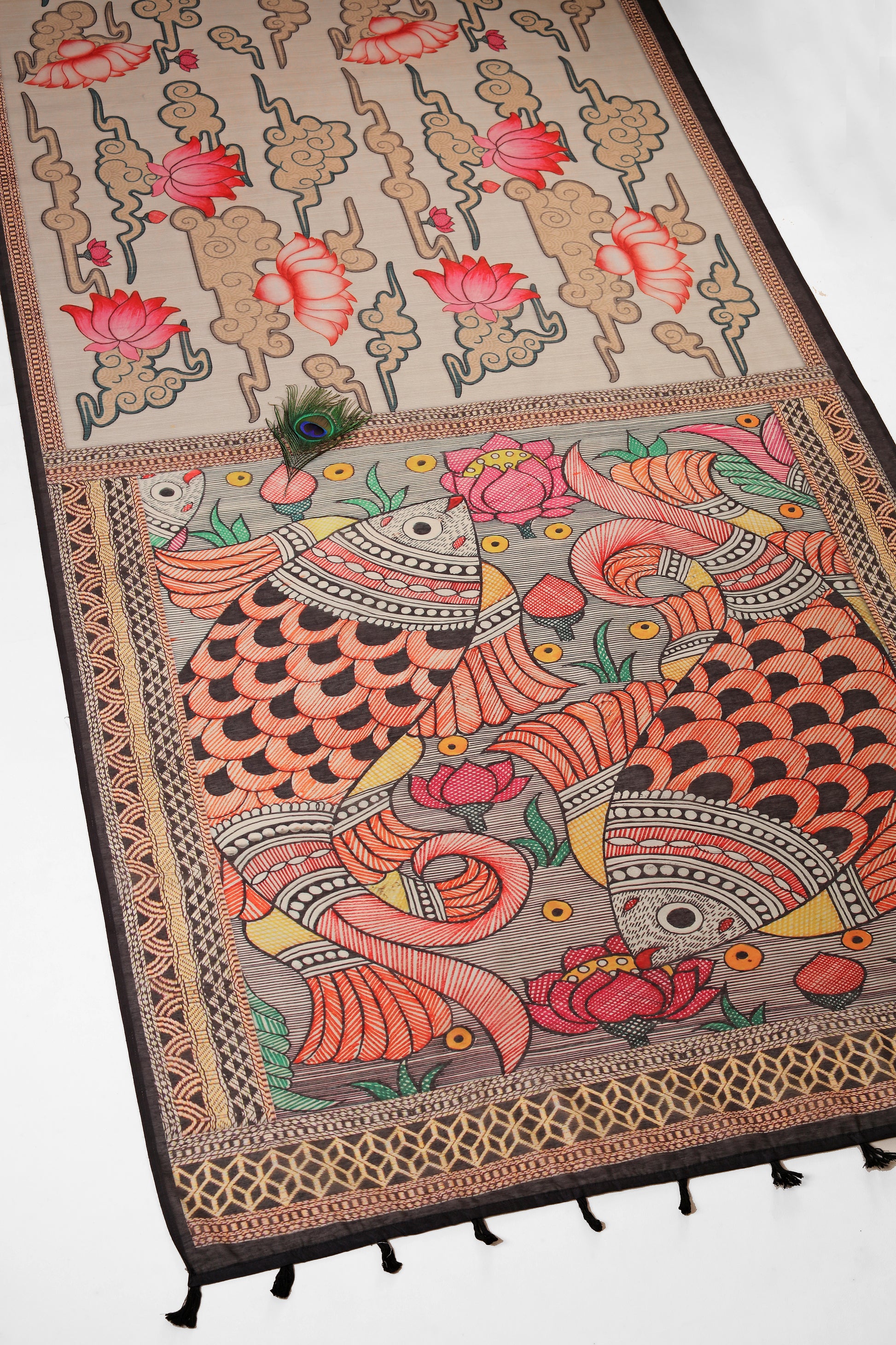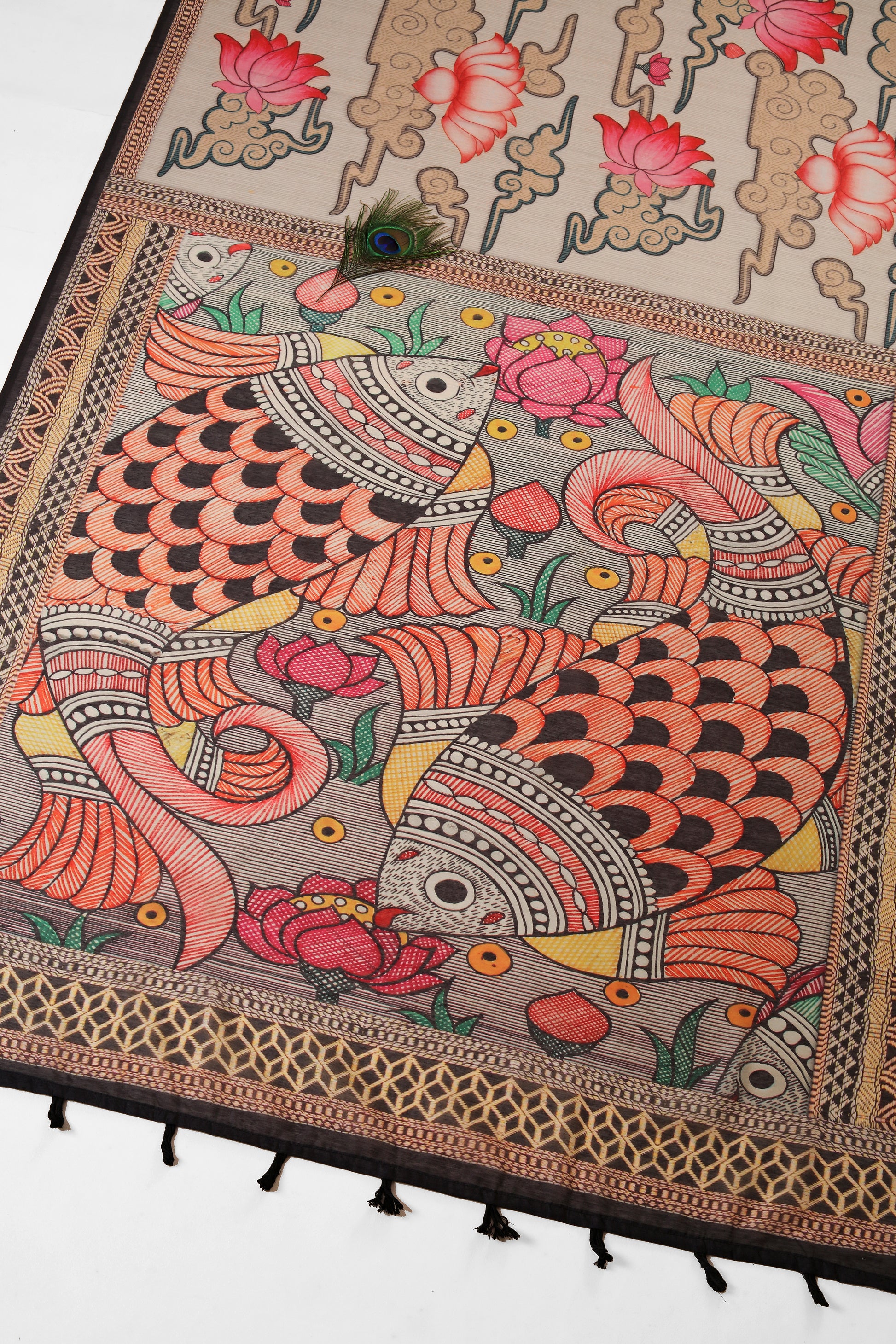 Where waters sing and lotuses bloom, Matsya-Raag tells the story of creation in rhythm and line. Rendered in intricate Madhubani-inspired art, the twin fish — symbols of abundance and harmony — glide through waves of beige and coral, while blooming lotuses rise like verses of a sacred hymn. Every motif, every hue, hums a gentle raag — a melody of life, devotion, and artistry. Soft Chanderi fabric lends it a light, fluid drape, making Matsya-Raag both meditative and majestic — art that flows as gracefully as the divine waters themselves.