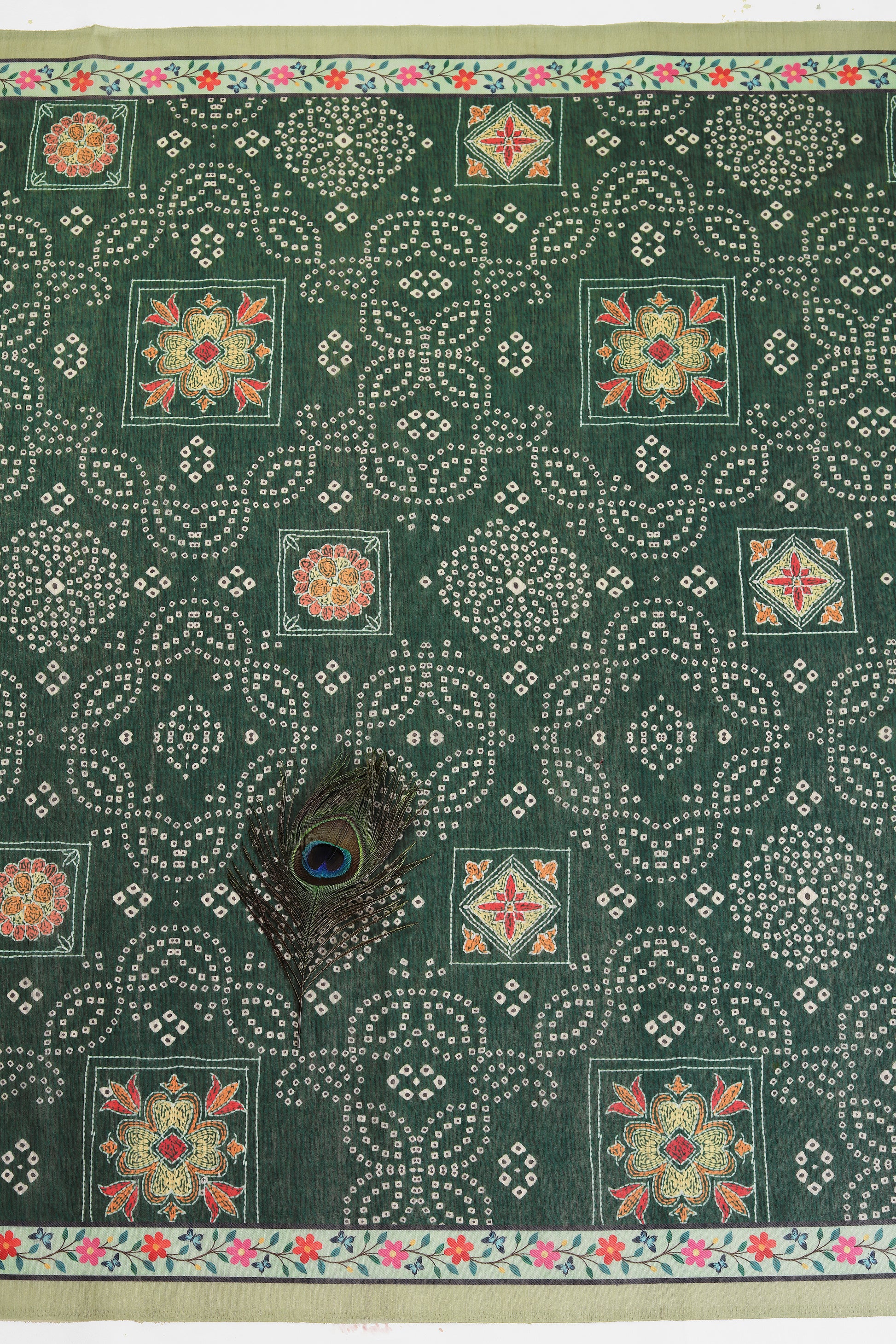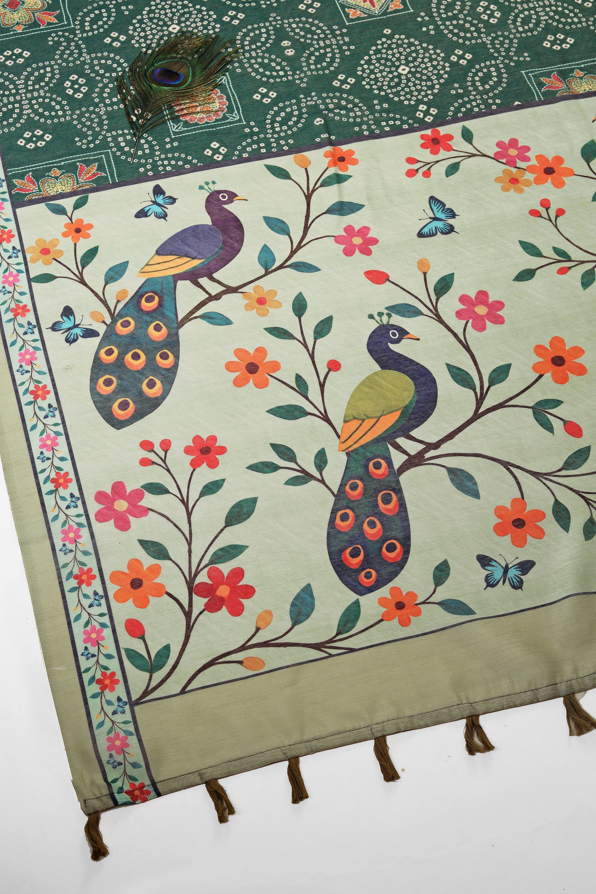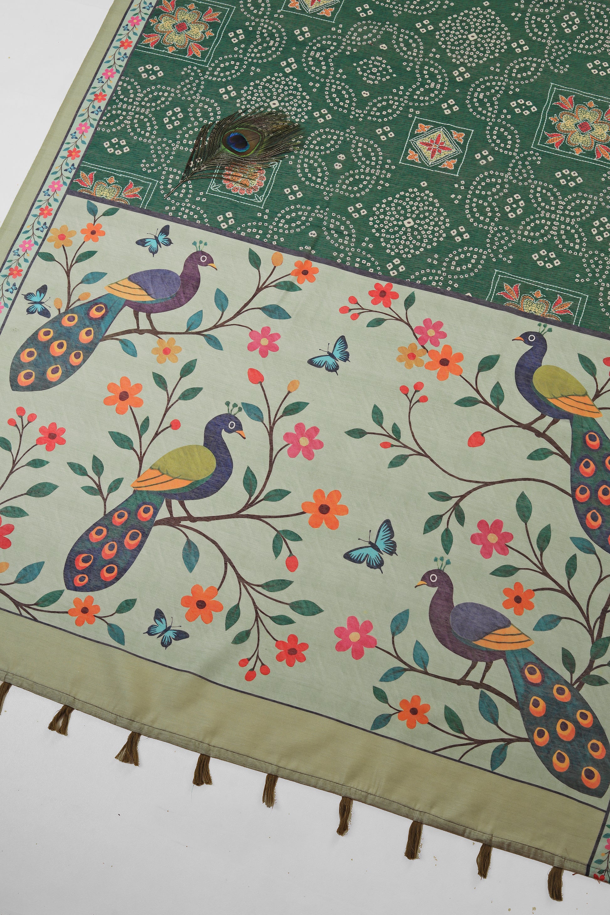 Immerse yourself in the vibrant charm of the Mayurangan Handloom Cotton Silk Saree, where graceful peacocks bloom amidst a garden of lively florals. The body showcases intricate bandhani-style motifs in rich green, blending seamlessly into a pallu adorned with multicoloured peacocks and fluttering butterflies. Handwoven in soft cotton silk, this saree brings together the elegance of heritage and the joy of nature. Perfect for festive mornings, temple visits, or conscious gifting.