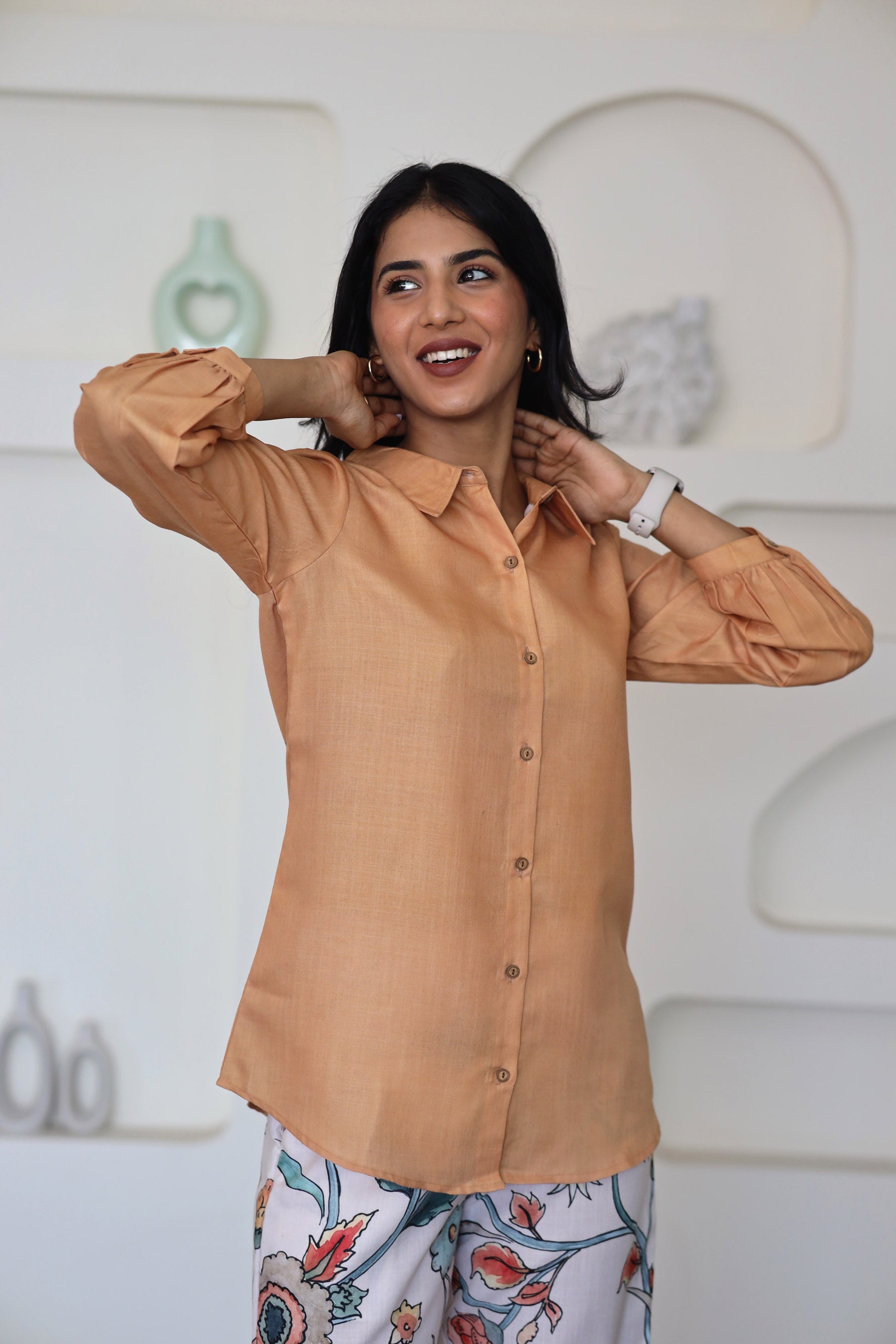 • Mustard-colored plain shirt with a classic collar