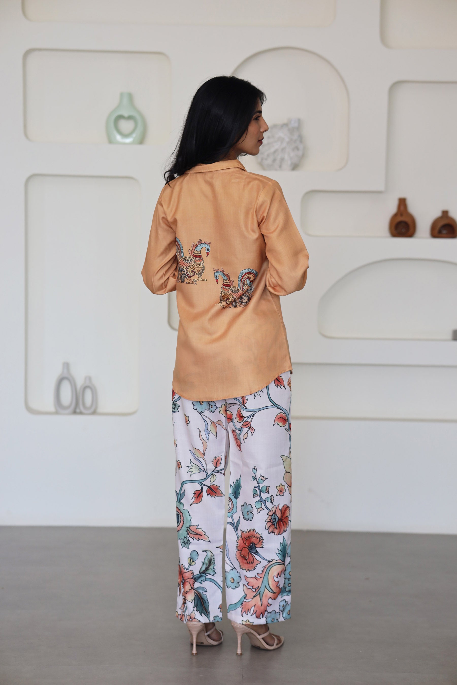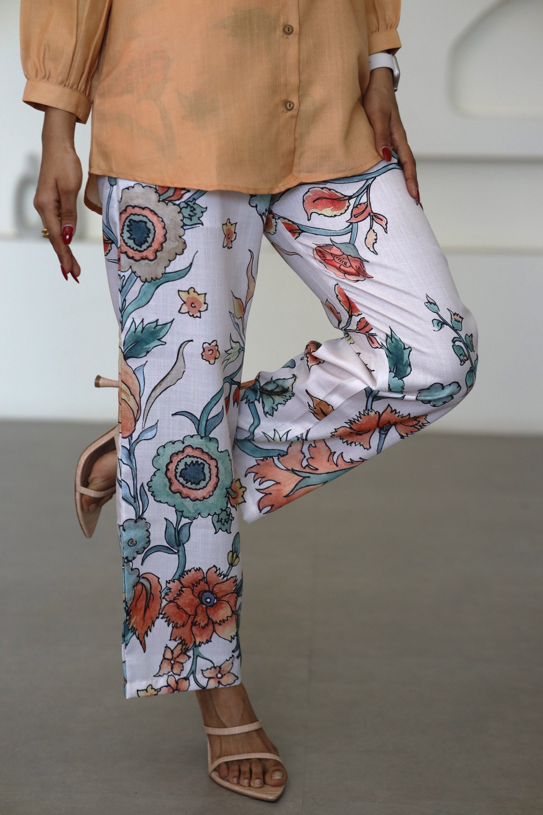 • Paired with contrast cream-colored floral-printed pants, creating an elegant ensemble