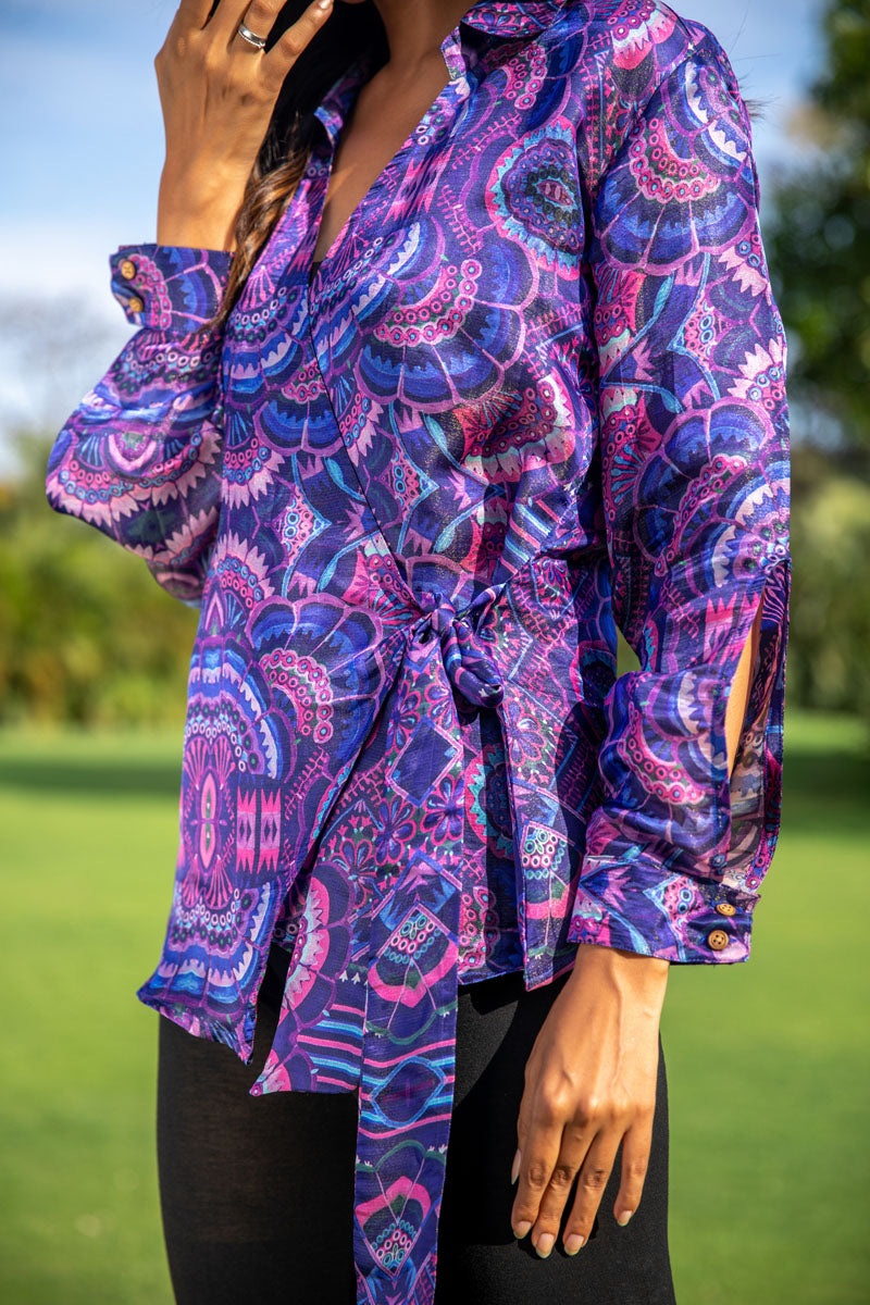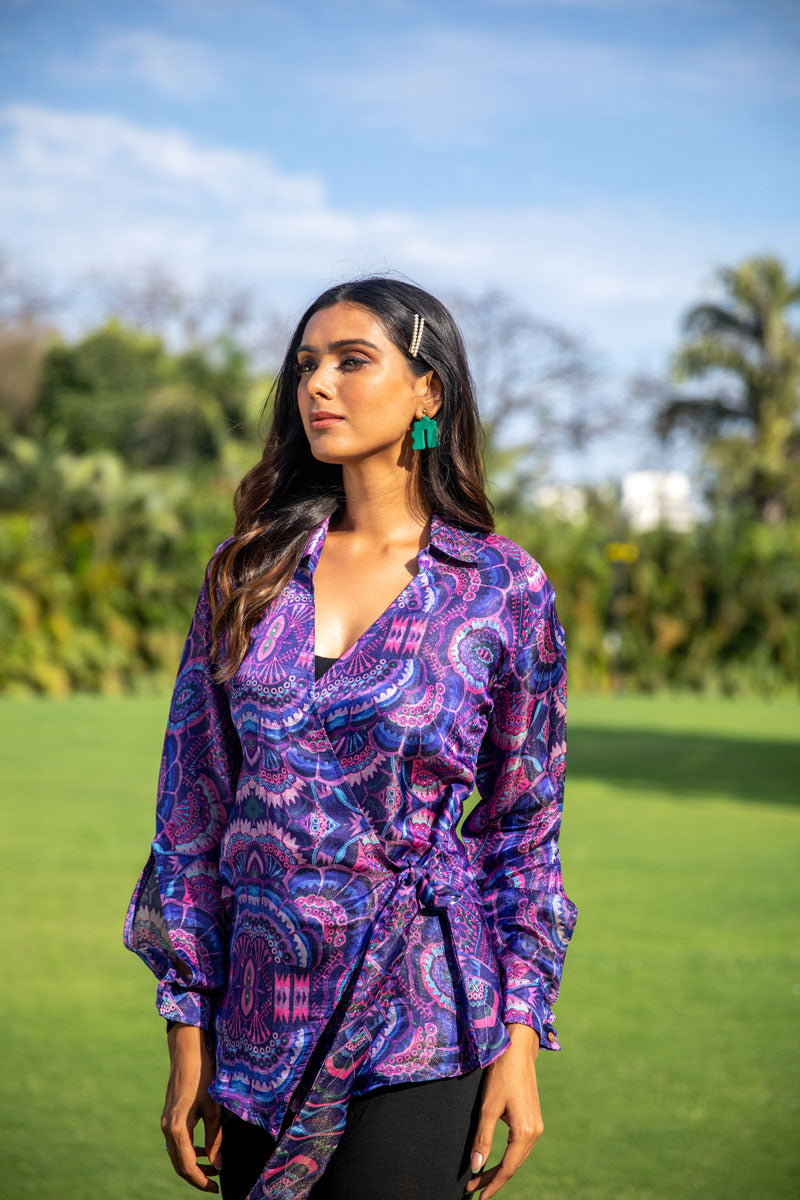• Chic overlapping top with shirt collars and a belt for a sophisticated touch
