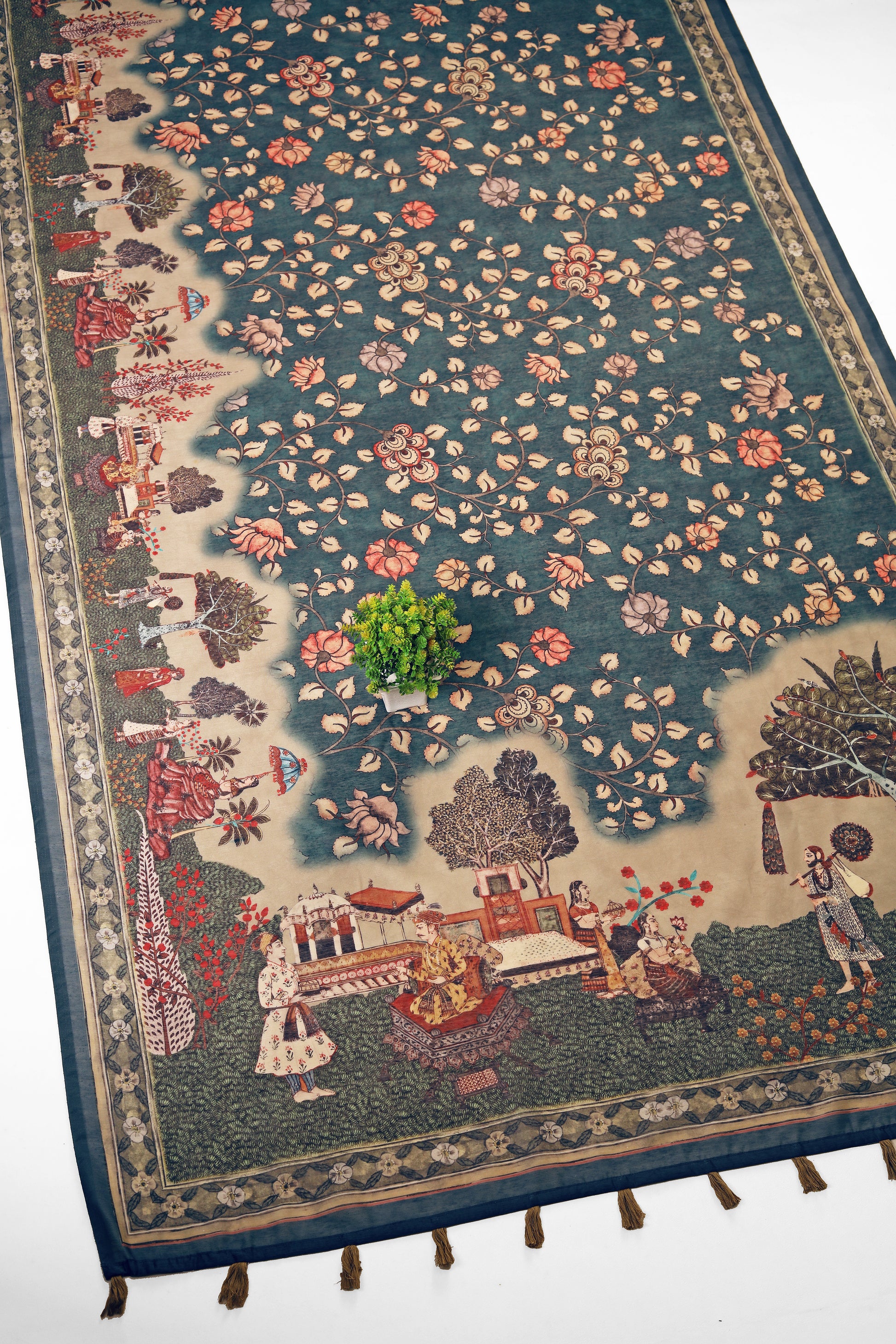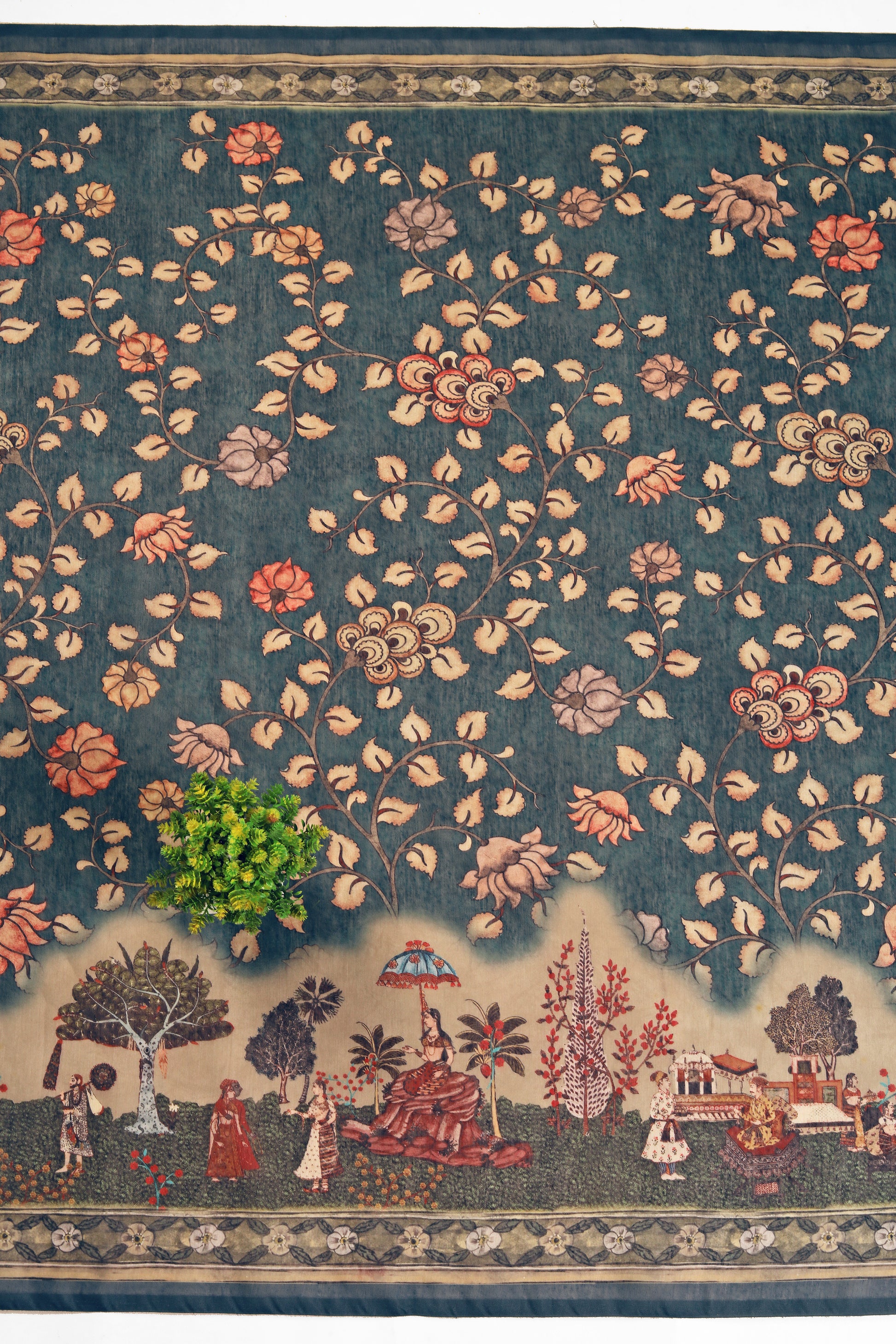 Step into timeless elegance with Nilshahi, a masterpiece in soft Chanderi cotton. Adorned with intricate Mughal-inspired motifs, this saree narrates royal garden scenes where emperors, queens, and courtyards come alive in fine Kalamkari artistry. The soothing blue base adds depth, while the storytelling border and pallu make it a regal statement for festive and cultural occasions.