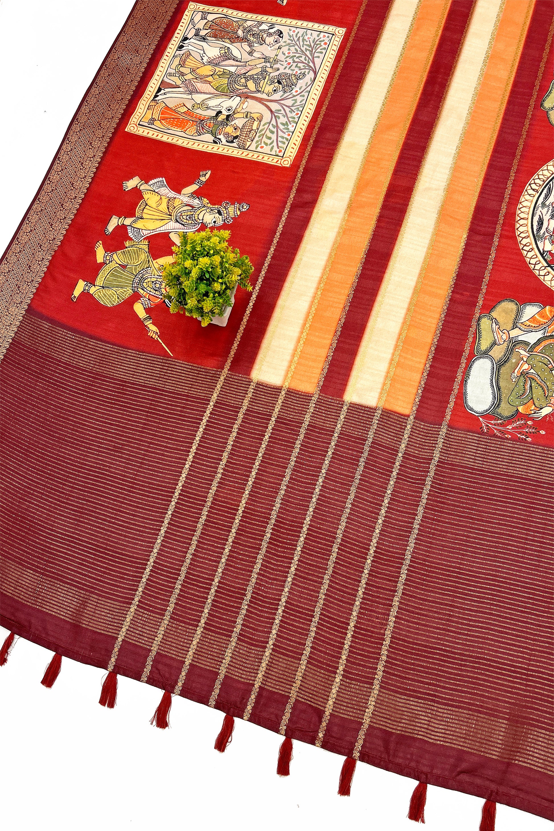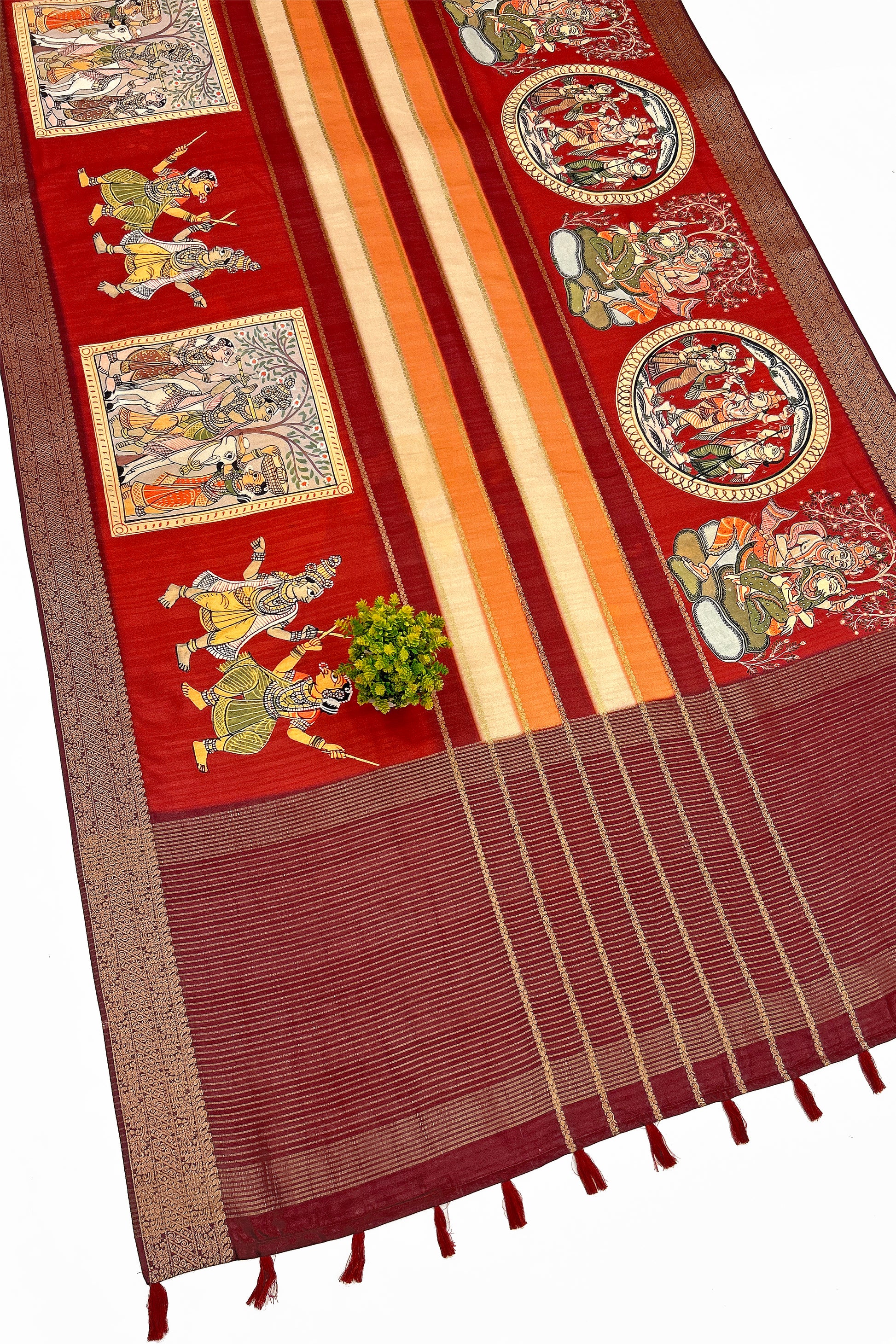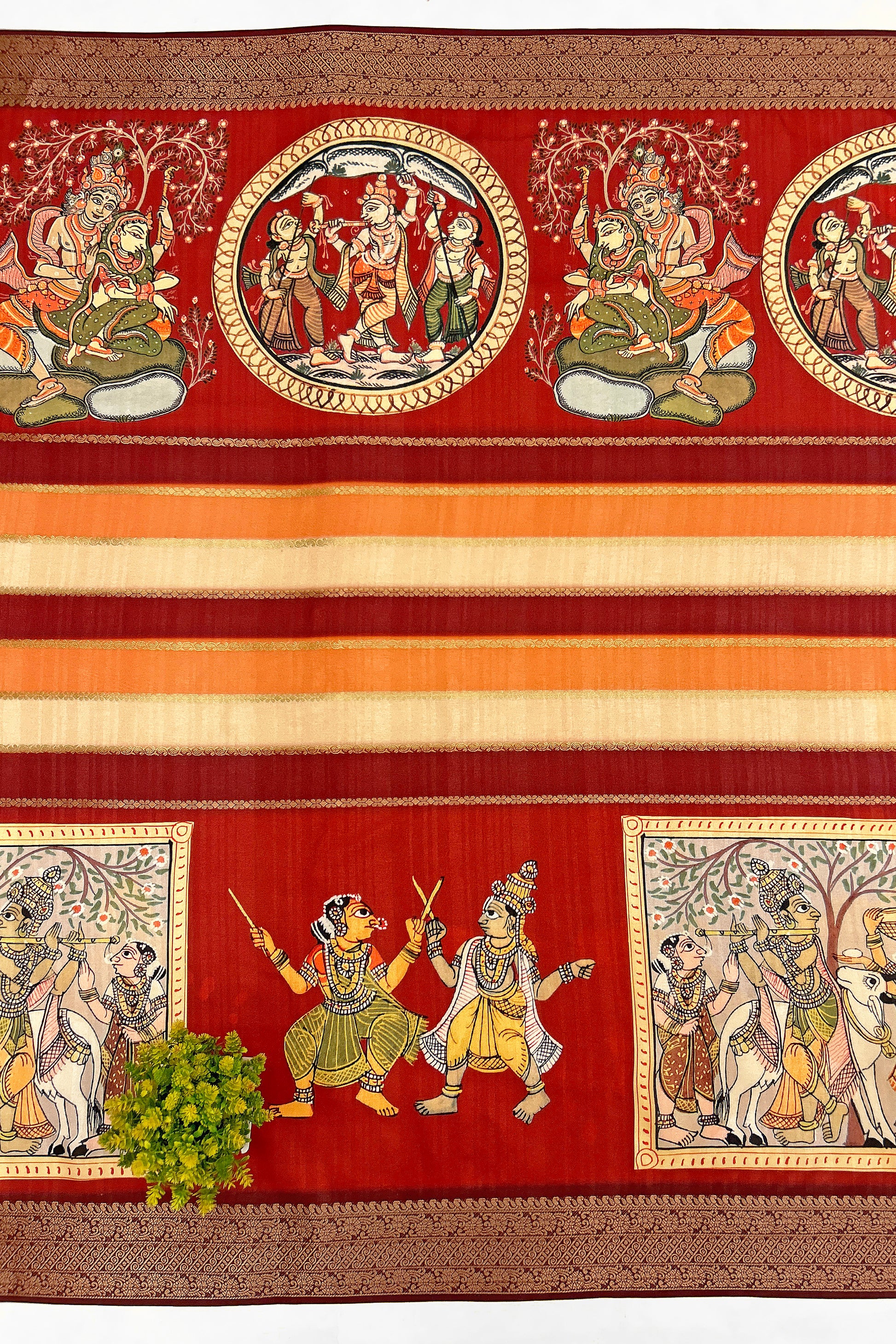 The Nritya Katha Saree beautifully narrates the divine love story of Radha and Krishna through intricate dance scenes and framed mythological art. Set on a rich maroon base with earthy tones, this saree is a celebration of devotion, movement, and timeless tradition.