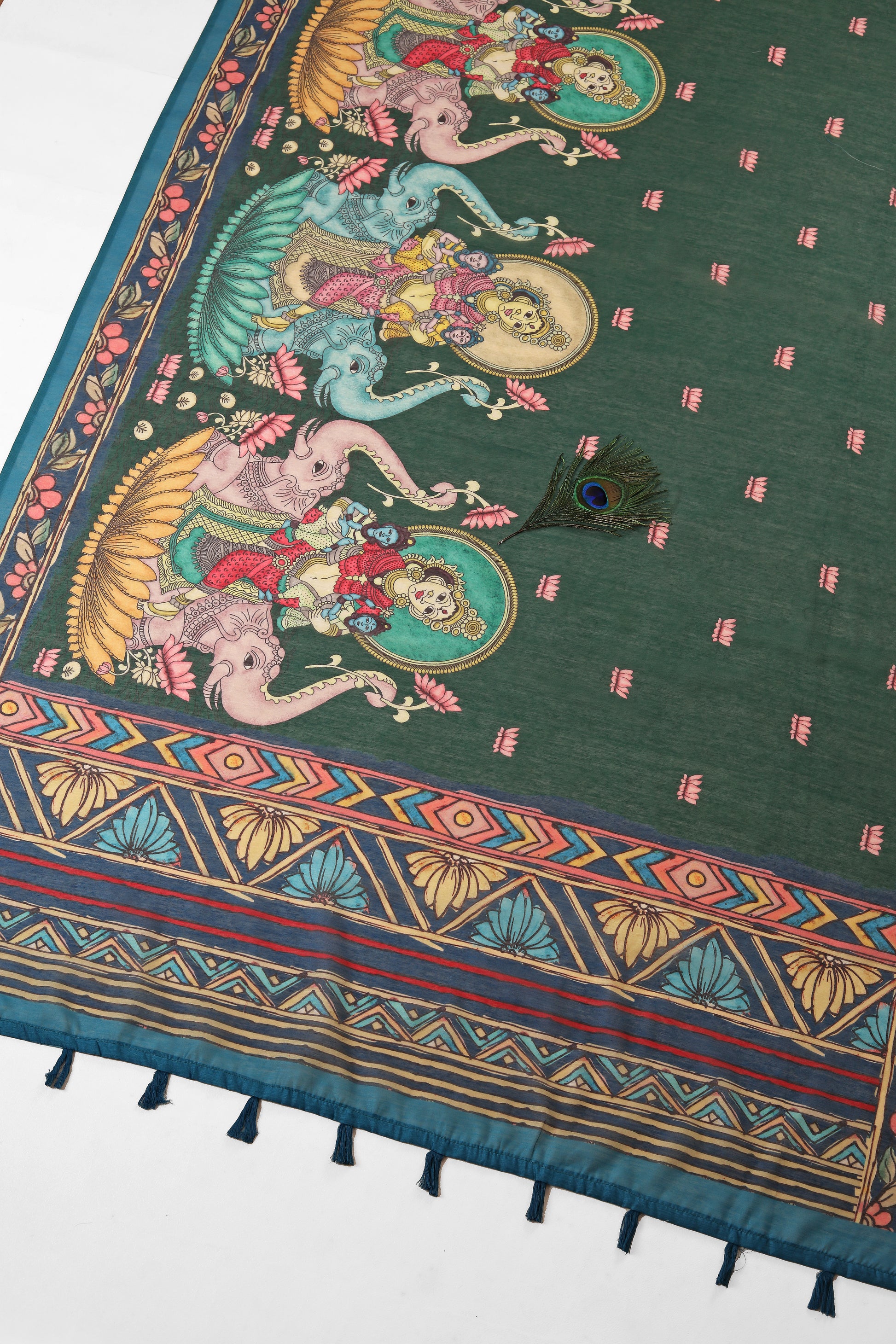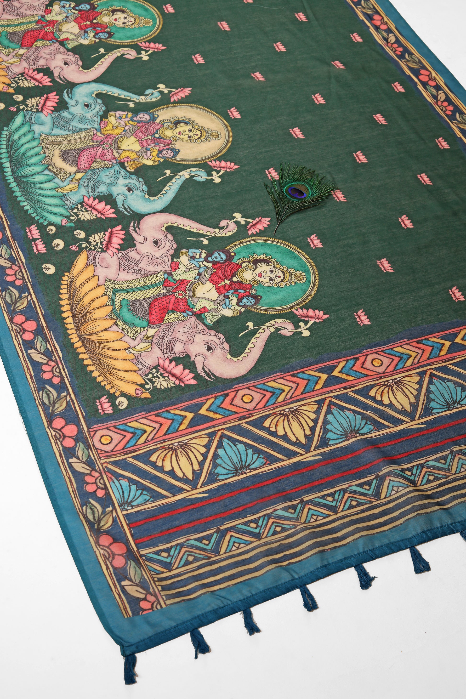 Grace blooms like a lotus in still waters — Padma-Roop captures the tranquil divinity of Goddess Lakshmi in her most serene form. Adorned with sacred motifs of Gaja Lakshmi, elephants, and blooming lotuses, this deep green Chanderi saree radiates abundance and calm strength. Each drape is an invocation of prosperity, purity, and poise — a timeless harmony between devotion and design. Soft, light, and luminous, Padma-Roop celebrates the divine within the everyday — a wearable blessing of beauty and grace.