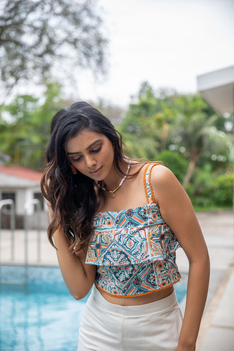 • Graceful 2-layer strap top with delicate lace detailing, paired with ivory pants for a timeless ensemble