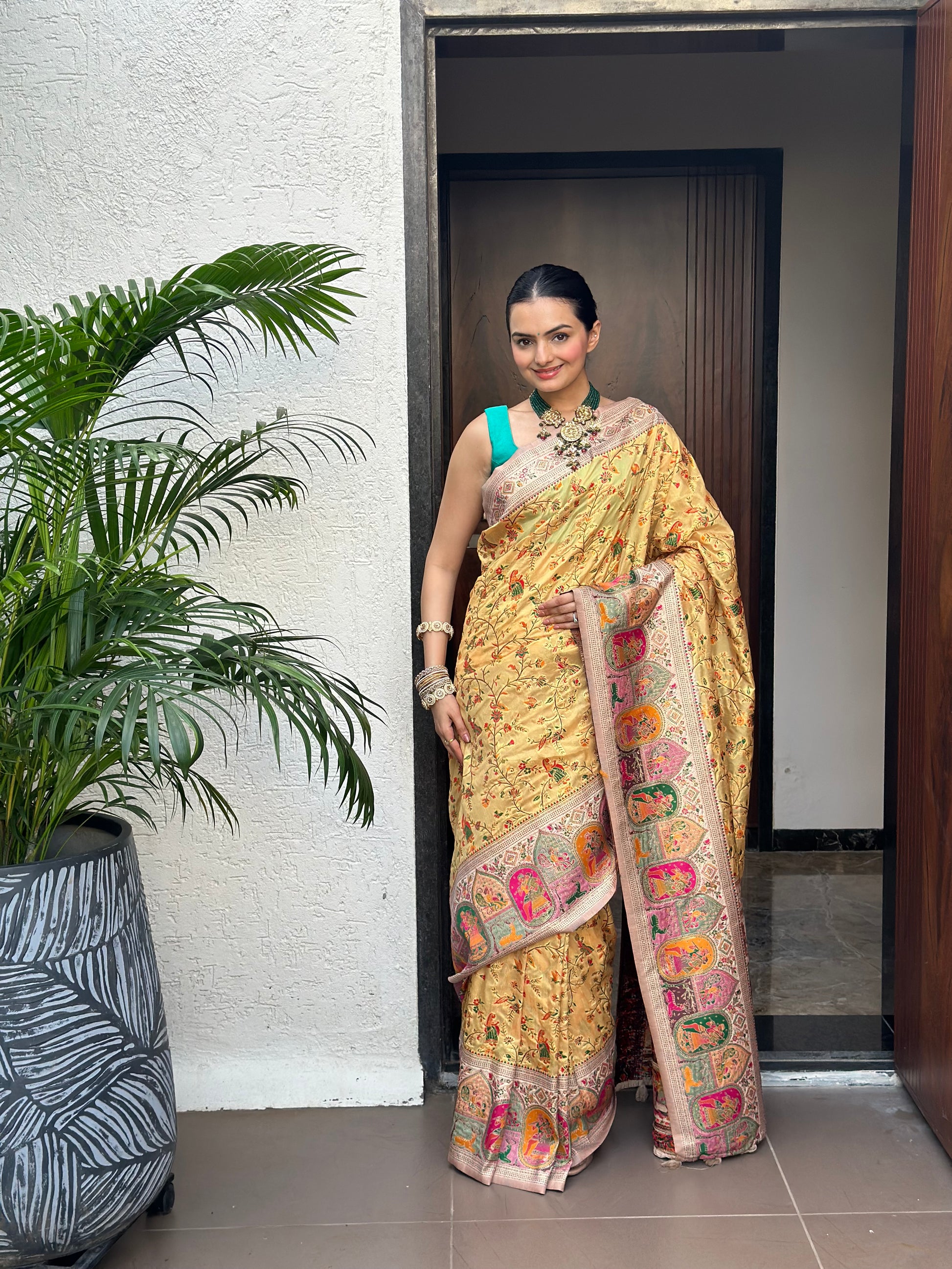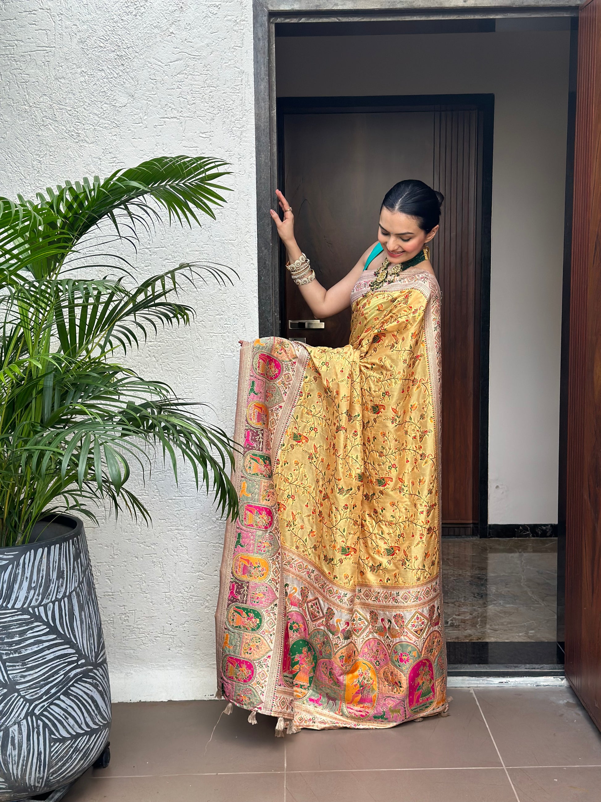 Peetambari—"The Wearer of Yellow"—is the grand jewel of the collection, a radiant saree that captures the light and joy of a royal celebration. Crafted in a fine silk-blend jacquard, the auspicious mustard-yellow body is entirely covered in a delicate all-over meenakari jaal (net), featuring intricate climbing vines, songbirds, and miniature florals in vibrant threadwork. The saree culminates in a magnificent border and pallu, which showcase detailed Mughal-style Jharokha (arched panels). Each arch frames a unique royal or ceremonial scene, brought to life with dense, multicolor meenakari in stunning shades of magenta, sage green, and brilliant gold zari. As radiant as the midday sun and as intricately detailed as a palace fresco, Peetambari is the definitive statement piece for grand weddings, significant festivals, and traditional ceremonies.
