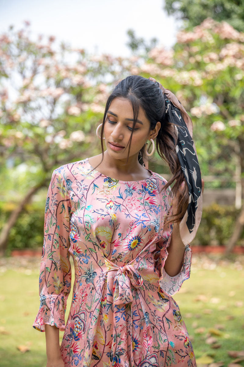 • Pure Chinon Satin floral printed top that has an adjustable belt on the waist which can be tied.