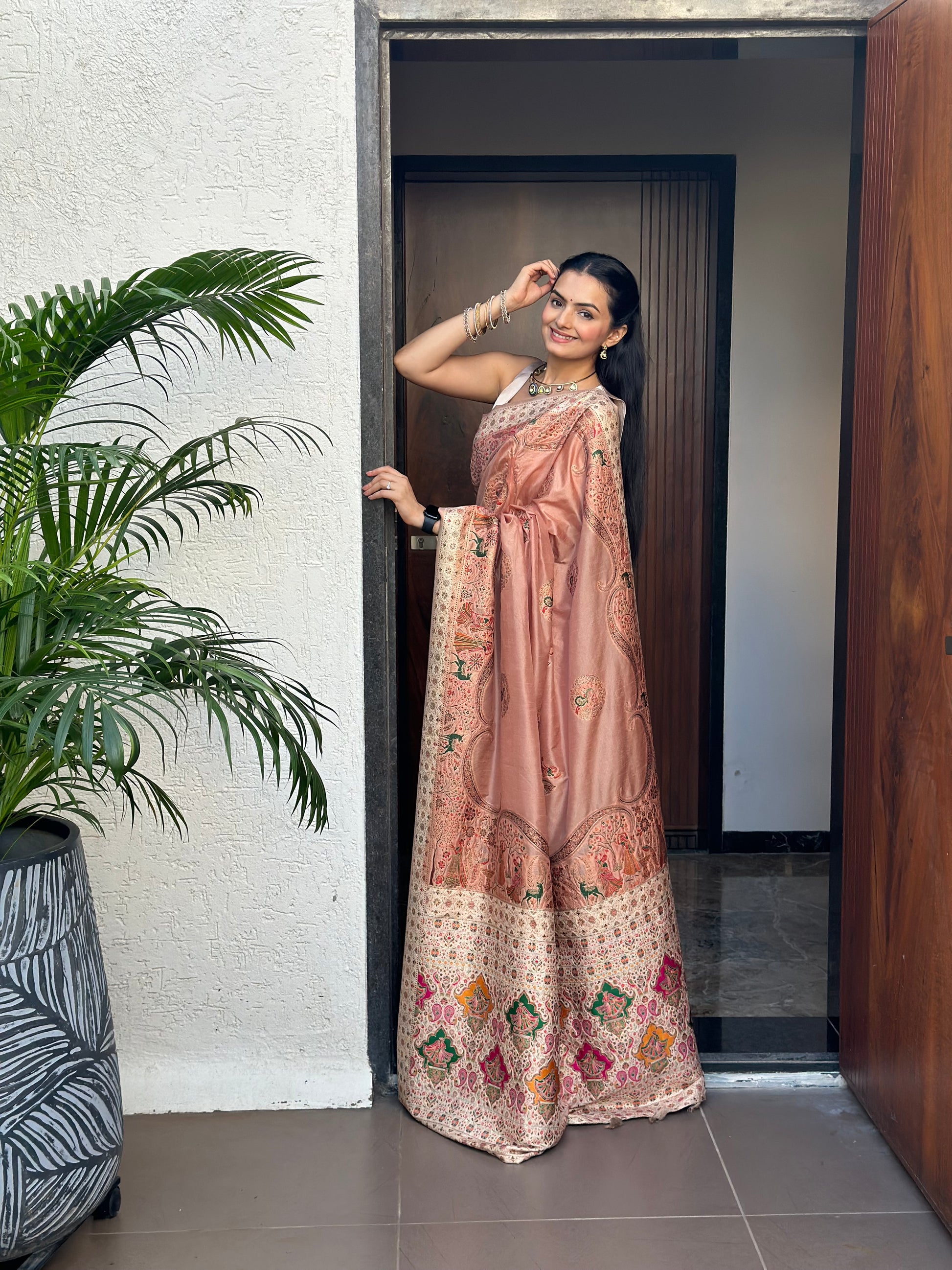 An ode to divine rhythm and royal artistry, Raasmala celebrates the poetry of movement woven into silk. This exquisite peach-toned meenakari jacquard saree features miniature woven figures of women in dance postures, peacocks, and deer, creating a tapestry of devotion and grace. Its ivory meenakari border and pallu come alive with floral jaal motifs, vibrant magenta, yellow, and emerald accents, and a storytelling rhythm reminiscent of the Raas Leela itself. Woven in a silk-blend jacquard, Raasmala is a symbol of delicate grandeur — soft in touch, yet opulent in detail — making it perfect for festive evenings, cultural gatherings, and heritage celebrations.