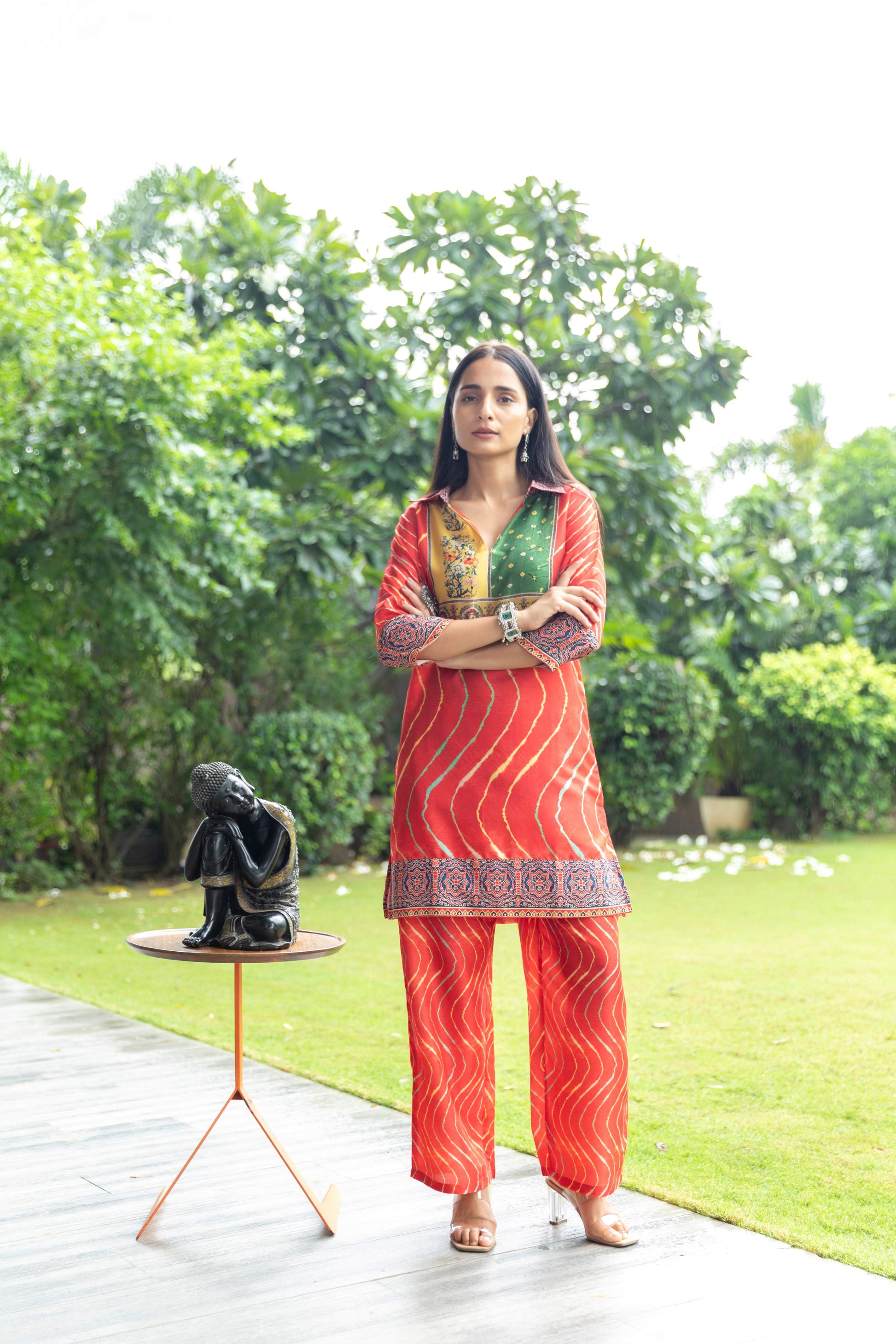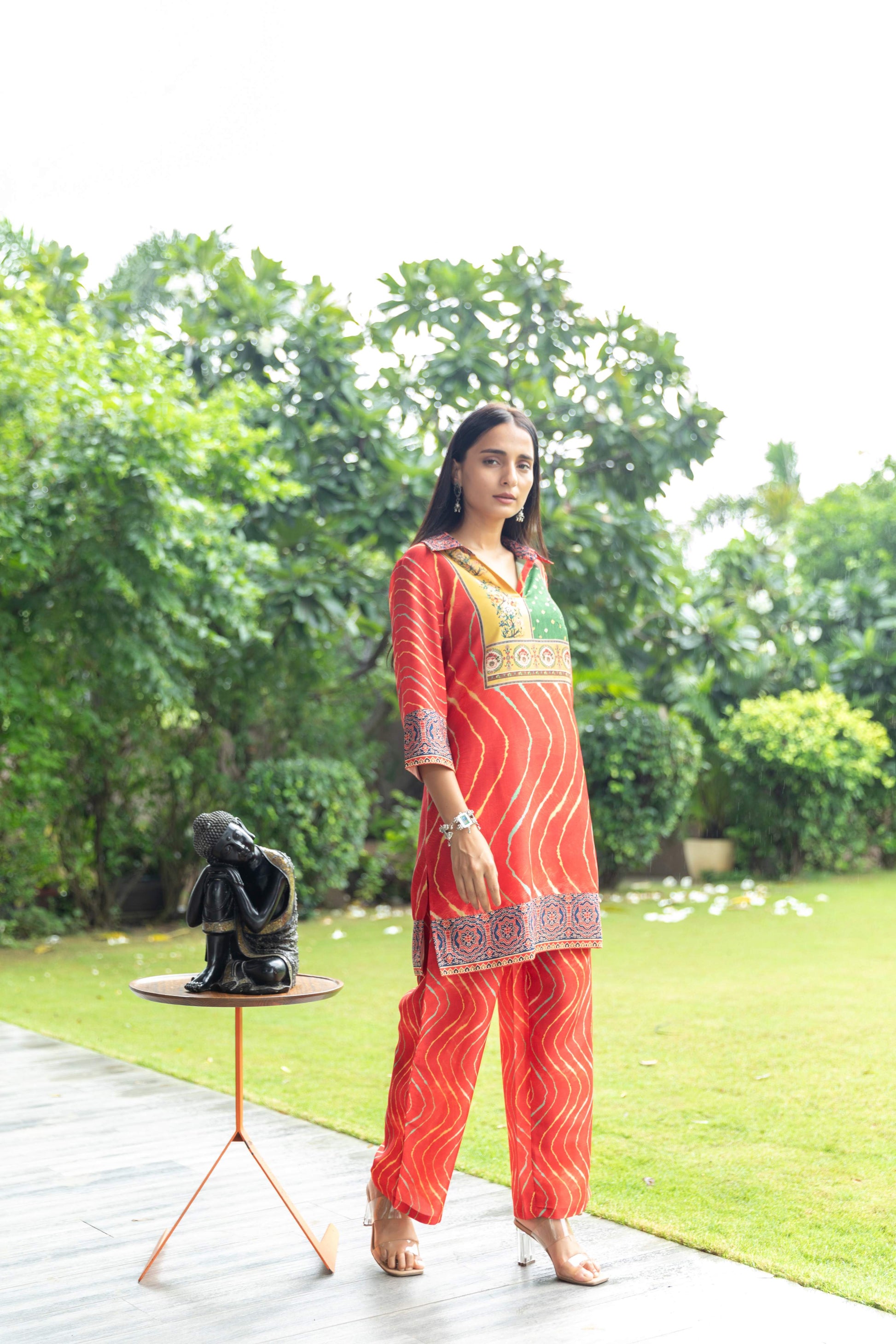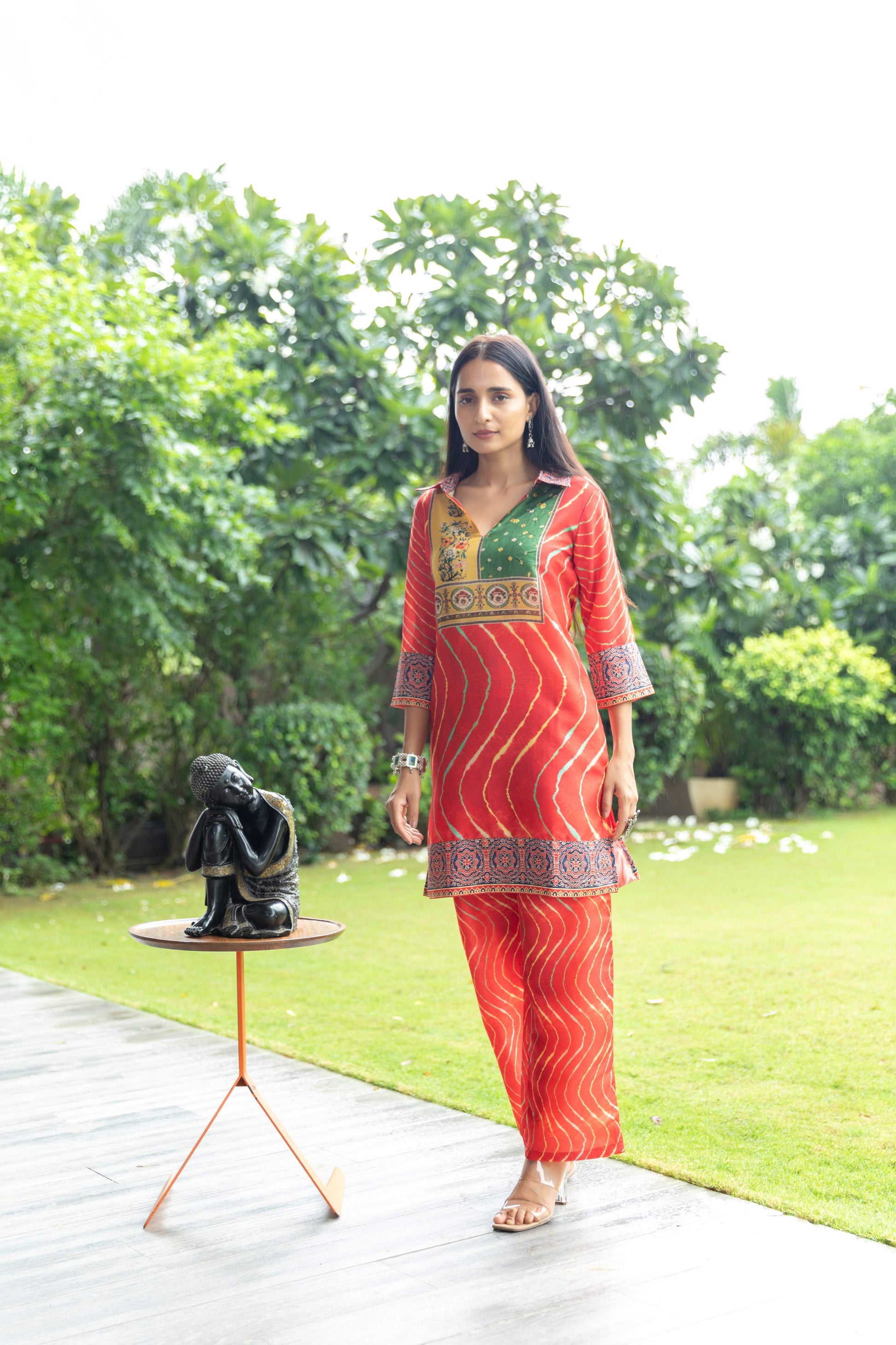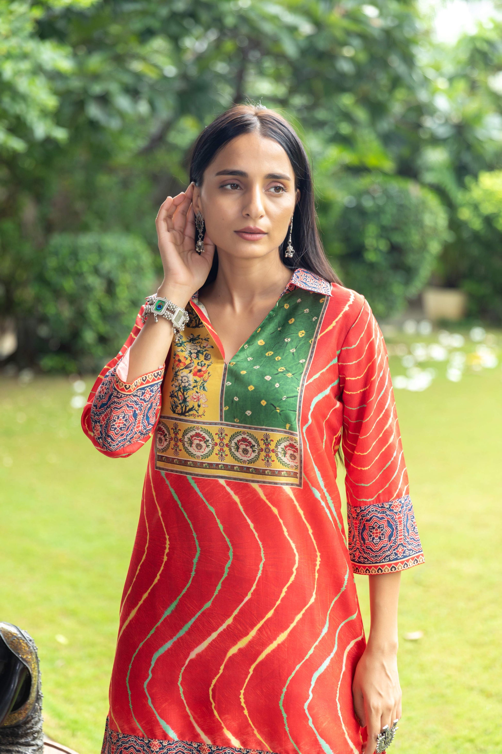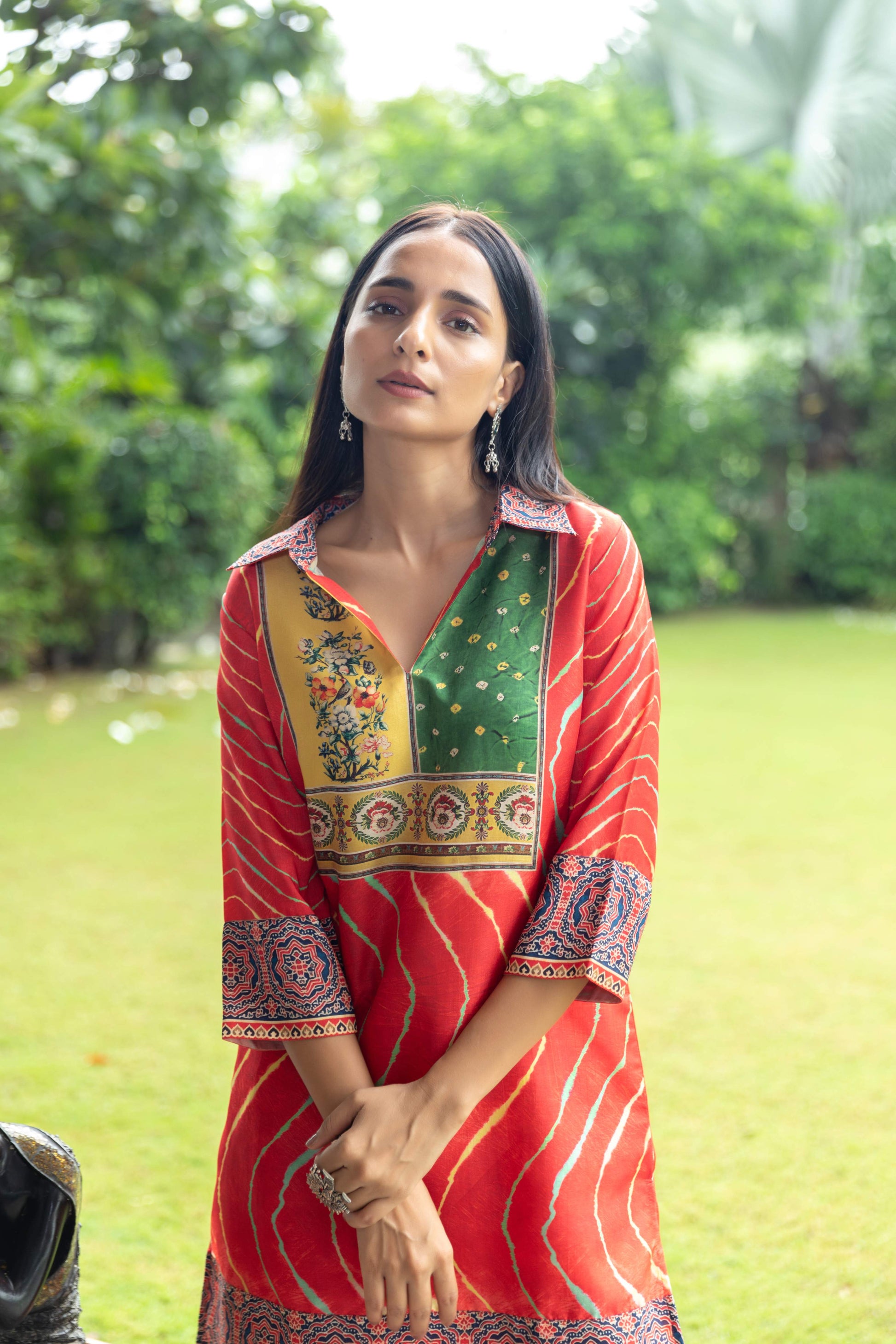• Beautiful combination of ethic fusion prints with borders in collar, sleeve, and ends.