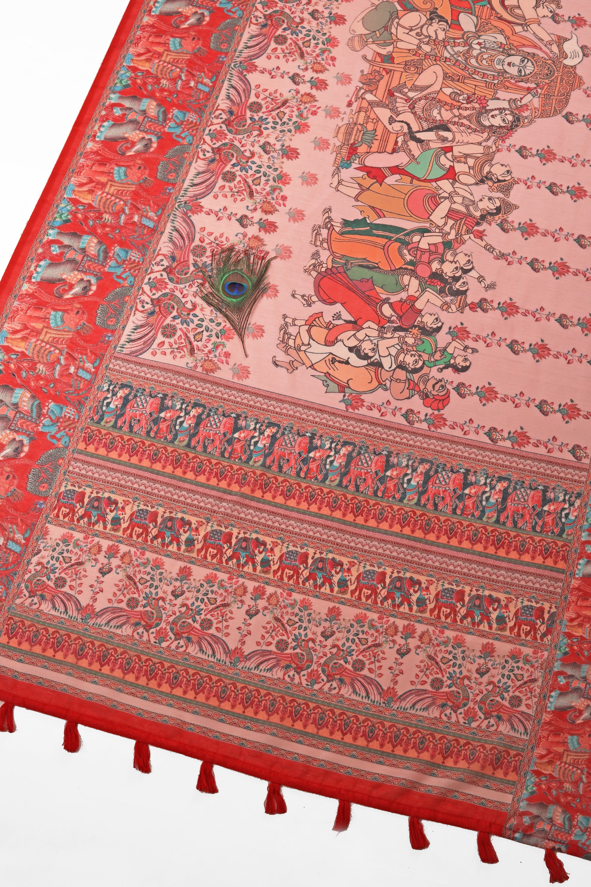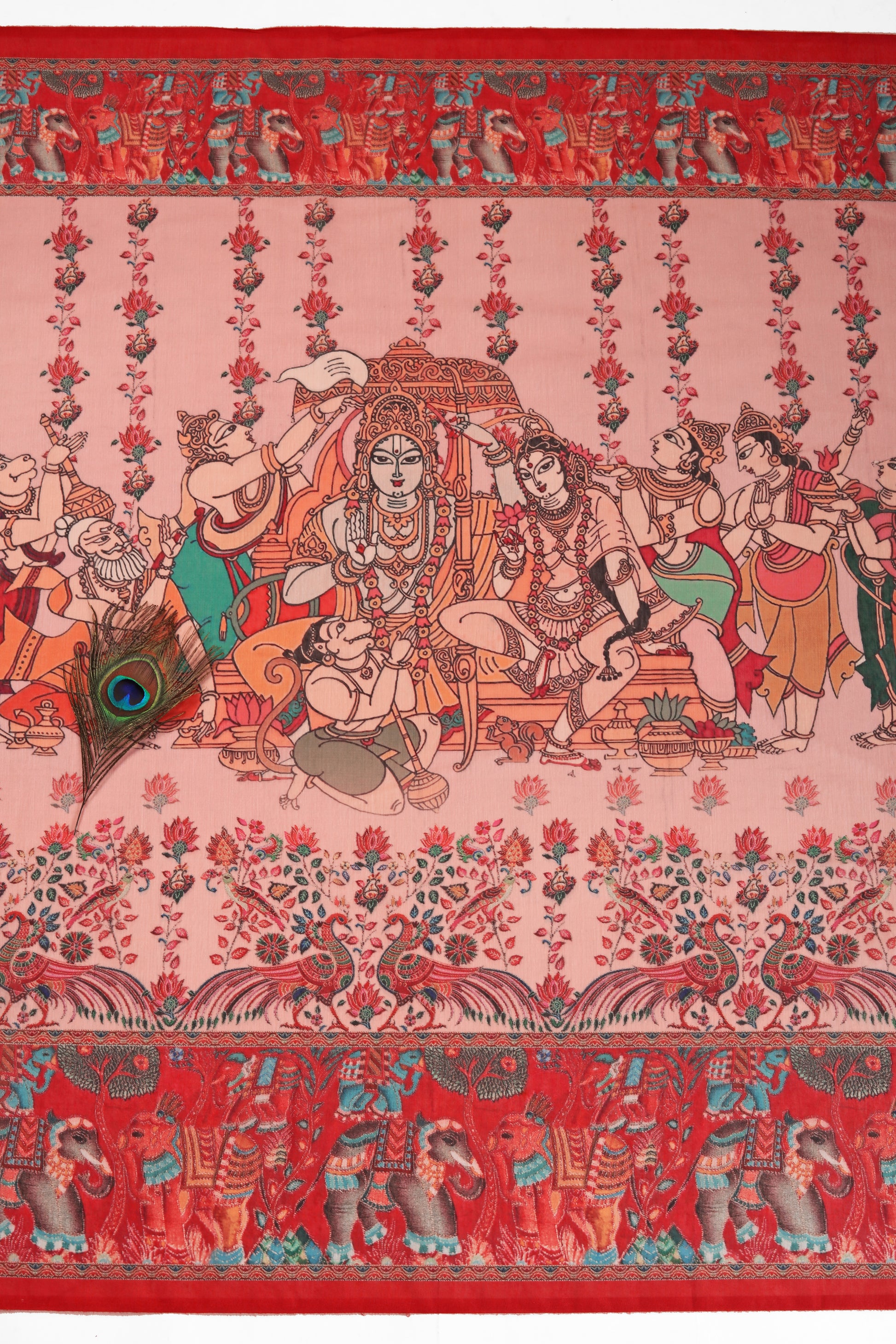 Experience the divine grandeur of Kailash with the Rudra Leela Chanderi Cotton Saree. This masterpiece showcases a stunning depiction of Lord Shiva and Parvati seated on Kailash, surrounded by Nandi, Ganas, and a celestial entourage. The soft blush pink base is framed by bold red borders adorned with elephants, peacocks, and festive processions, creating a perfect balance of grace and power.