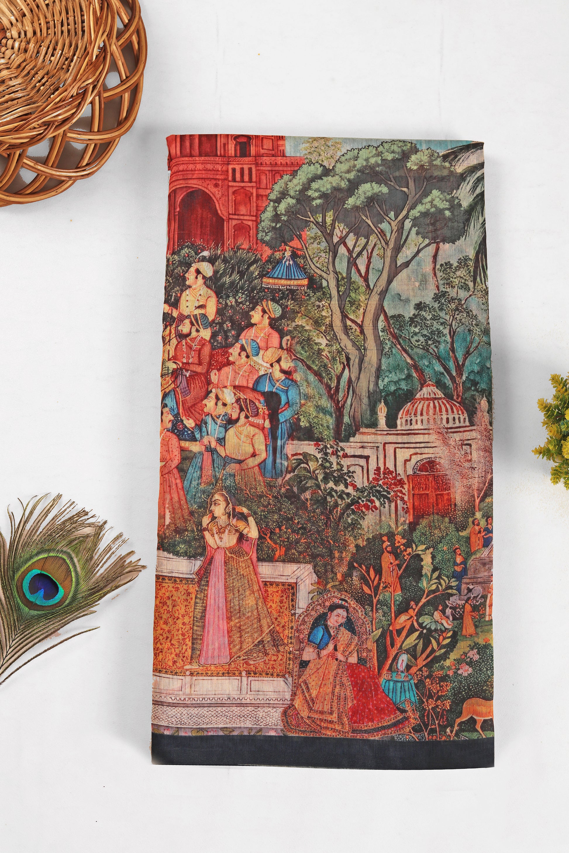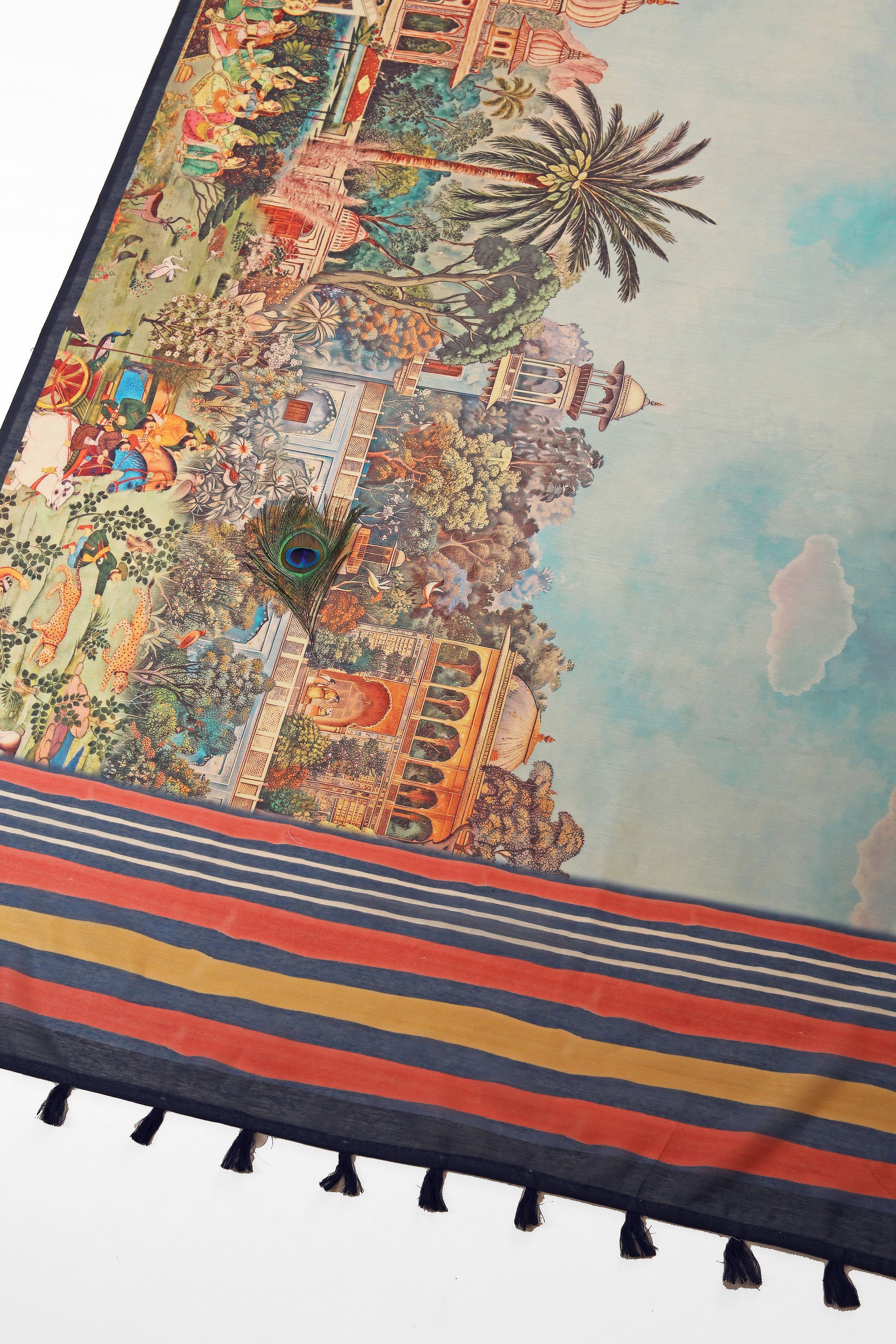 Step into the splendor of royal courts with the Shahi Bagh Chanderi Cotton Saree. This saree is a breathtaking canvas featuring lush palace gardens, domed pavilions, musicians, and wildlife, reminiscent of Mughal miniature paintings. The serene pastel blue sky and detailed greenery make this piece feel like a heritage painting you can drape.