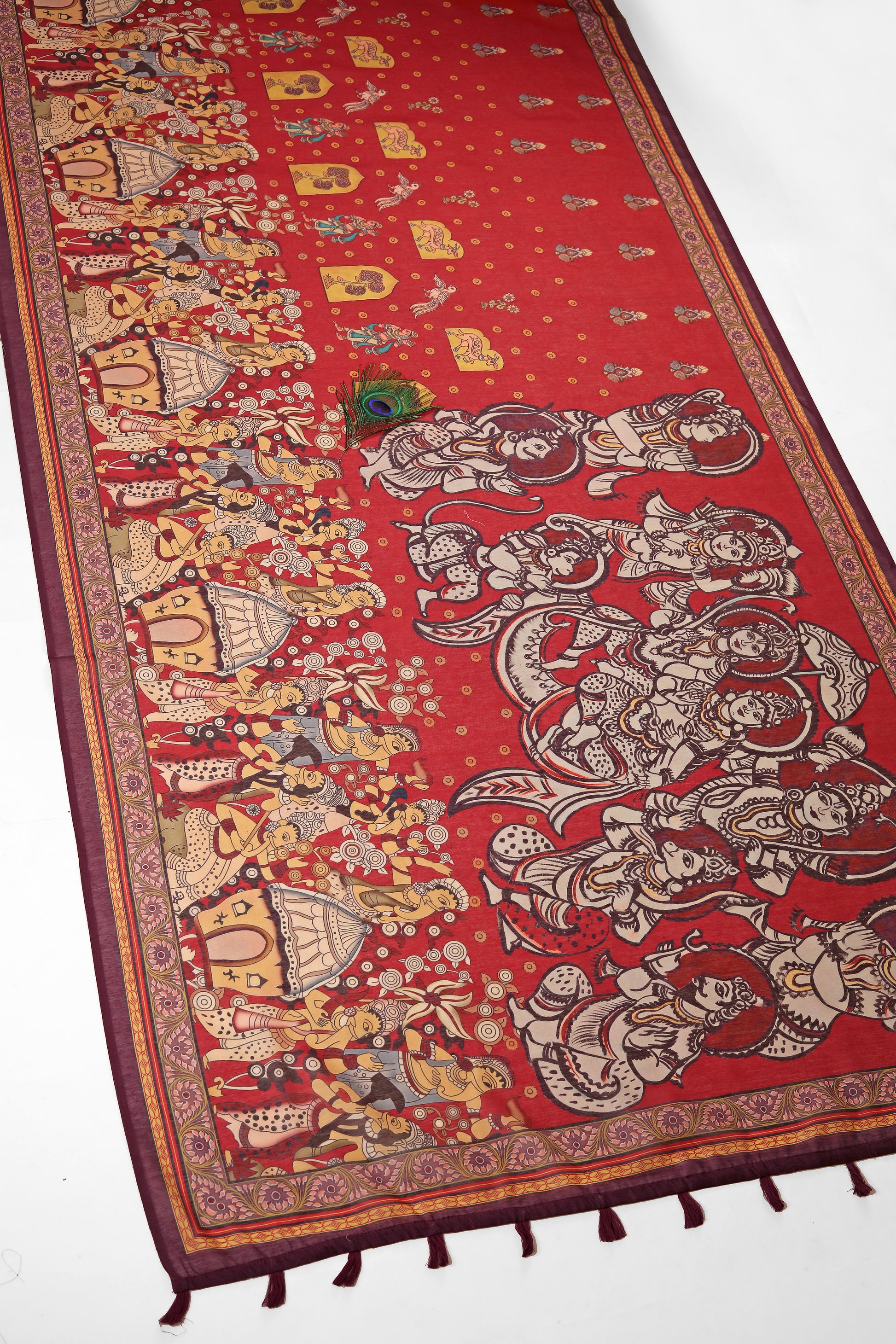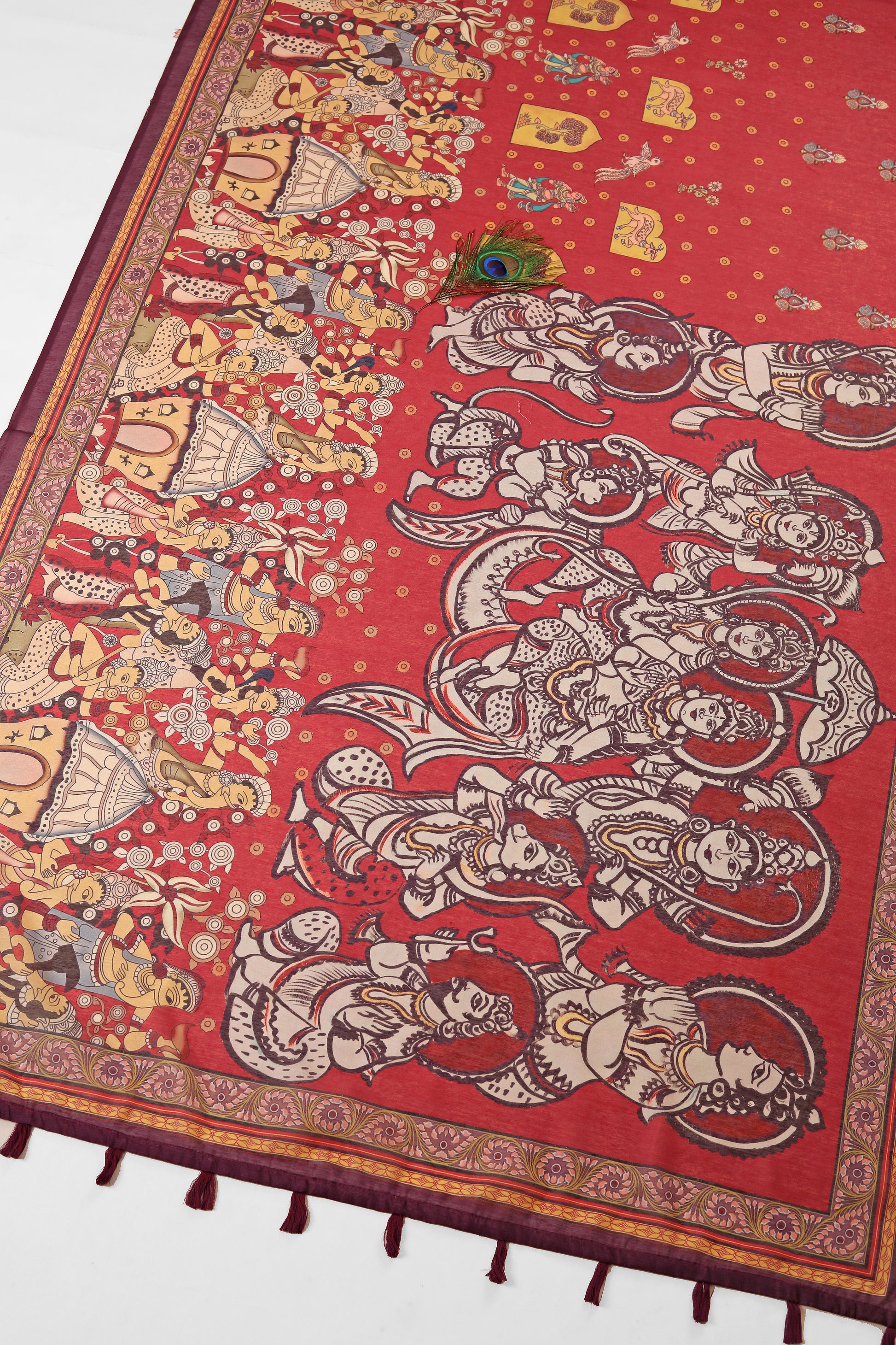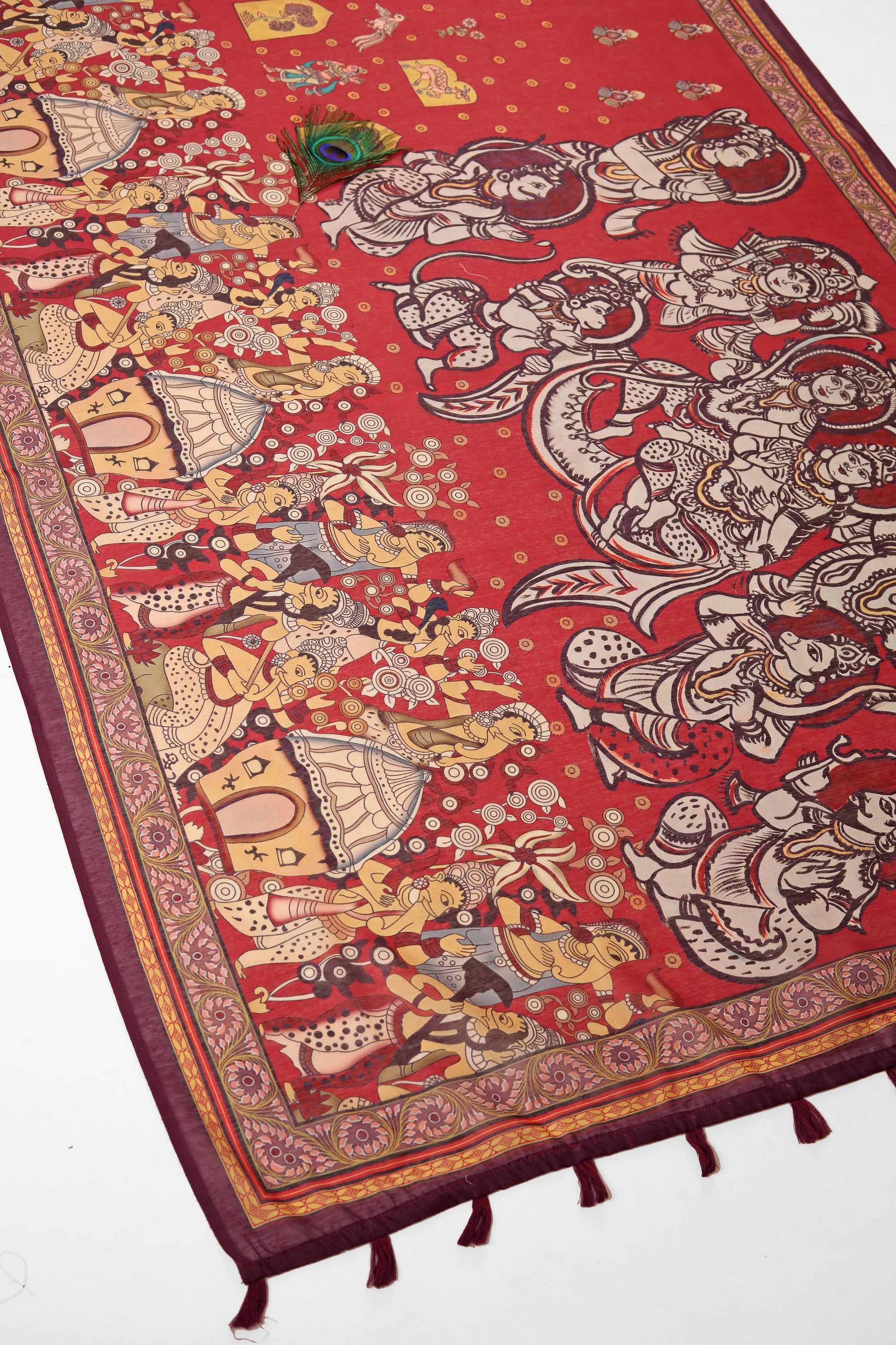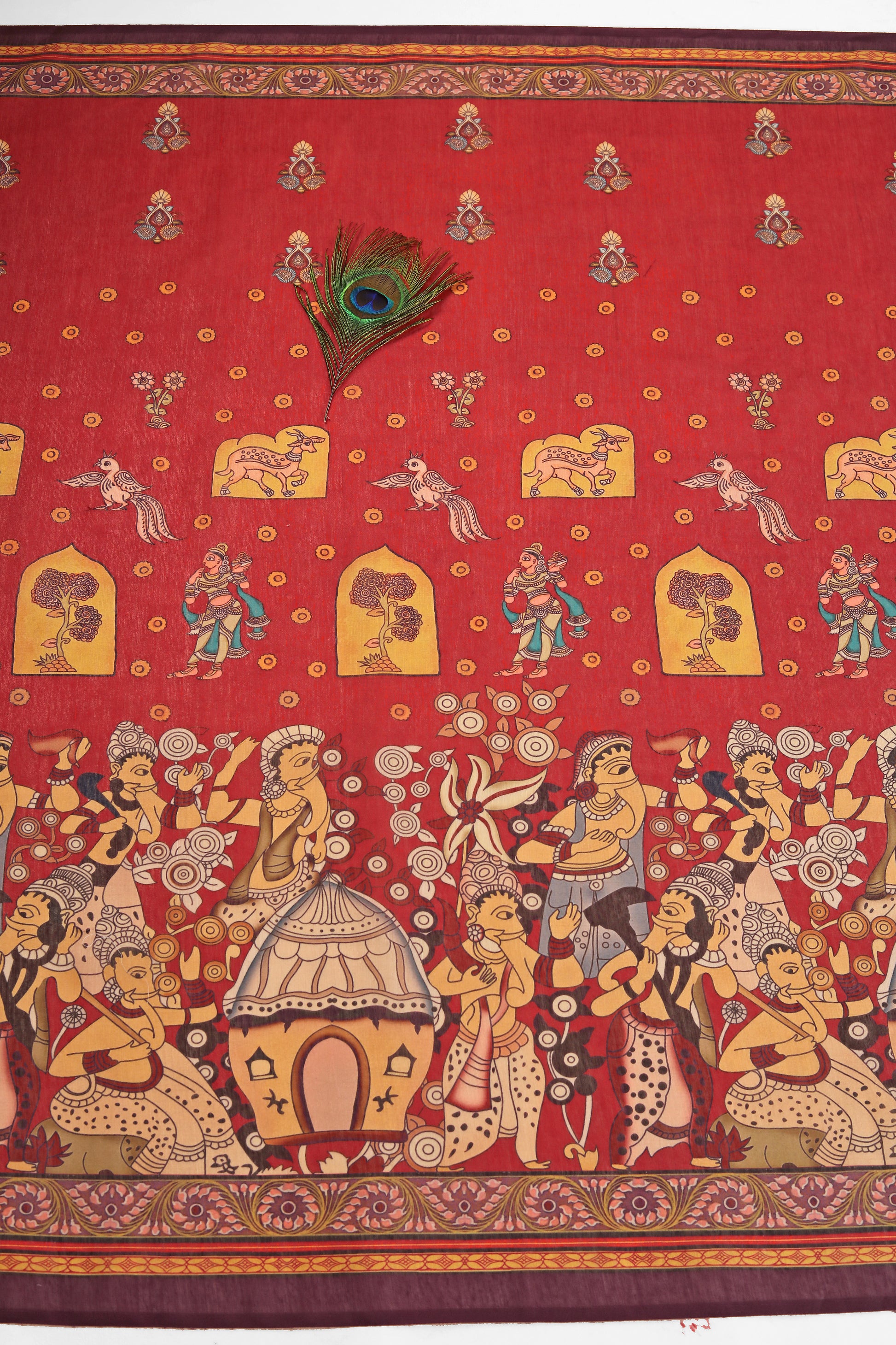 An ode to divine energy and eternal strength, Shakti-Roop celebrates the goddess that lives within every being. The saree glows in sacred vermilion, echoing the fire of creation and the rhythm of celestial processions. Each motif — from the adorned chariots to the dancing deities — becomes a hymn to the feminine force that sustains the universe. Woven in soft Chanderi, Shakti-Roop is more than a drape — it’s a manifestation of grace, power, and devotion in motion.