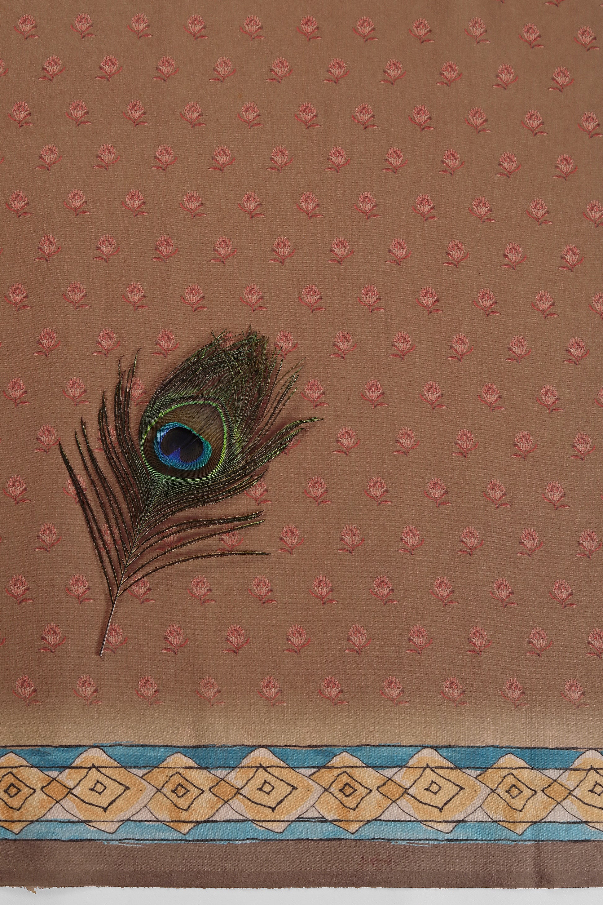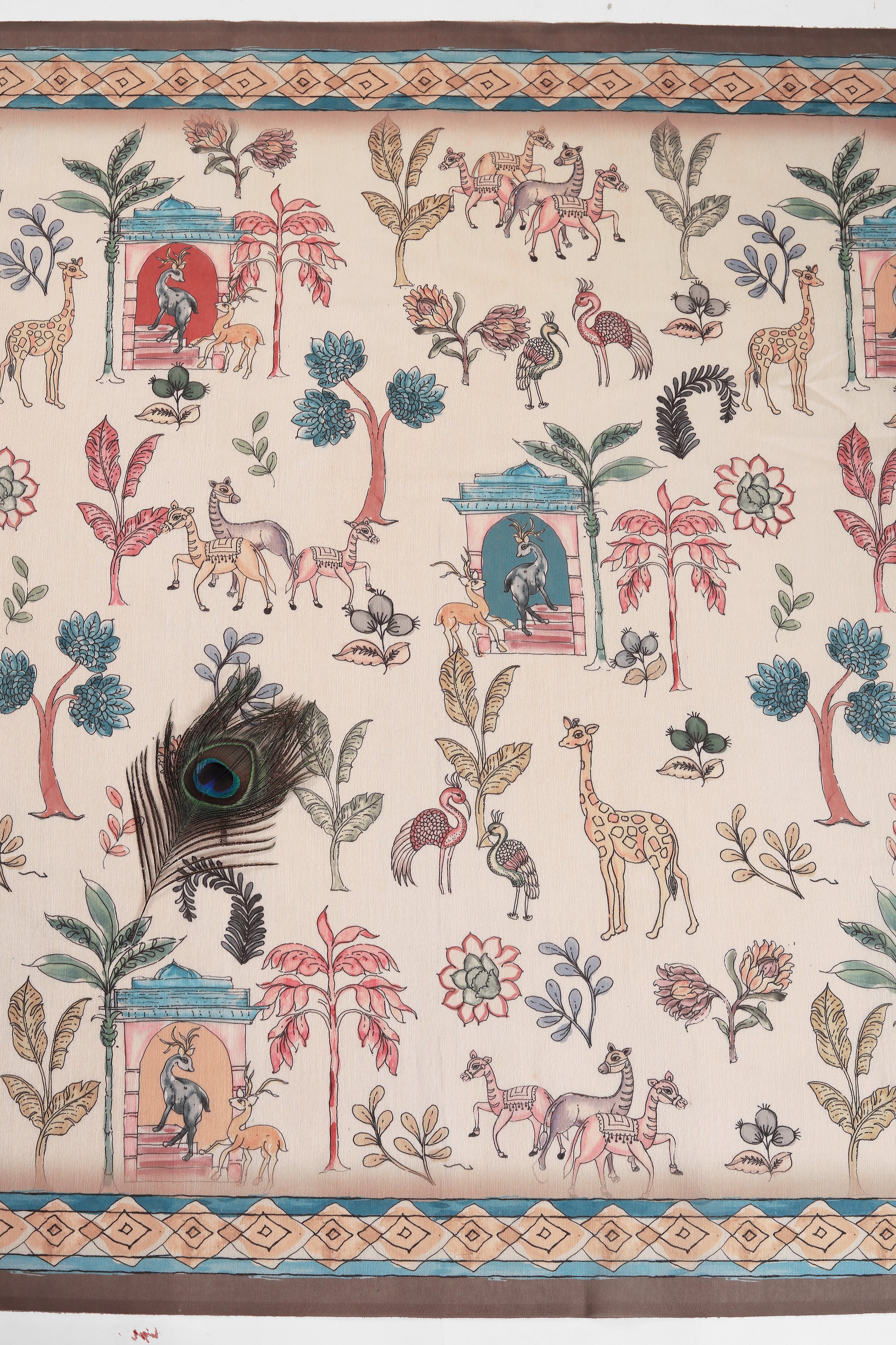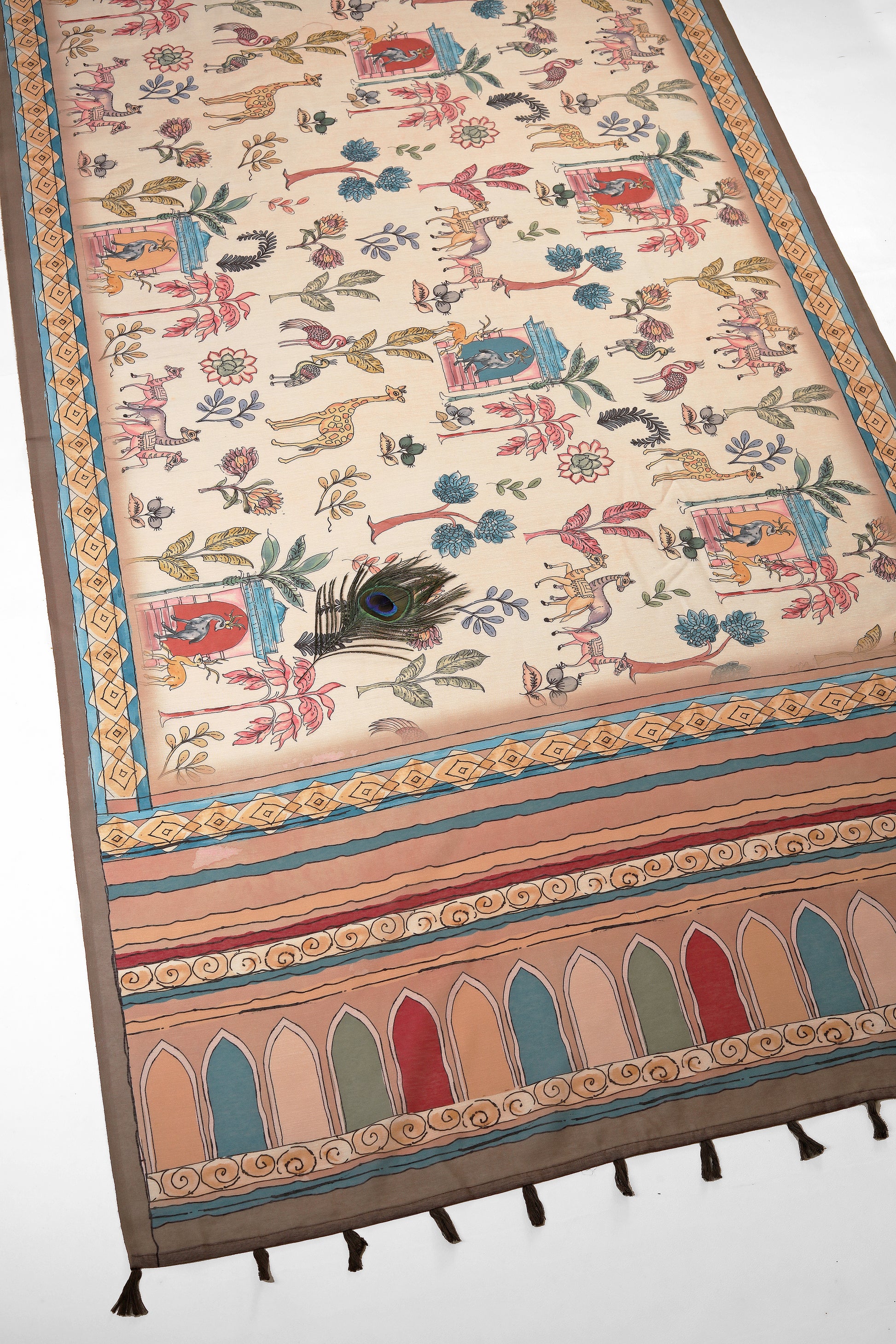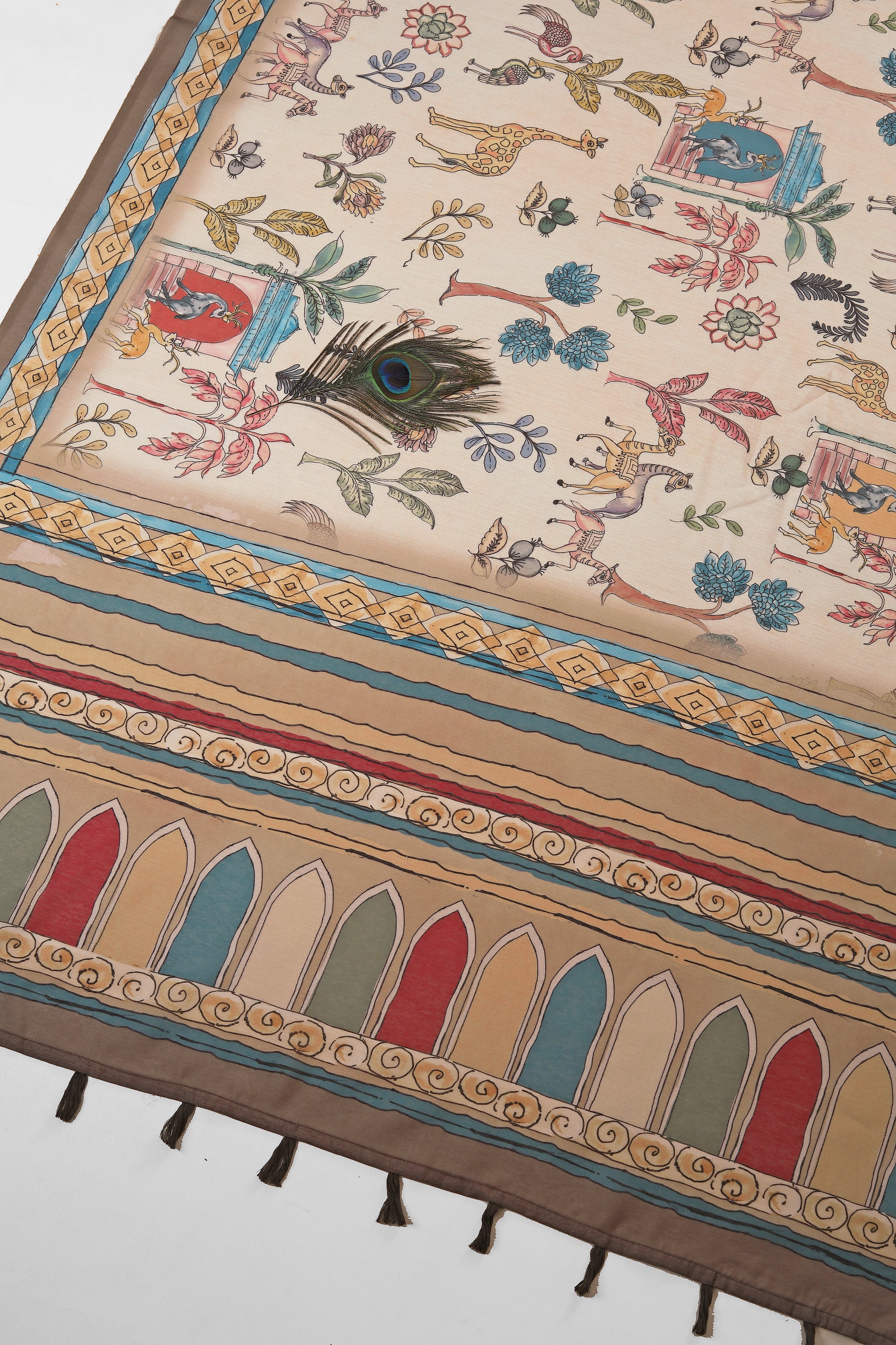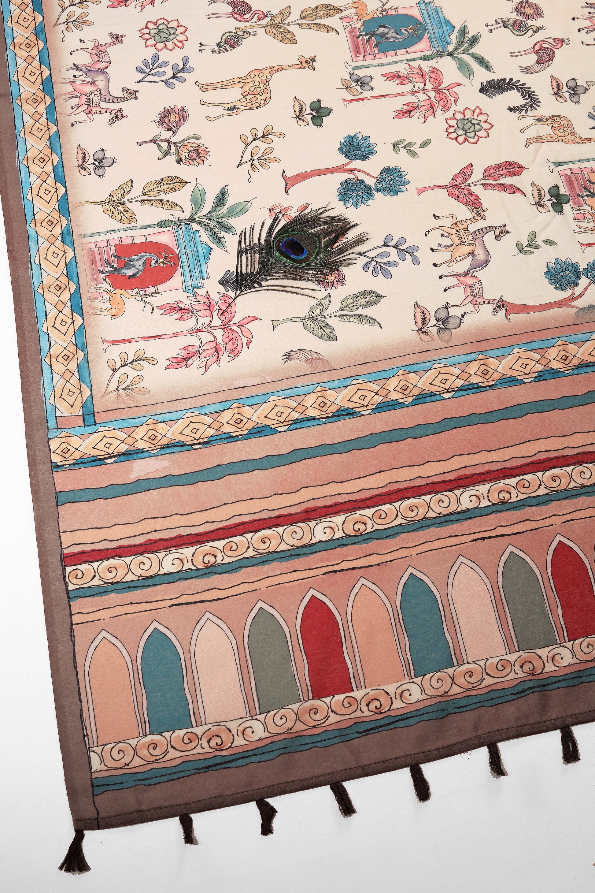 Step into a tranquil world of divine nature with the Shantivan Handloom Cotton Silk Saree – a soft, breathable drape that tells a story in every thread. Crafted in a luxurious handloom cotton silk fabric, this printed saree showcases a whimsical forest scene with deer, giraffes, birds, and temple pavilions nestled among flowering trees. The earthy beige base and folk-style border evoke a sense of calm and sacred serenity.