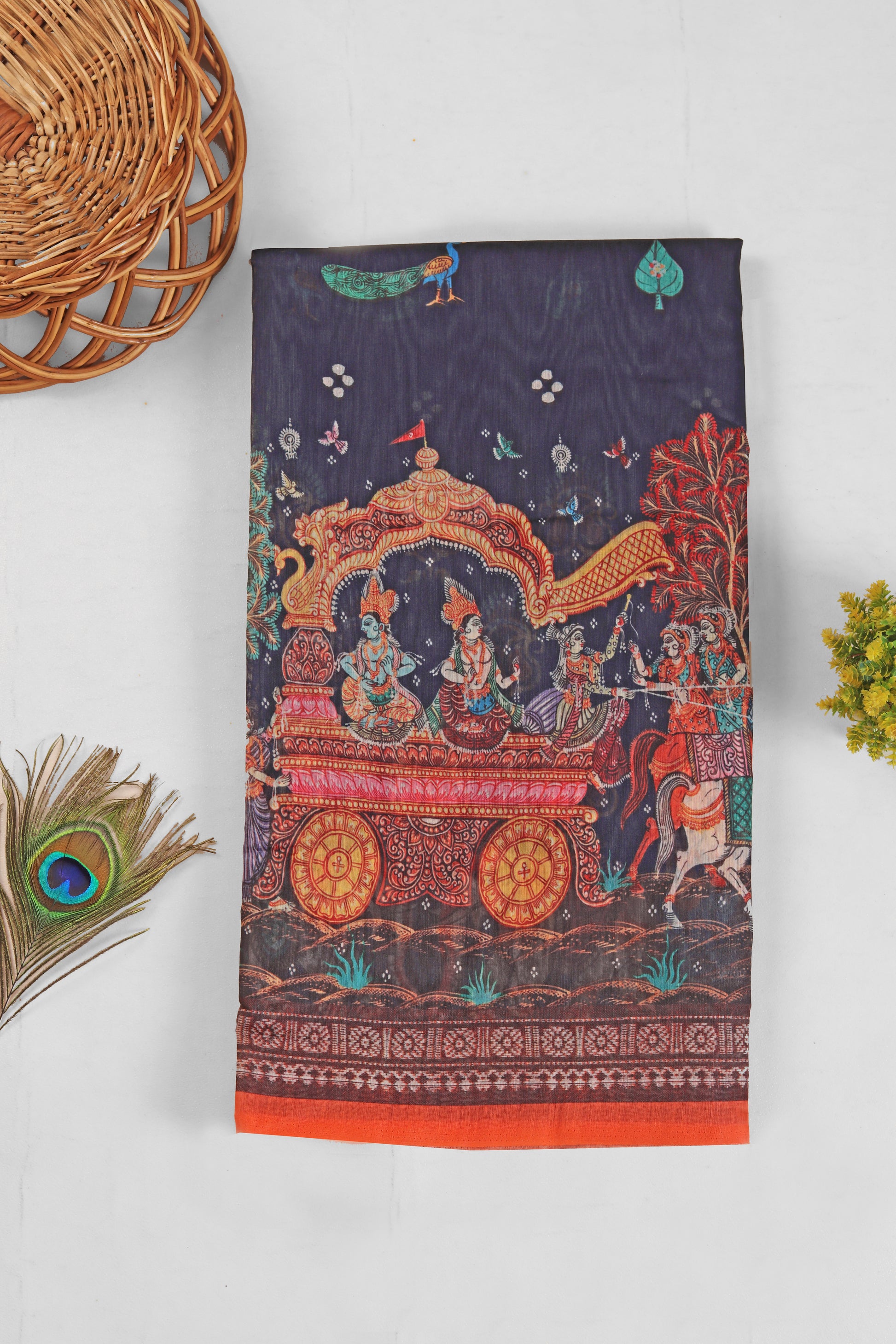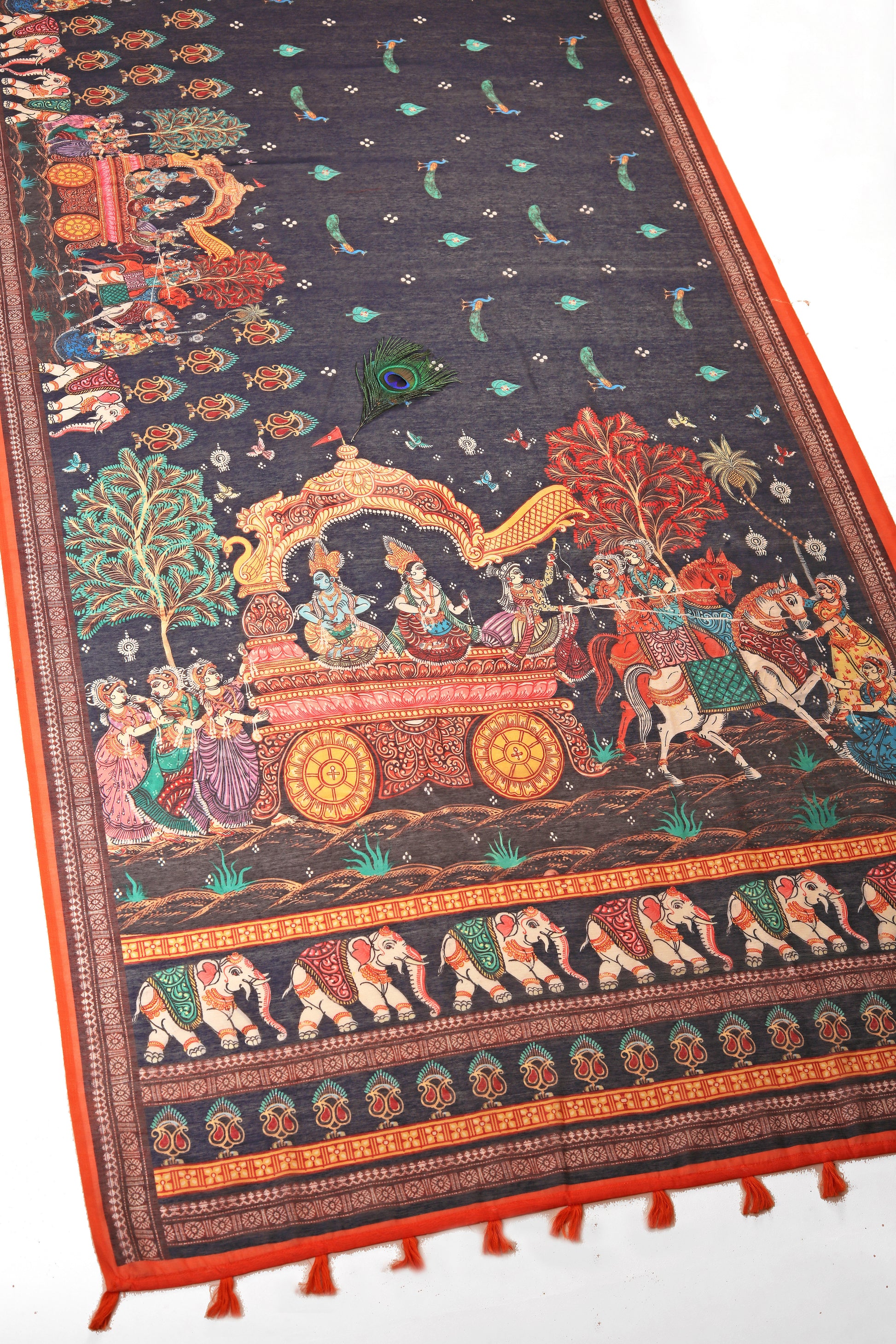 Celebrate the timeless wisdom of the Mahabharata with the Shubha Ratha Chanderi Cotton Saree. This stunning saree features a dramatic depiction of Krishna and Arjuna on the divine chariot, surrounded by attendants and temple motifs, capturing the spirit of the Bhagavad Gita.