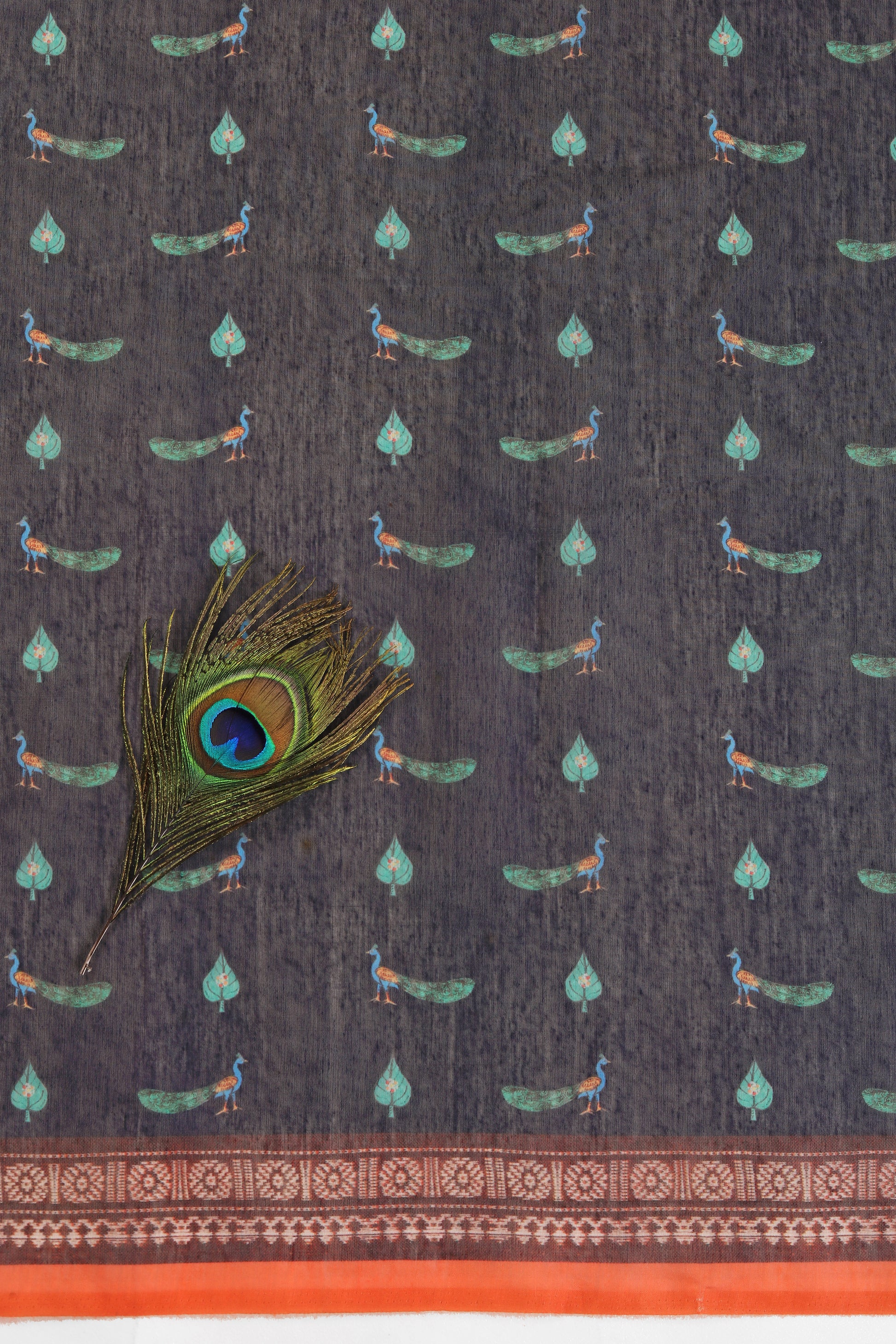 The deep charcoal-black base with scattered peacock butis and vibrant red-orange borders creates a bold and regal drape. Crafted on airy Chanderi cotton, this printed storytelling saree is perfect for Gita Jayanti celebrations, festive events, and spiritual gatherings. Pair with antique silver or gold temple jewelry to complete the warrior-goddess look.