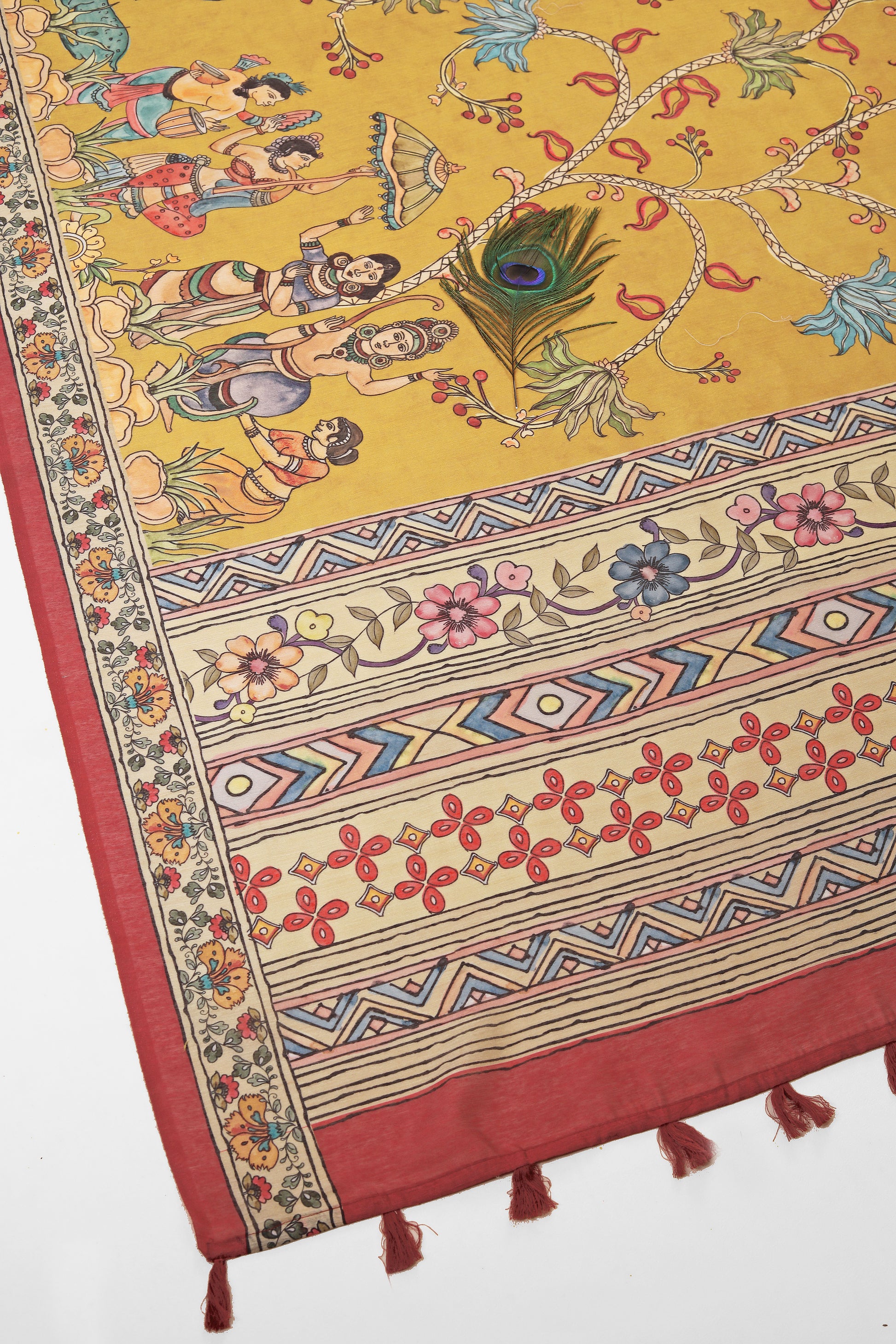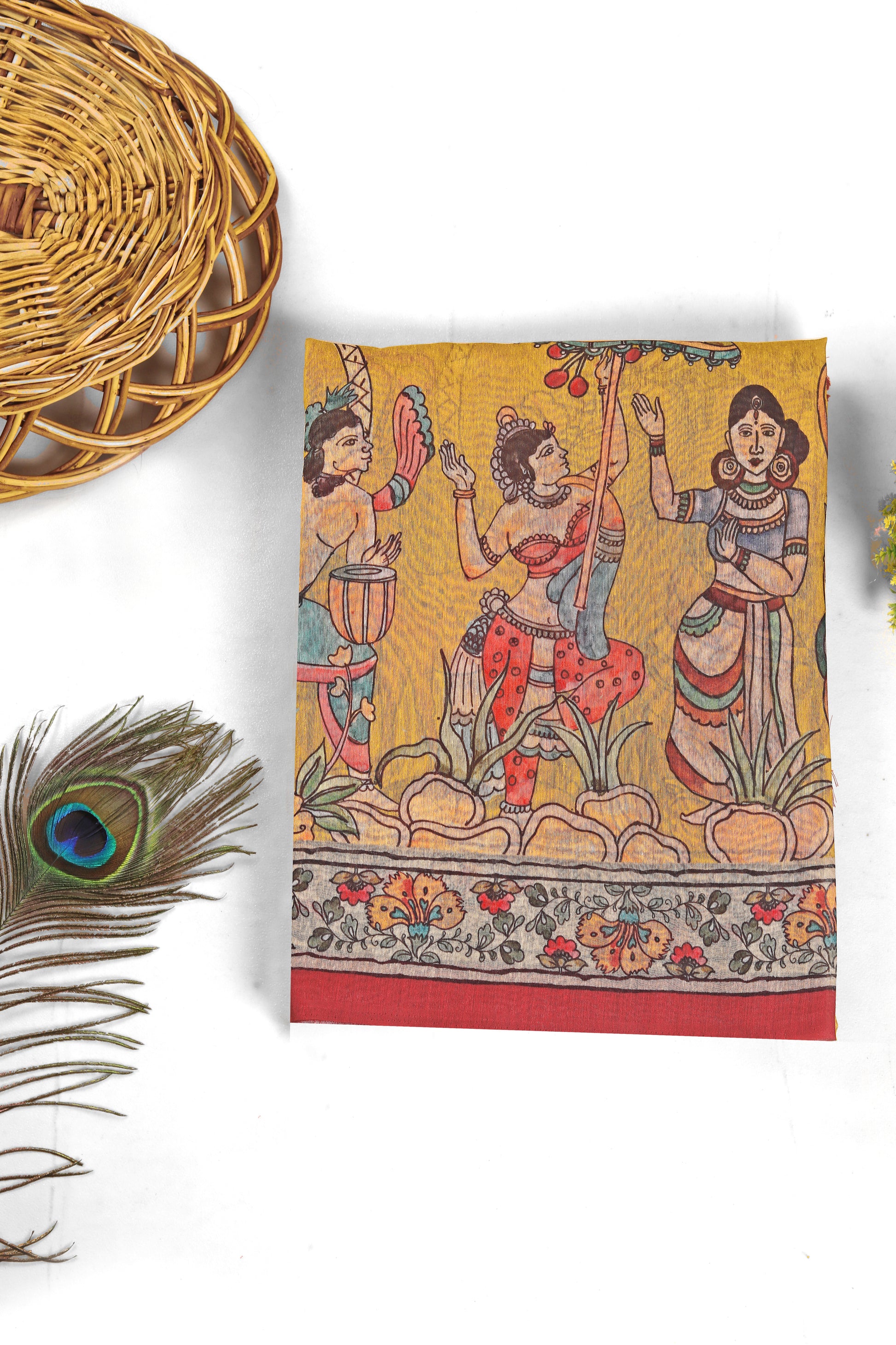 Step into the serenity of spring with our Vasantika Handloom Cotton Silk Saree — a tribute to blossoming life, joyful rhythms, and divine femininity. Printed on soft handloom cotton silk, this saree features intricate scenes of celestial musicians, blooming vines, and delicate floral borders in vibrant reds, yellows, and sky blues. Lightweight, breathable, and full of grace, Vasantika drapes like a song — perfect for festive mornings, temple visits, or soul-soothing evenings with loved ones. This printed saree is a celebration you can wear — steeped in tradition, yet crafted for today.