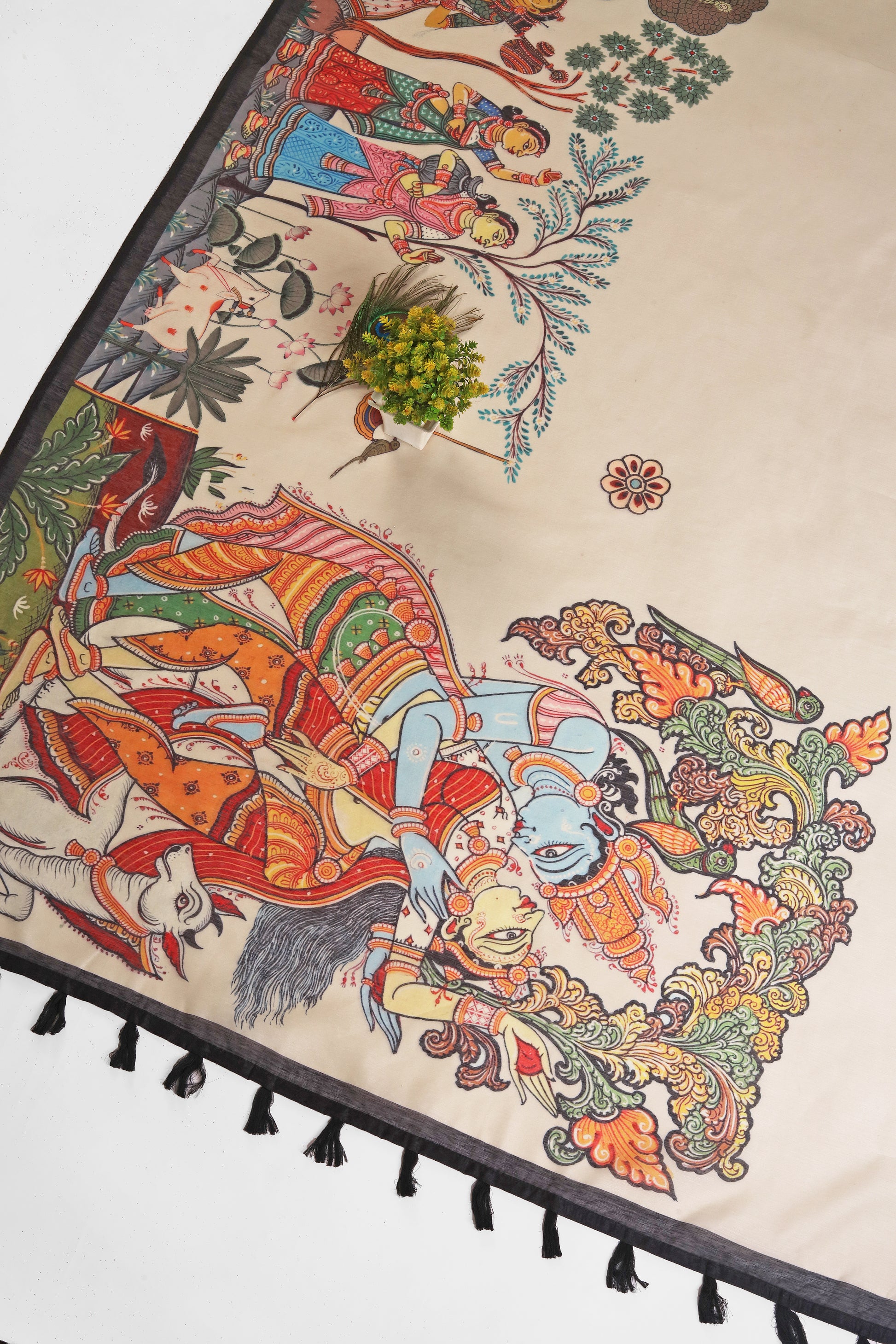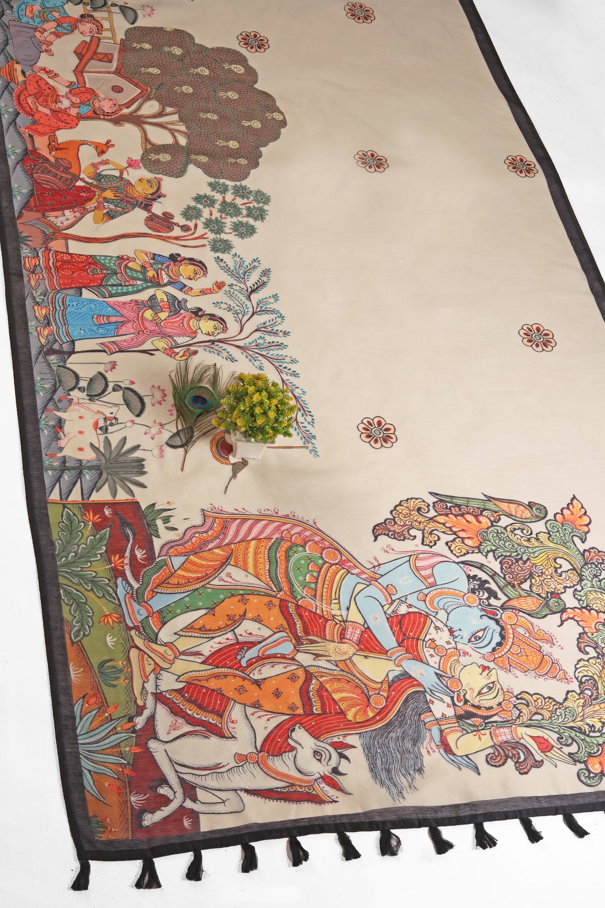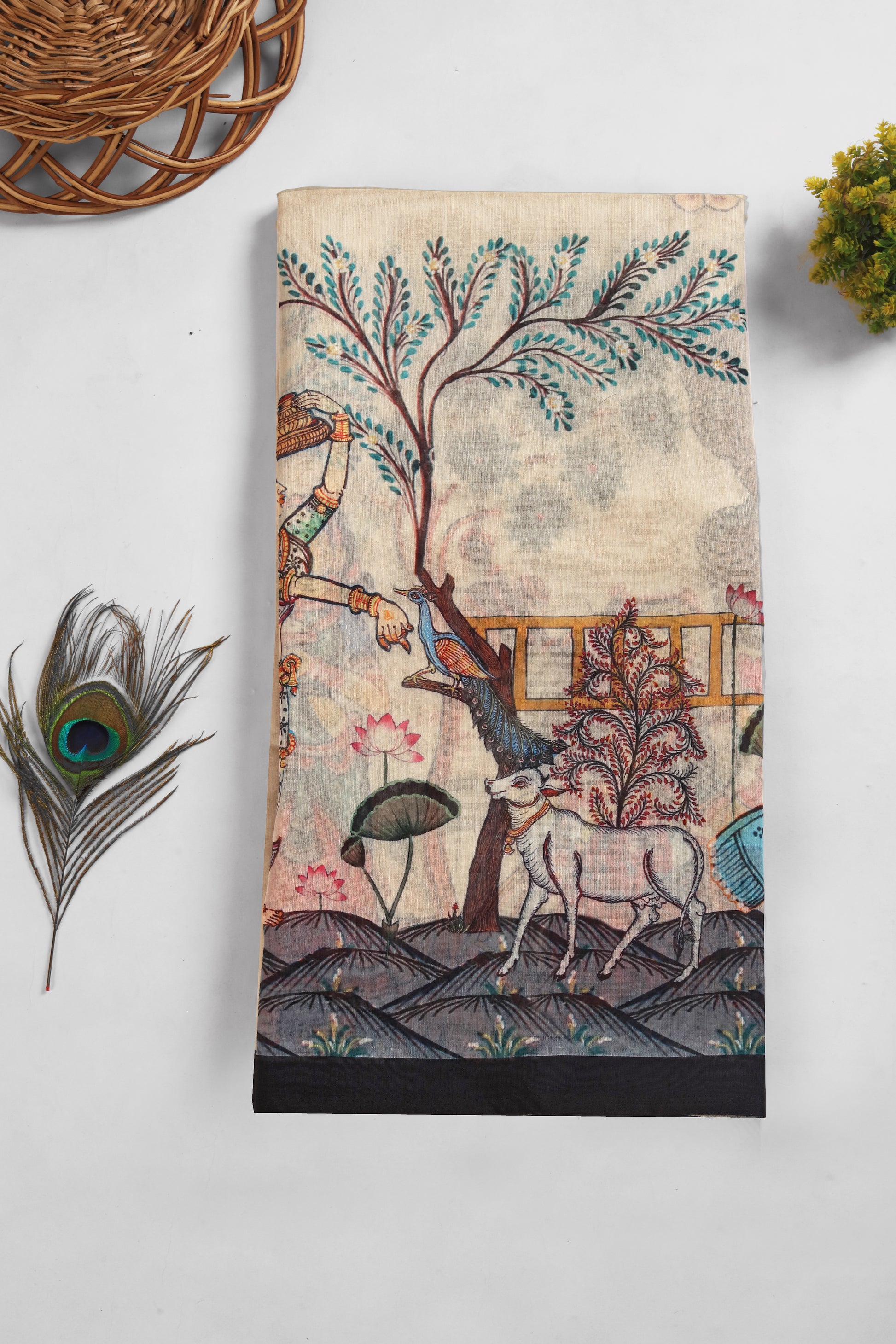 Vrindavan Vaas is a Kalamkari designer saree that captures the divine romance of Radha and Krishna in the lush gardens of Vrindavan. The print features an intricate jhoola scene with gopis, cows, and blooming kadamba trees — rendered in the narrative folk-art style of Kalamkari. Crafted on soft Chanderi cotton, it’s a poetic celebration of devotion, heritage, and graceful storytelling.