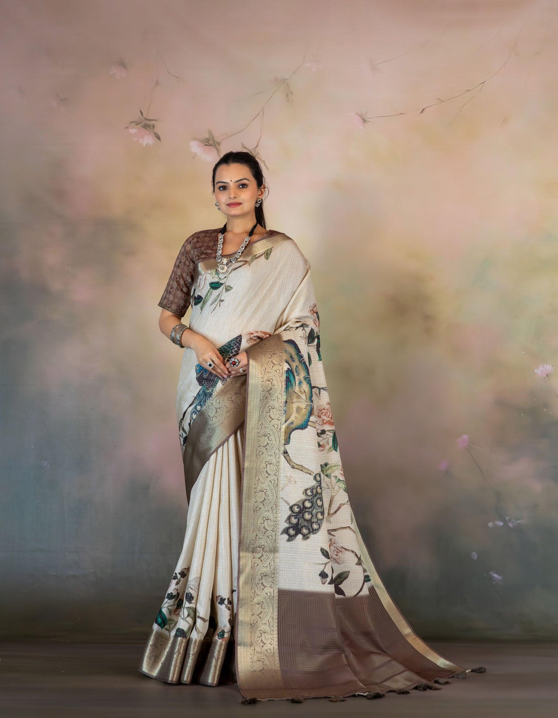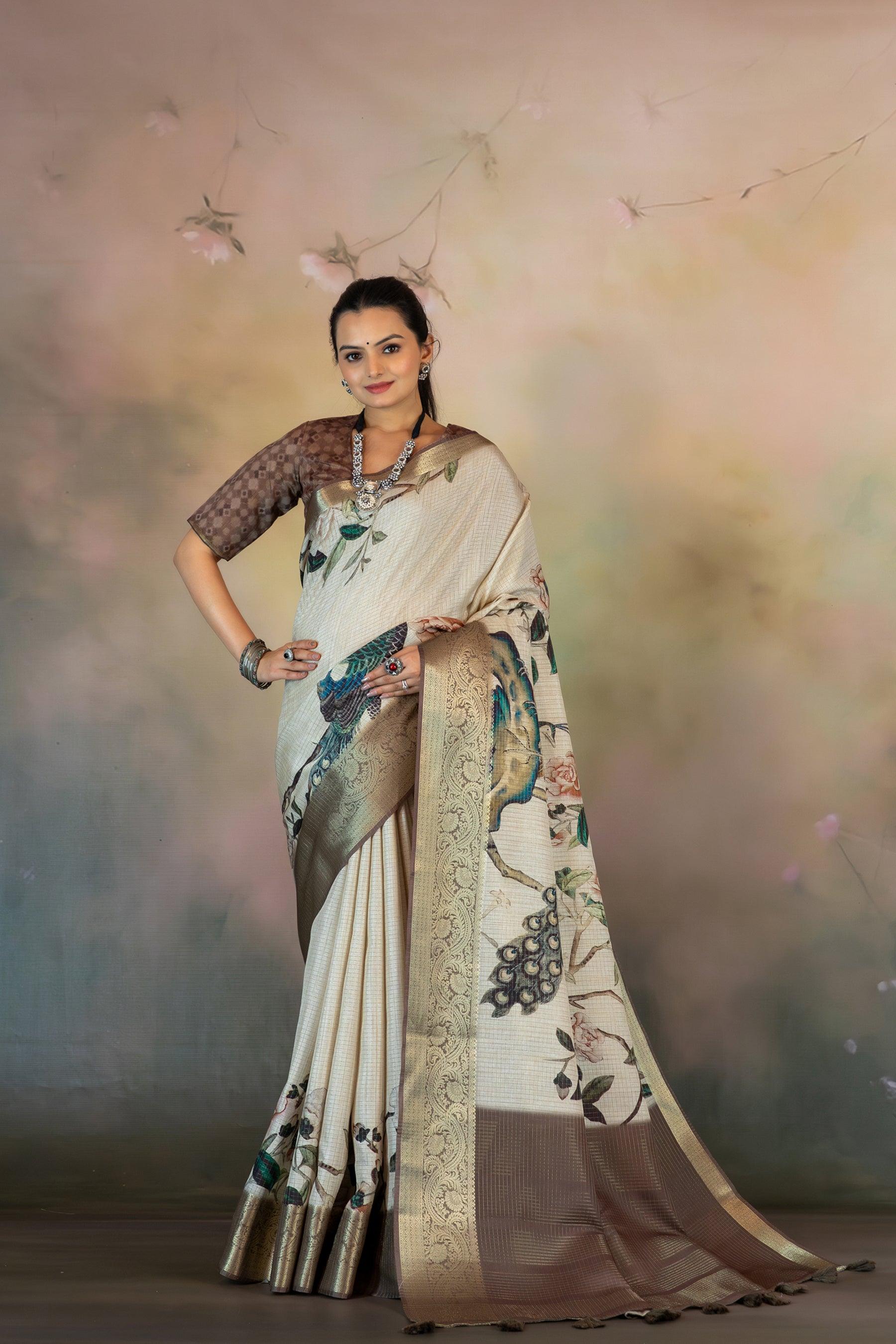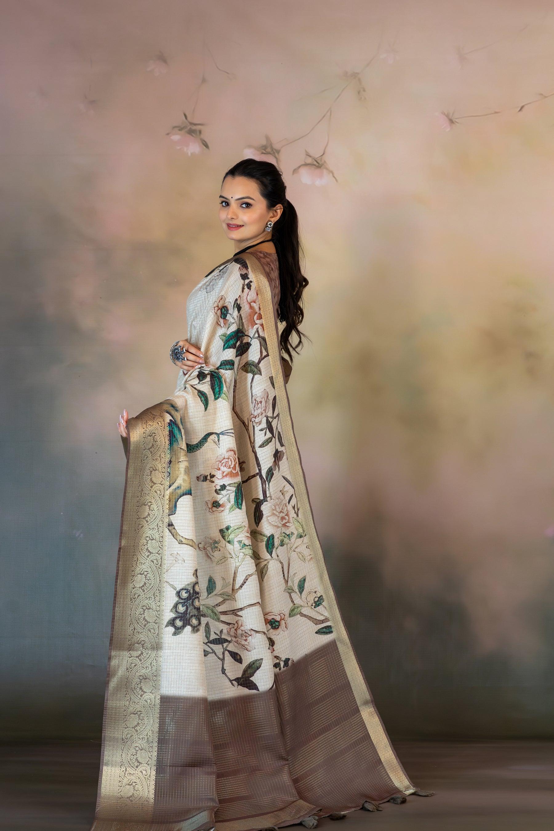 Step into timeless elegance with our printed tussar silk jacquard saree. Each intricately woven design exudes sophistication, while the luxurious silk fabric offers unmatched comfort, complemented by flawless prints.. Perfect for weddings, parties, or cultural events, this saree seamlessly blends traditional charm with contemporary style. Embrace the rich heritage of Indian craftsmanship as you drape yourself in this exquisite piece. Make a statement and turn heads wherever you go, exuding grace and confidence in every step.