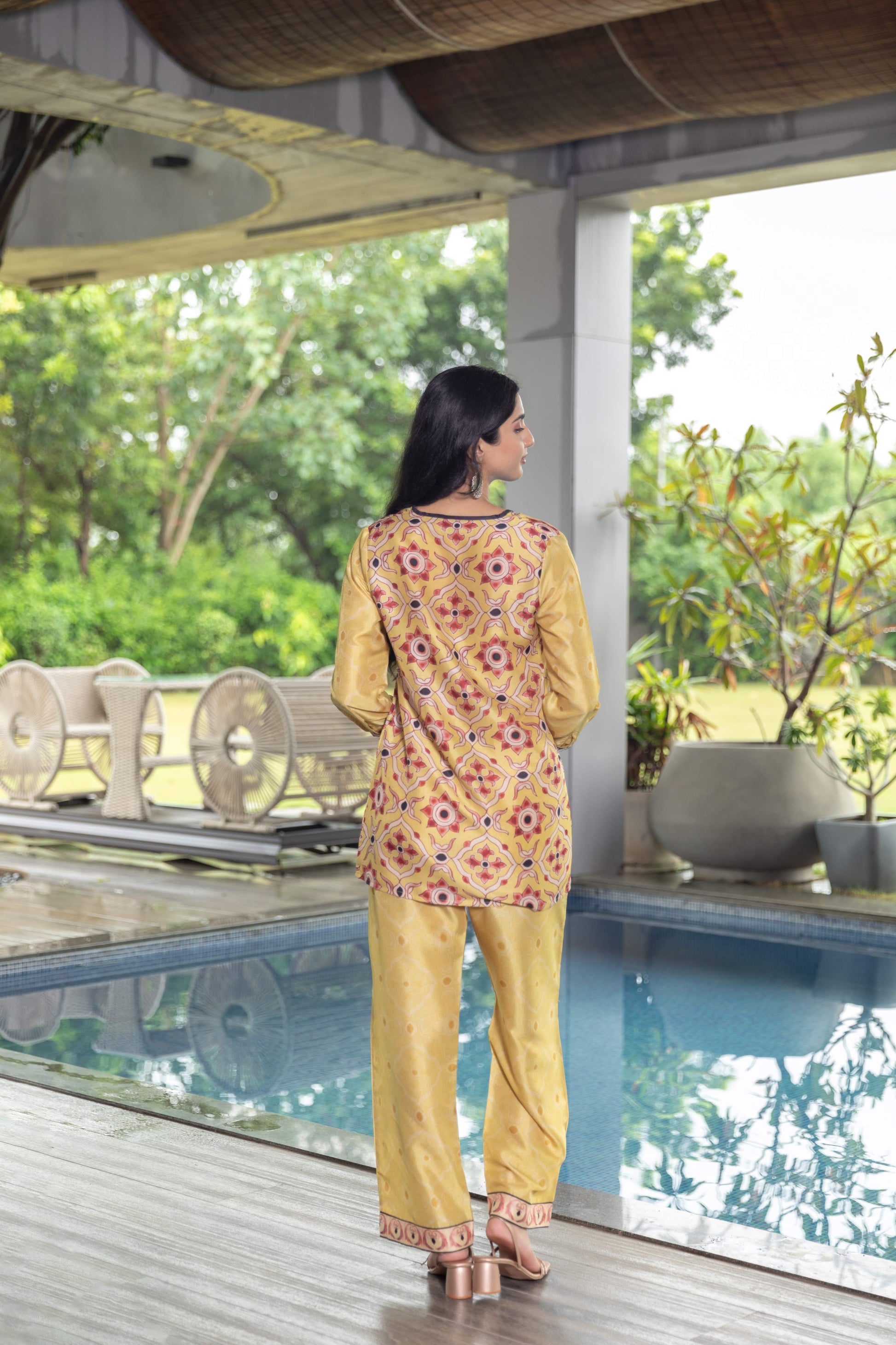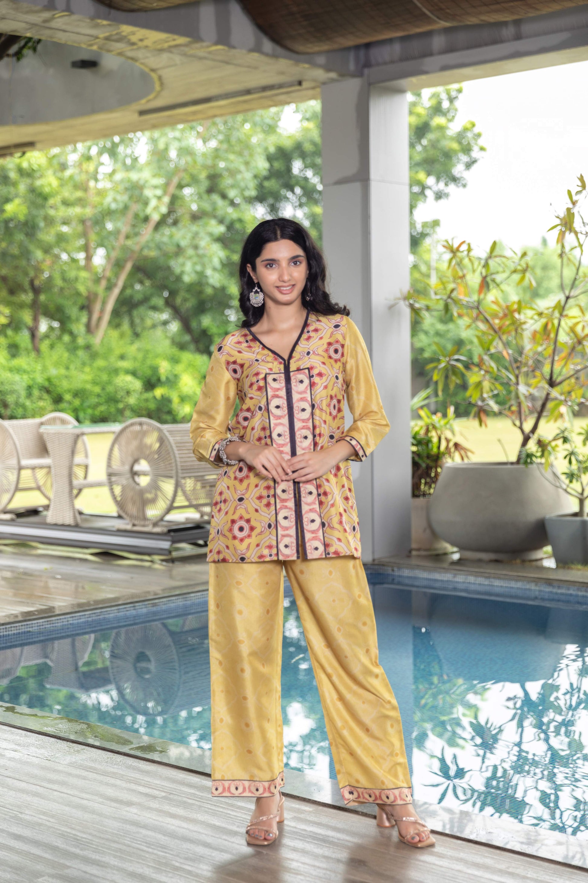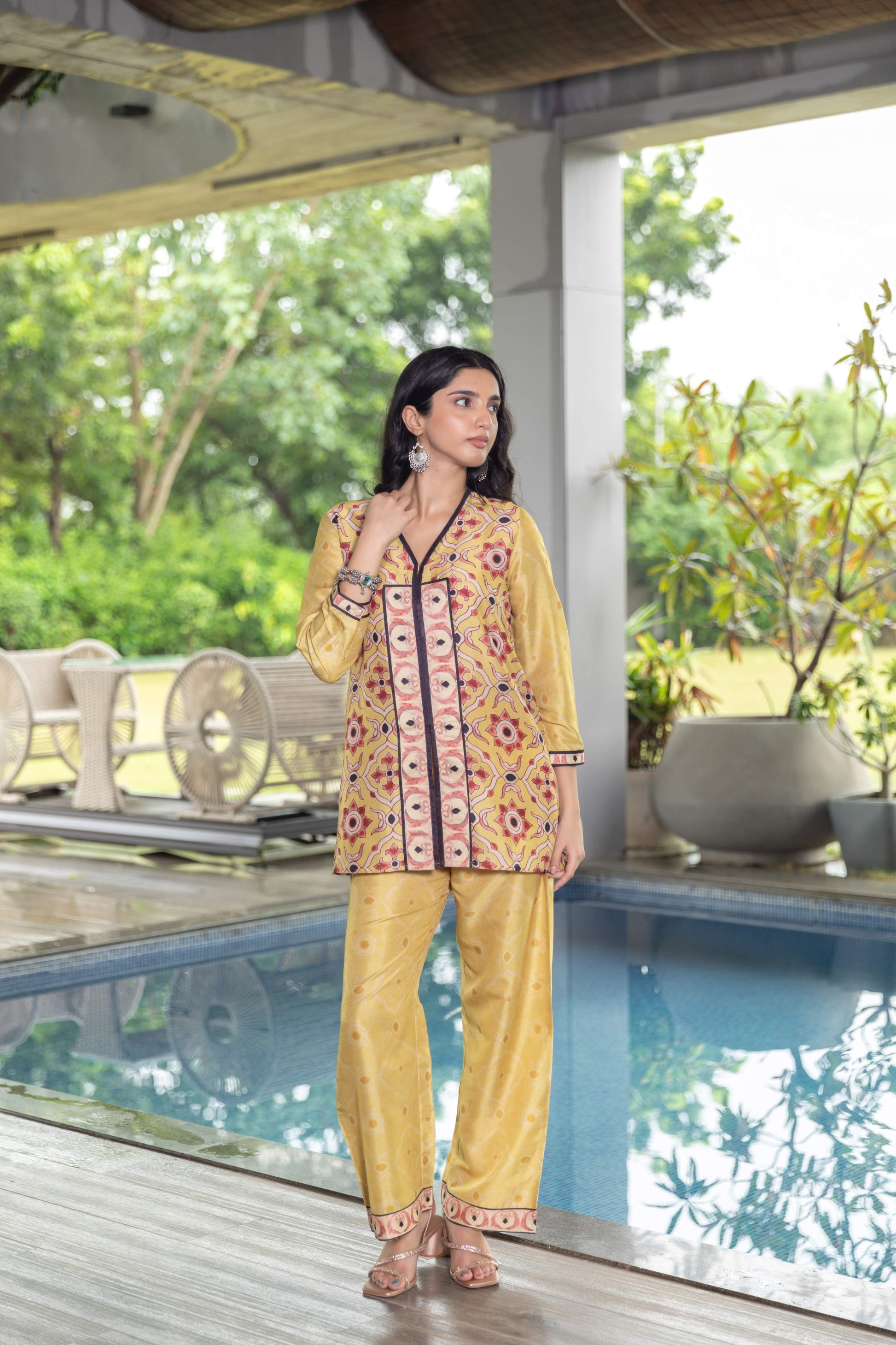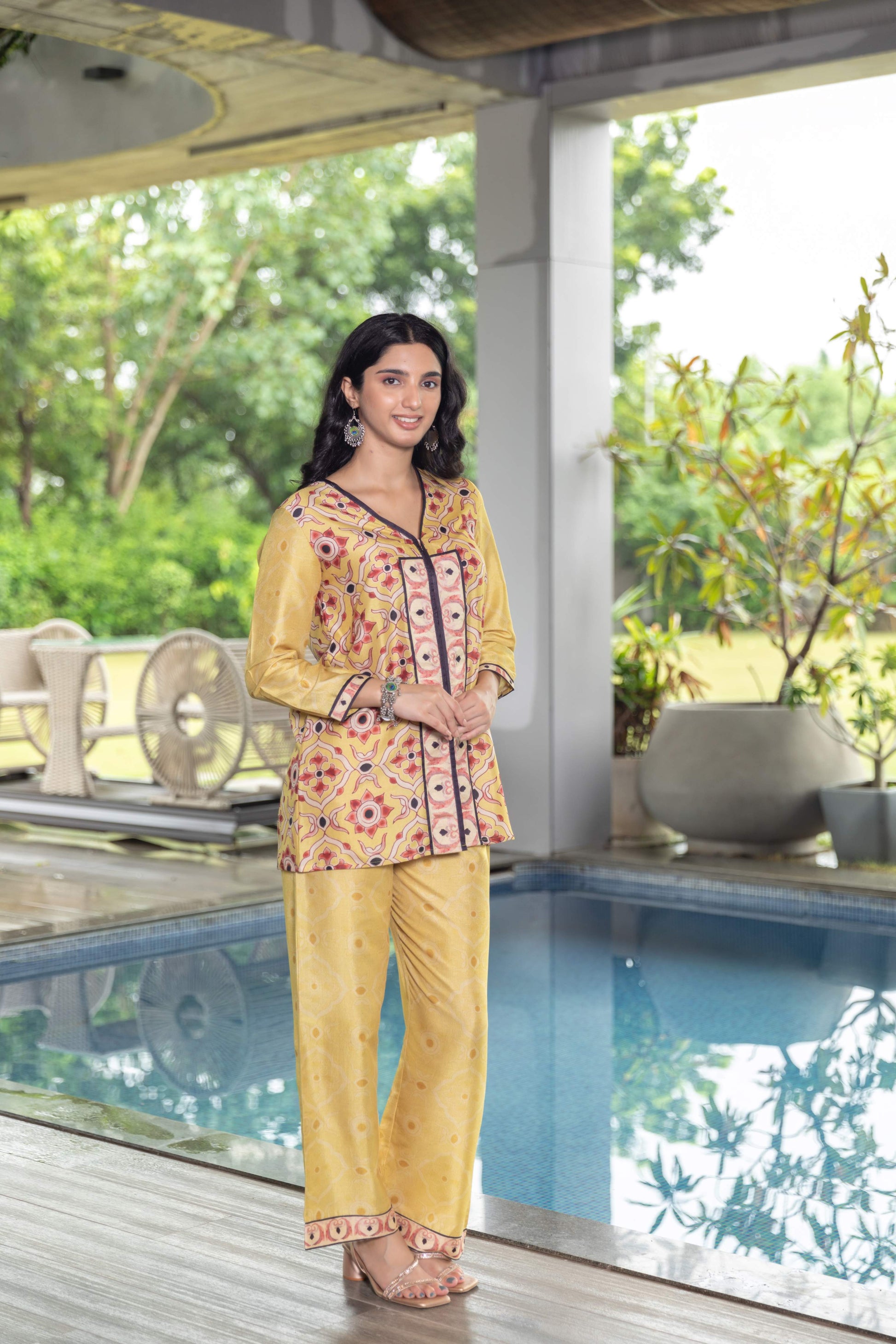 • V-neck top detailed with intricate borders and piping paired with coordinated matching pant.