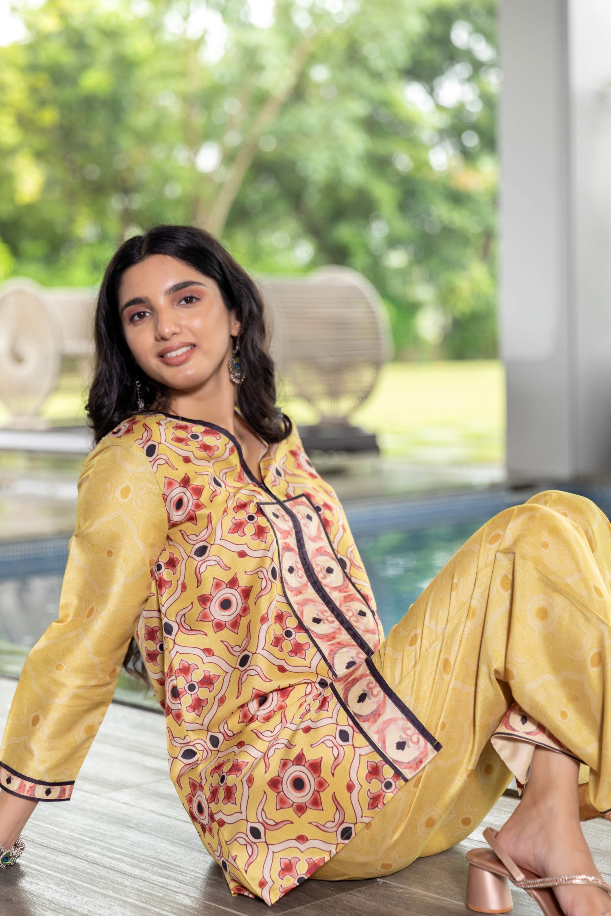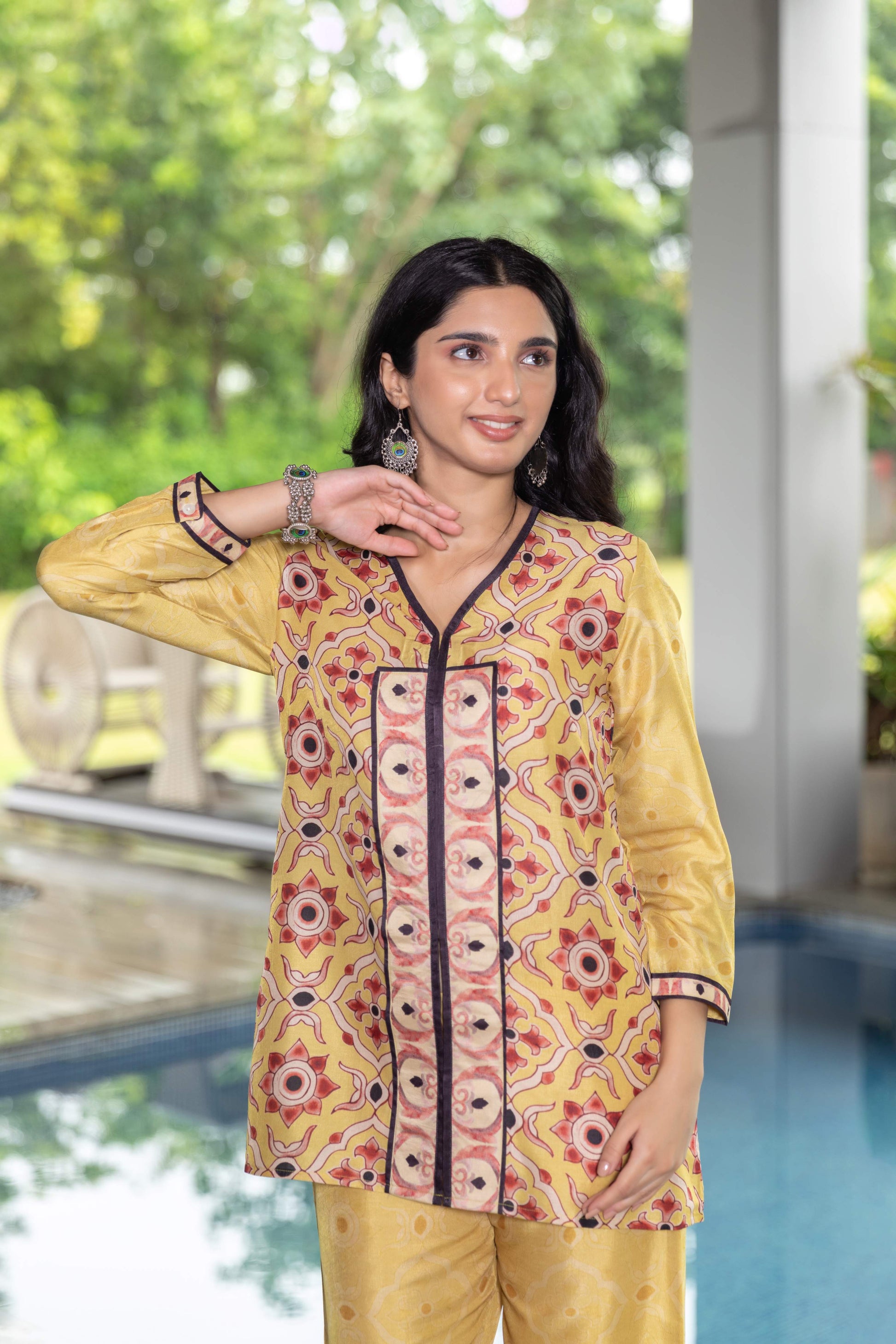 • Geometrical print in shades of Yellow & Orange with matching borders. Relaxed and flowy fit.