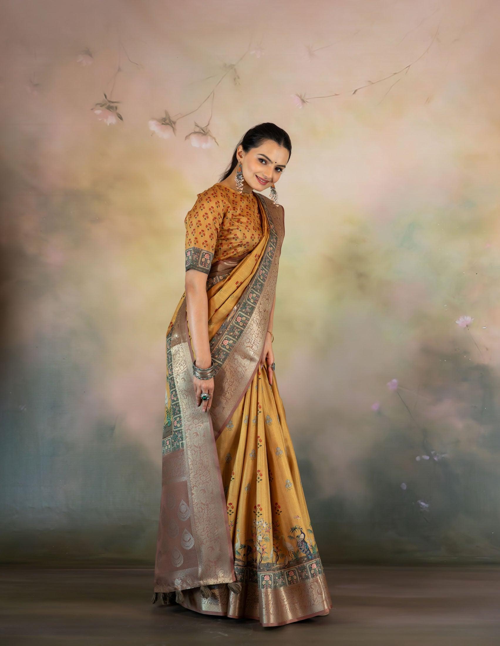 Step into timeless elegance with our printed tussar silk jacquard saree. Each intricately woven design exudes sophistication, while the luxurious silk fabric offers unmatched comfort, complemented by flawless prints.. Perfect for weddings, parties, or cultural events, this saree seamlessly blends traditional charm with contemporary style. Embrace the rich heritage of Indian craftsmanship as you drape yourself in this exquisite piece. Make a statement and turn heads wherever you go, exuding grace and confidence in every step.